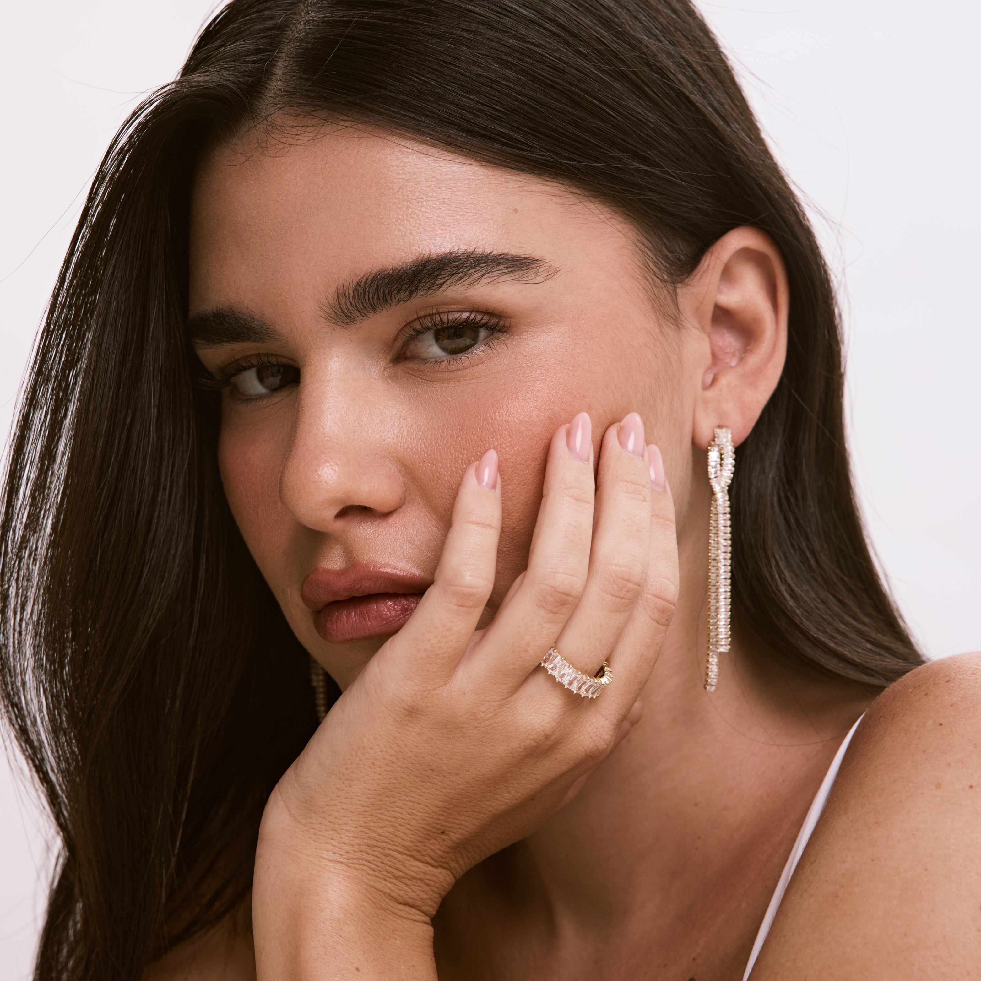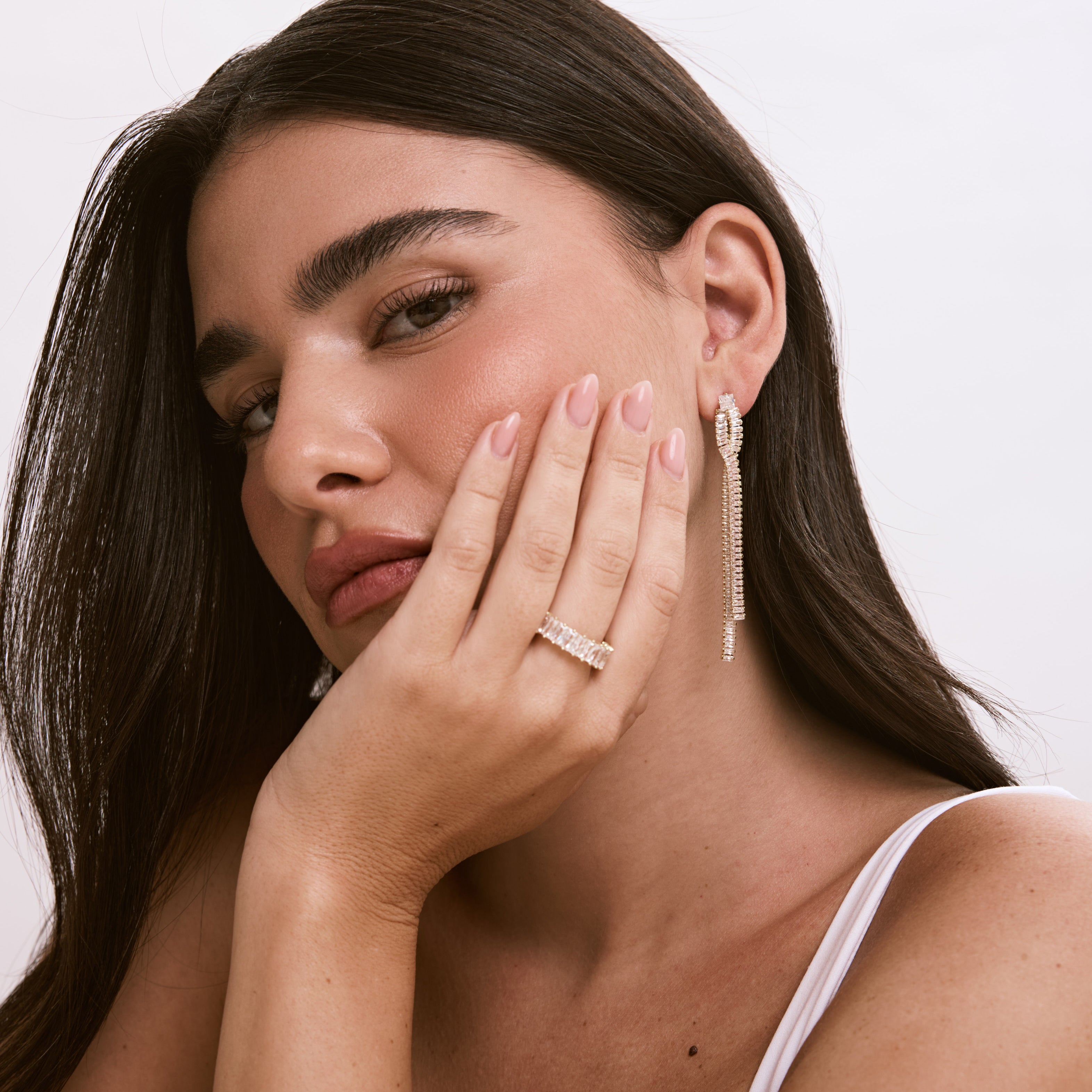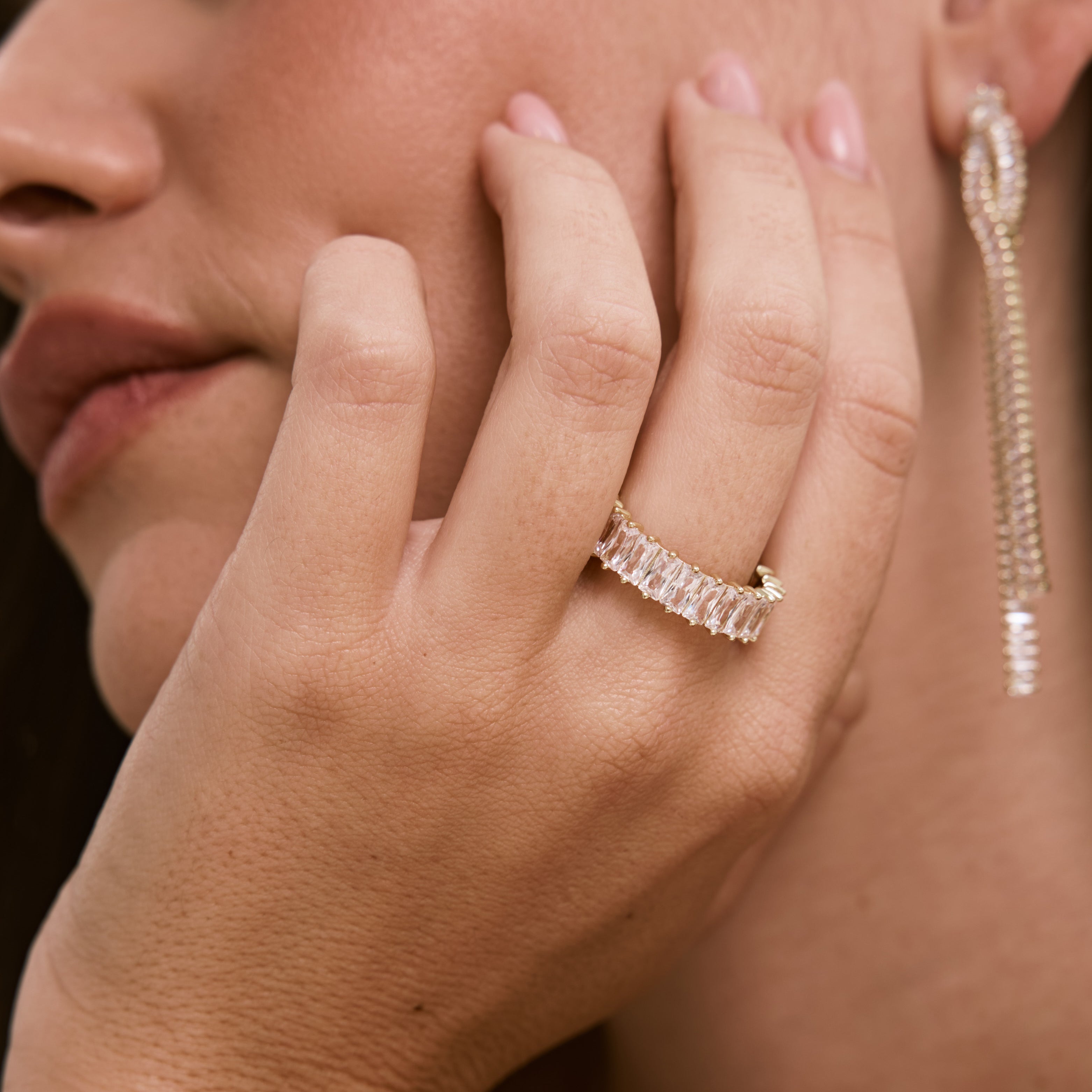 טבעת יוקרתית משובצת כולה בזירקונים מלבניים מרהיבים, ללוק עשיר ובלתי נשכח. הטבעת עשויה בעבודת יד ומצופה ברודיום.
