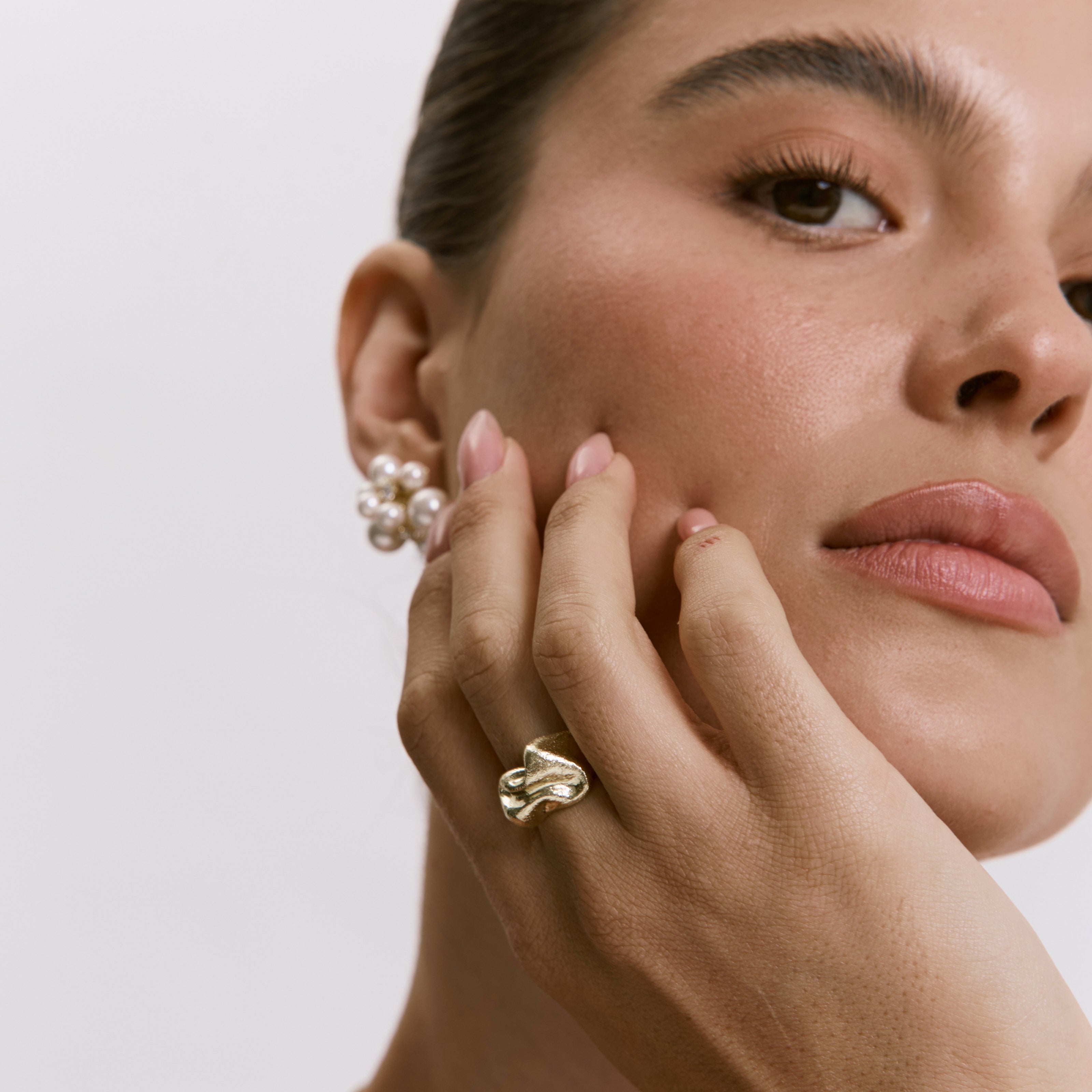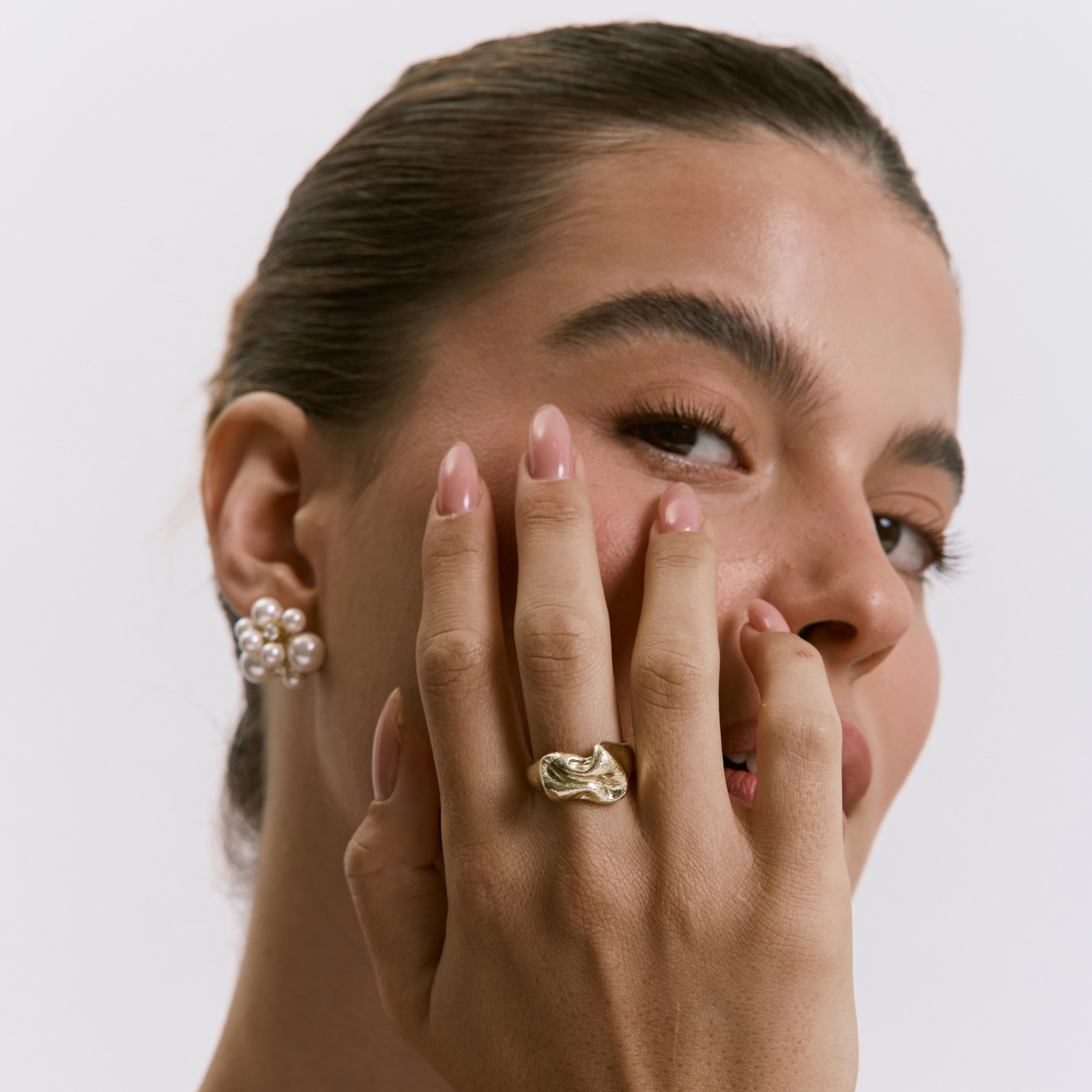 טבעת סטייטמנט מרשימה, בעלת צורה מקומטת וזורמת וטקסטורה ייחודית, ללוק ייחודי ומלא סטייל. הטבעת עשוייה בעבודת יד ומצופה בזהב 14K.