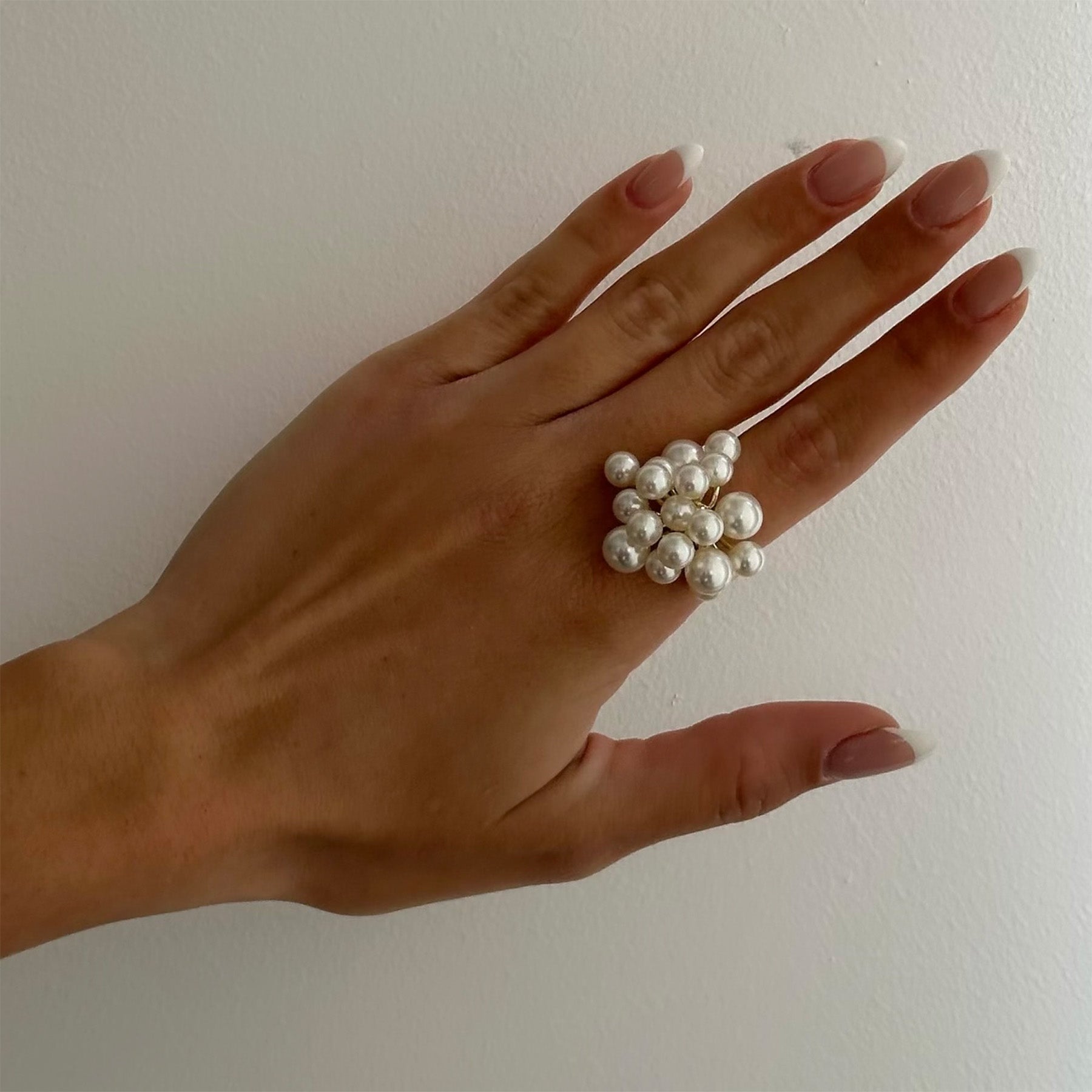 טבעת פנינים מתכווננת, גדולה ומרשימה, בעיצוב נועז ומלא נוכחות וסטייל. הטבעת עשויה בעבודת יד ומצופה בזהב 14K.