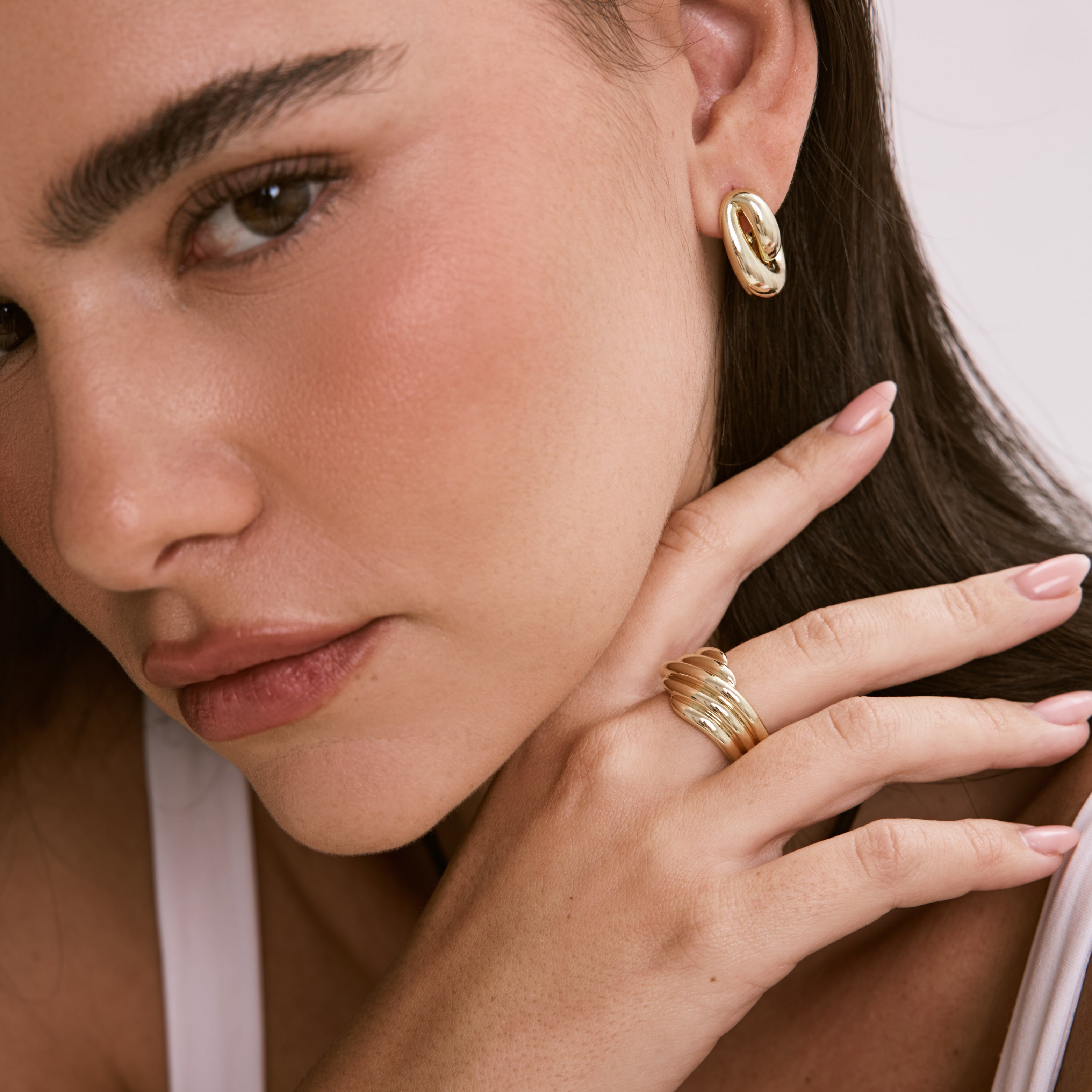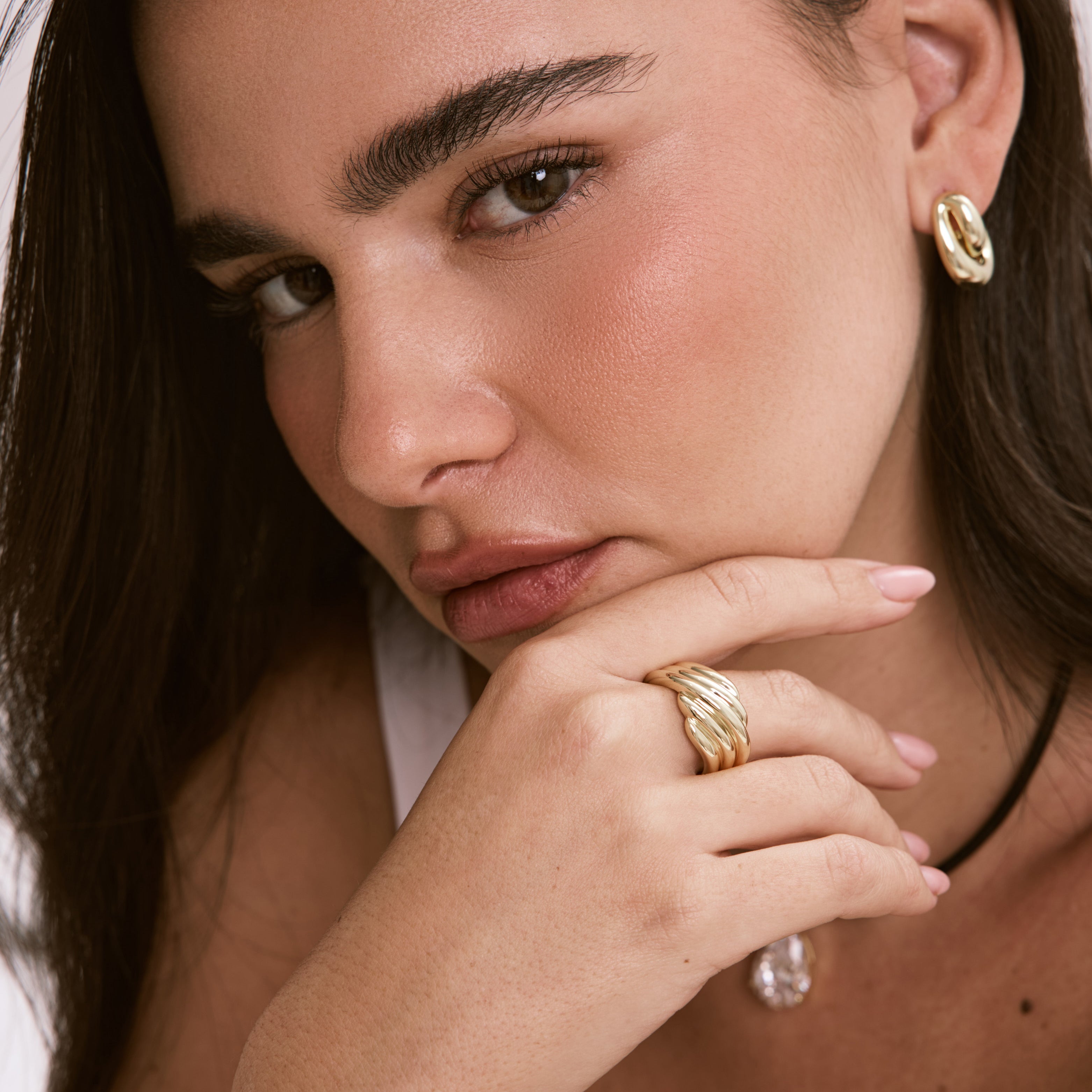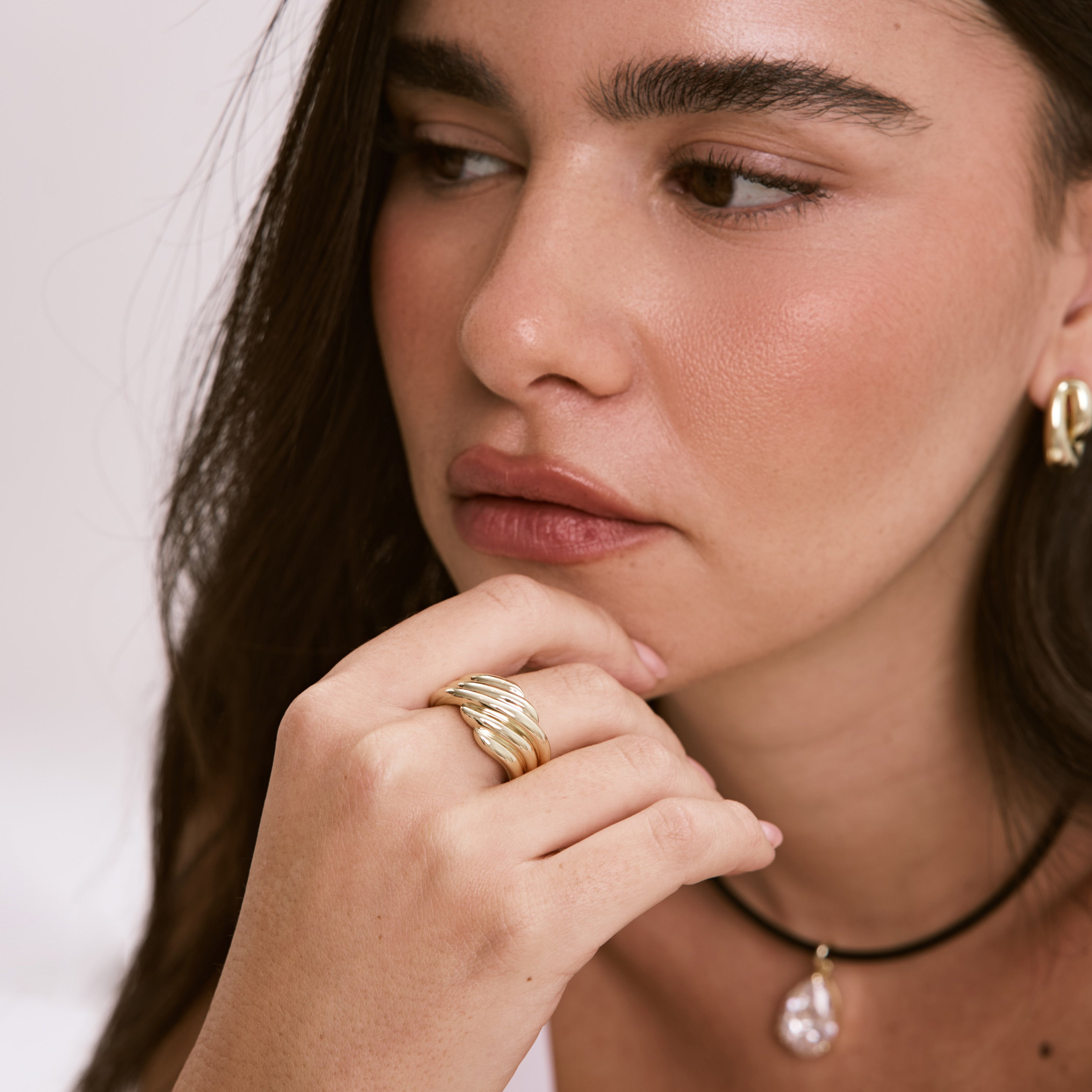 טבעת פסים רחבה בעיצוב זורם ויוקרתי, ללוק על-זמני ומלא נוכחות. הטבעת עשויה בעבודת יד ומצופה בזהב 14K.