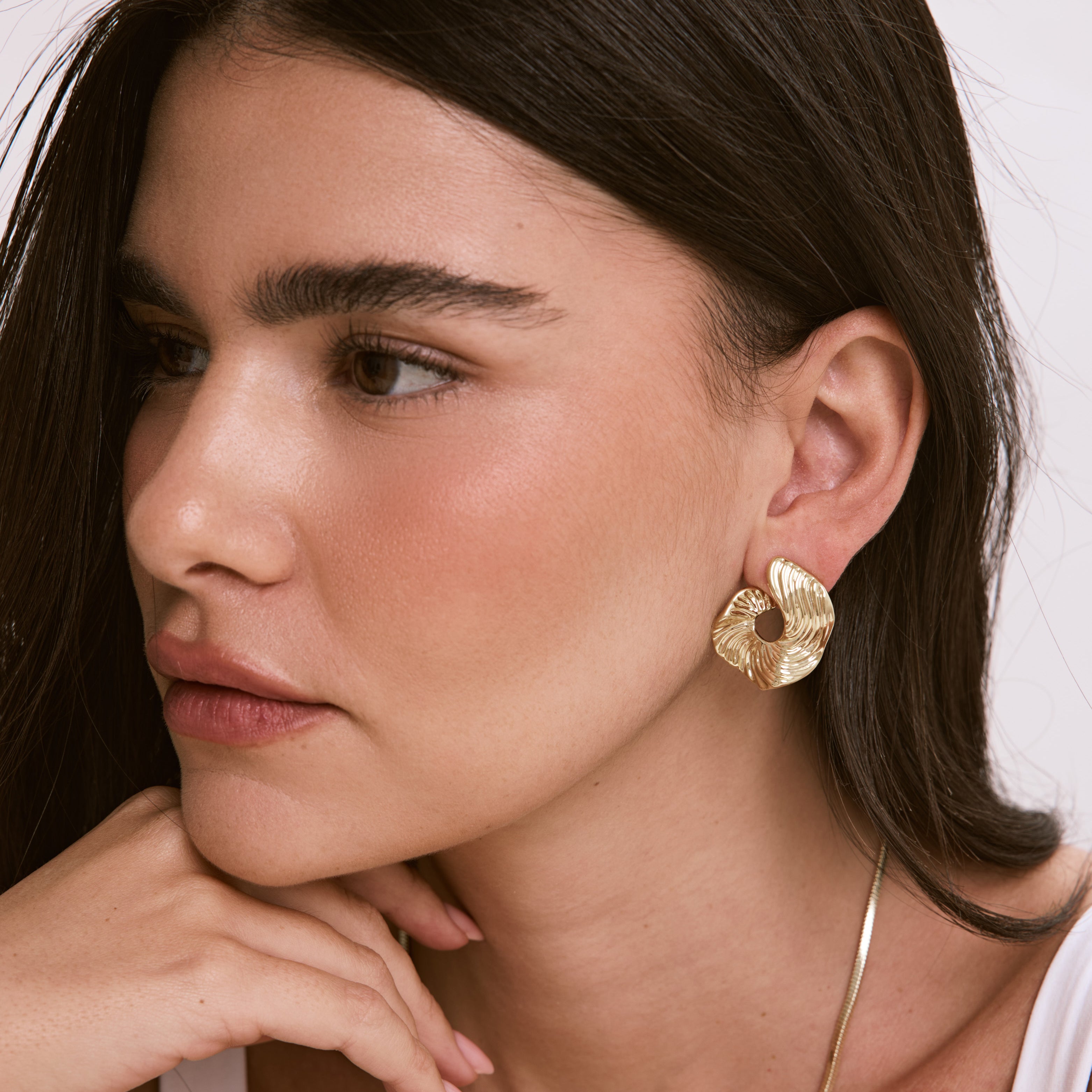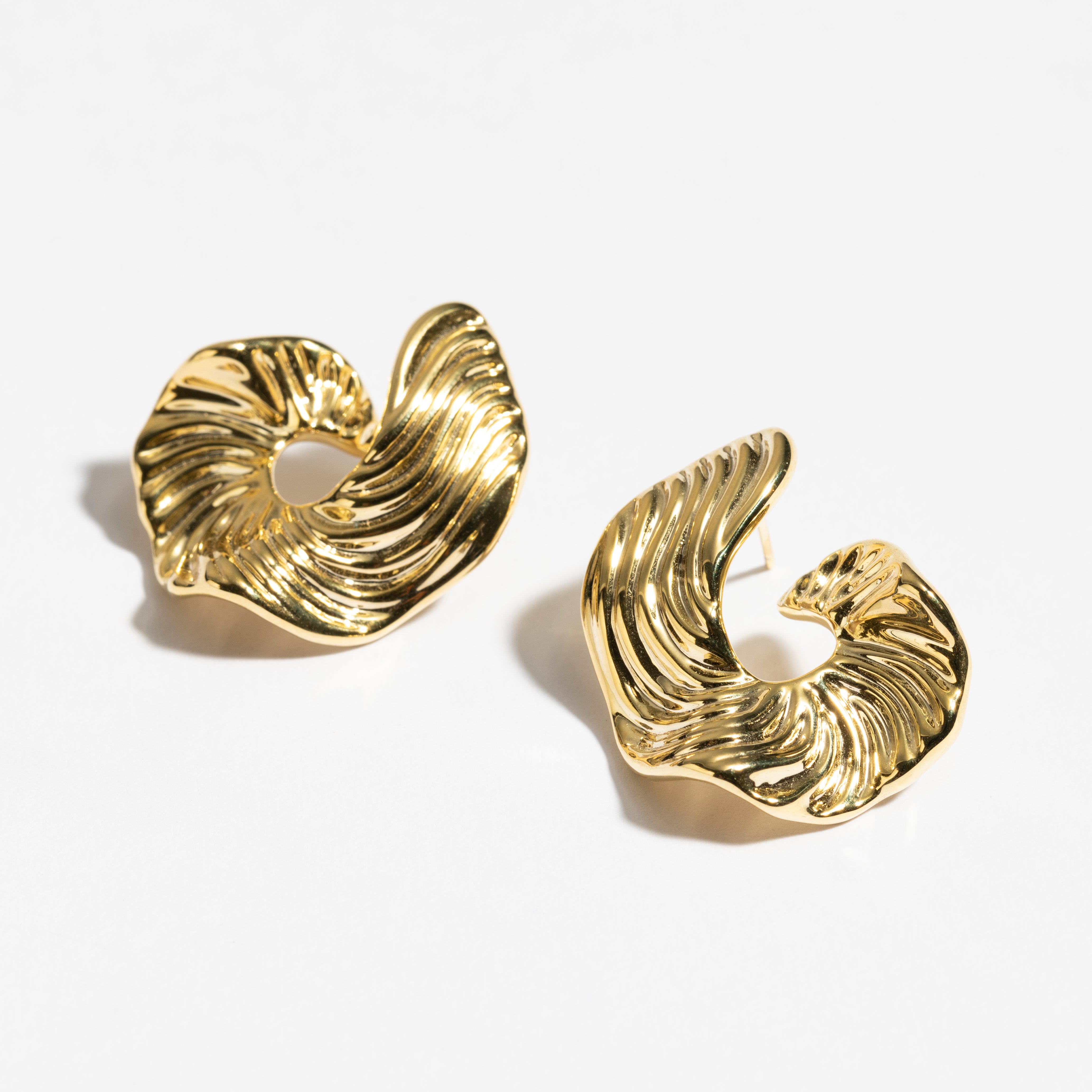 עגילים צמודים בעיצוב מרשים וייחודי וטקסטורת פסים טרנדית, ללוק מחמיא ומלא סטייל. העגילים עשויים בעבודת יד ומצופים בזהב 14K.