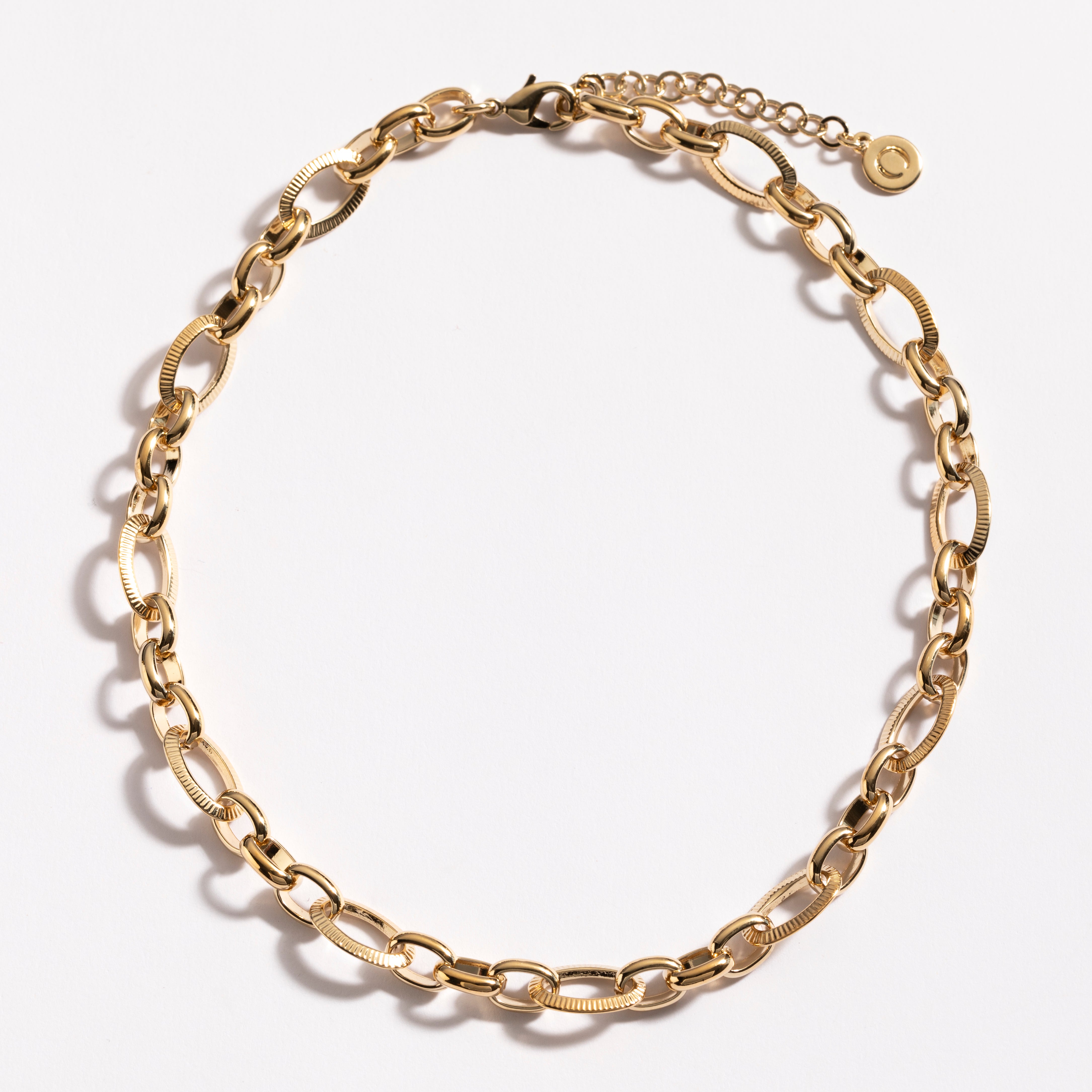 שרשרת חוליות בגודל משתנה המשלבת בין חוליות חלקות לבין חוליות עם חריצים עדינים. השרשרת עשוייה בעבודת יד ישראלית ומצופה זהב 24K, בעיצוב על זמני שתמיד יחמיא.