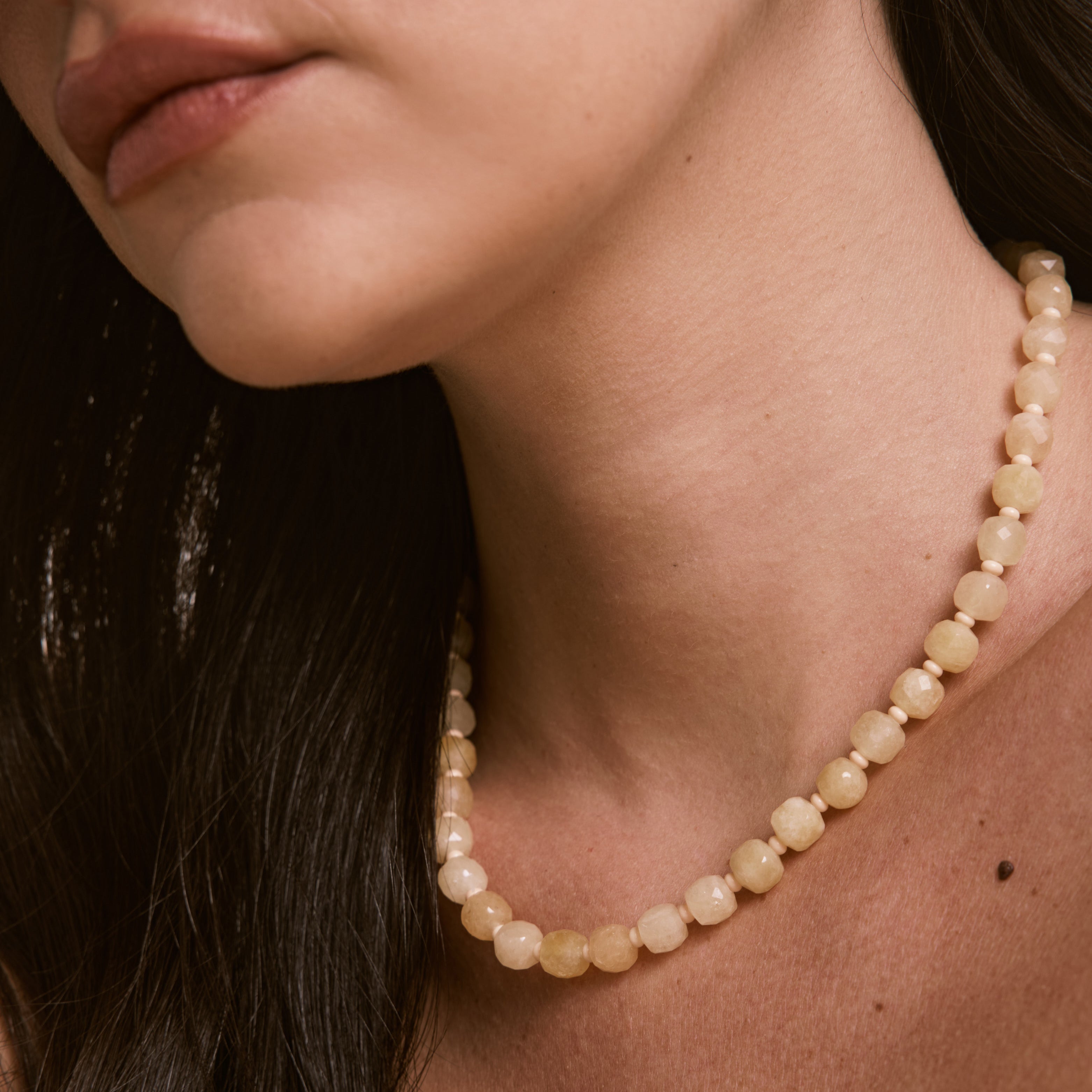 מחרוזת אבני חן בצבע צהוב חמאה, הגוון החם של הקיץ! המחרוזת עשויה בעבודת יד ומצופה בזהב 14K.