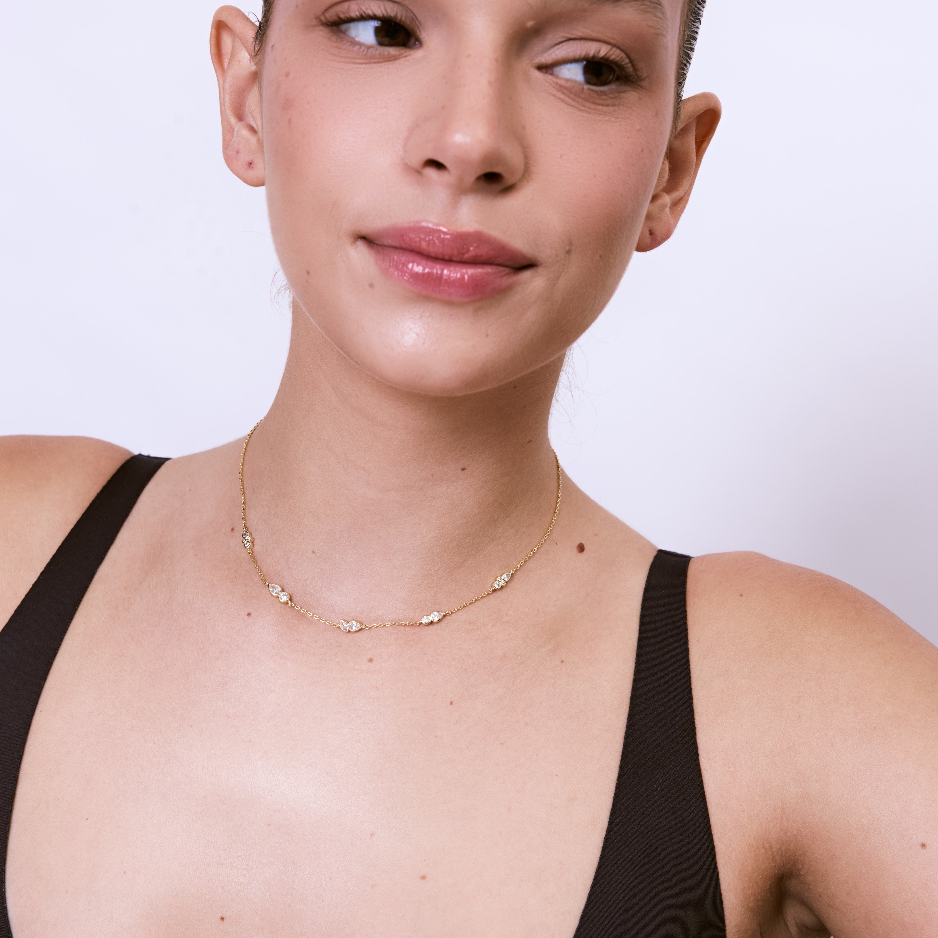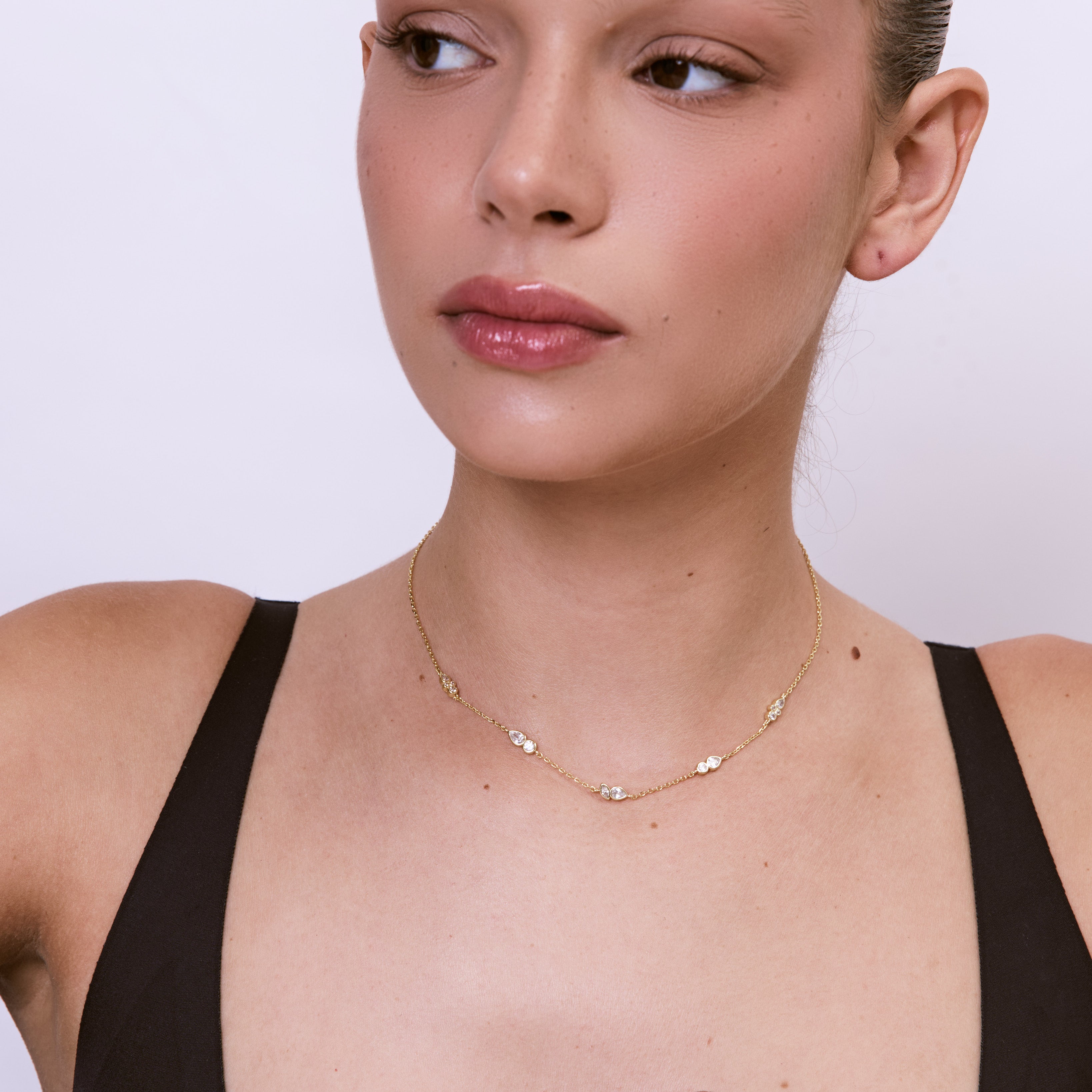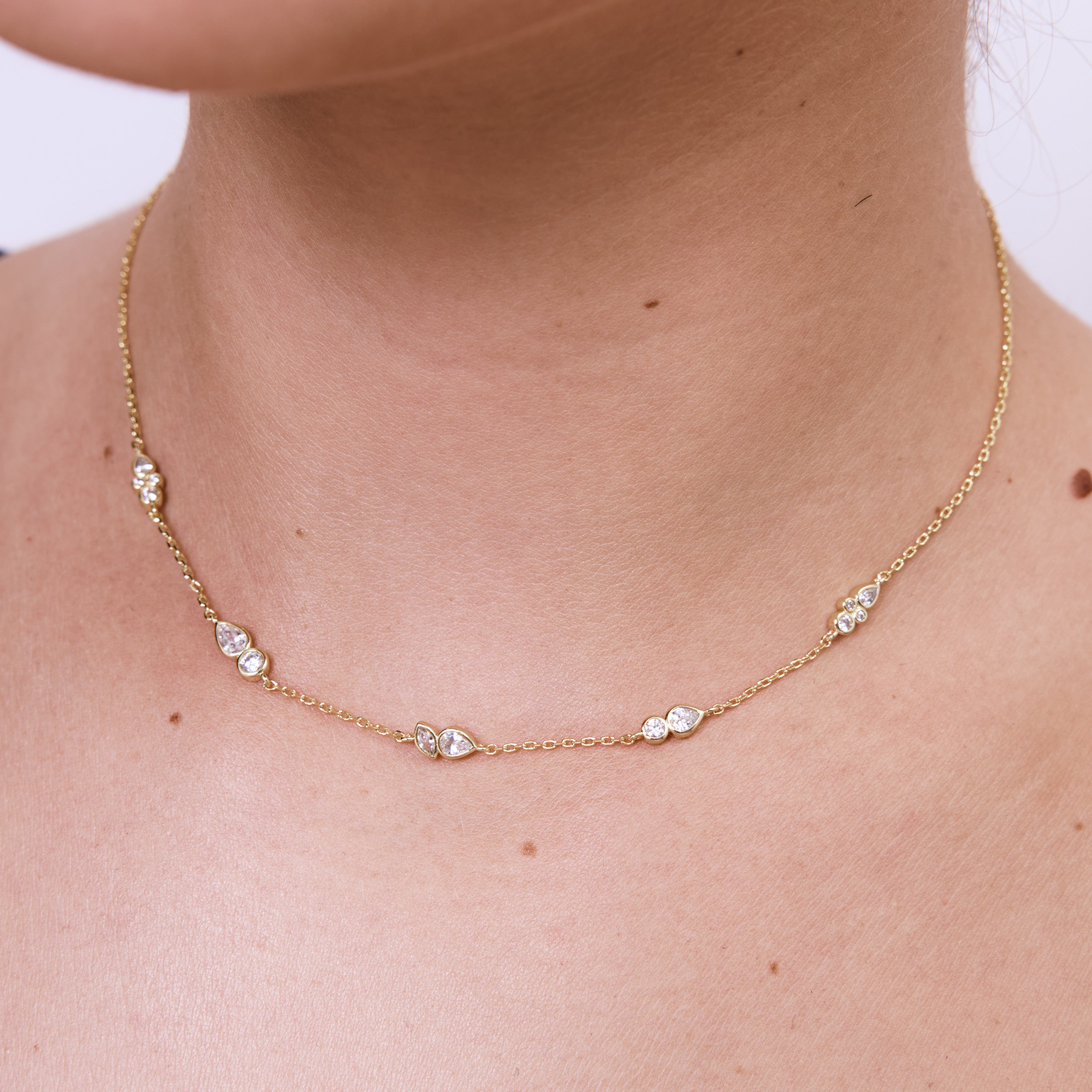 שרשרת עדינה משובצת בזירקונים במגוון צורות ושילובים, בעיצוב רענן, יוקרתי ומלא קסם. השרשרת עשויה בעבודת יד ומצופה בזהב 14K.