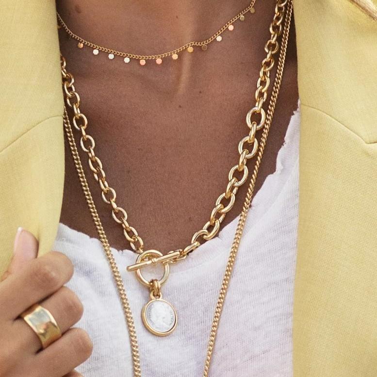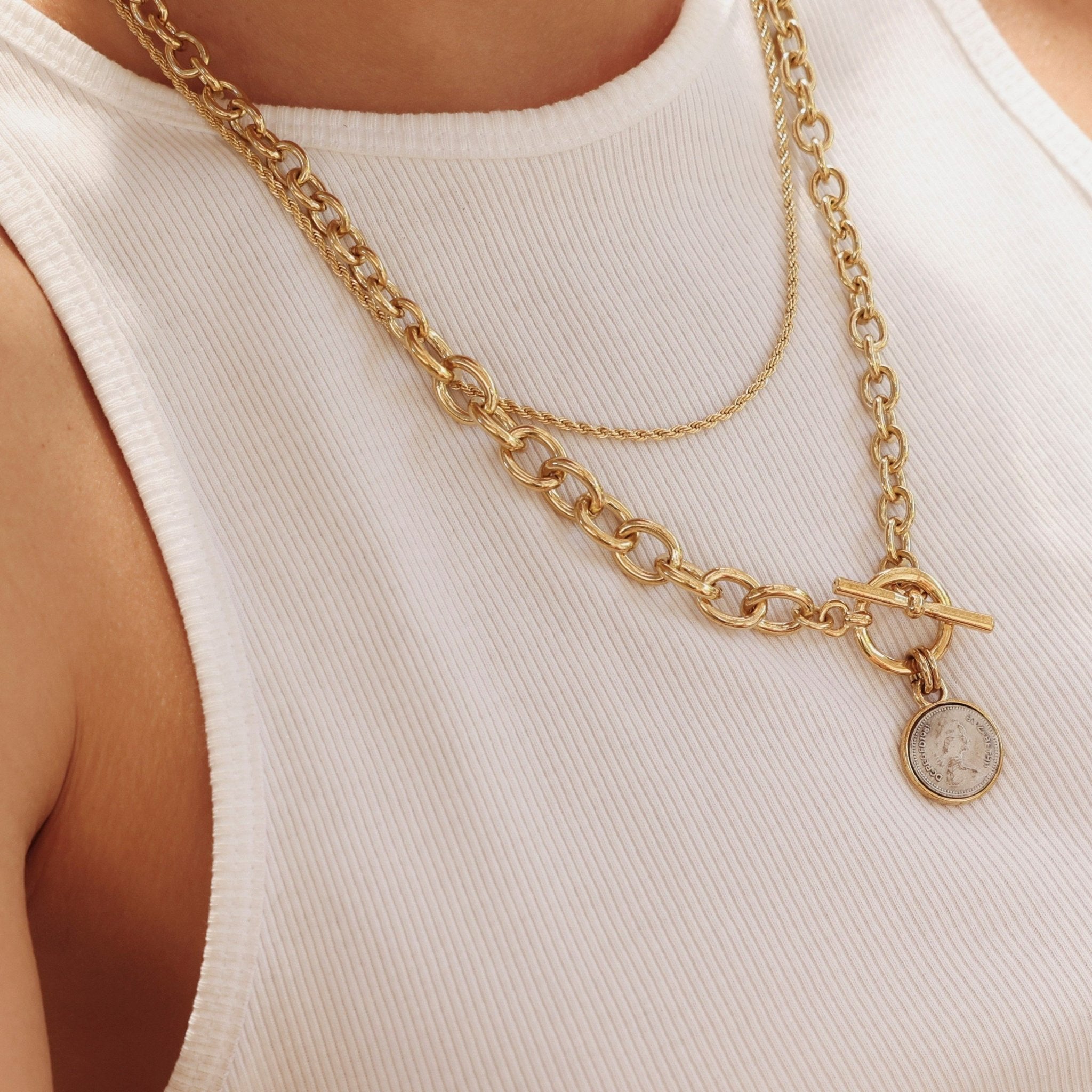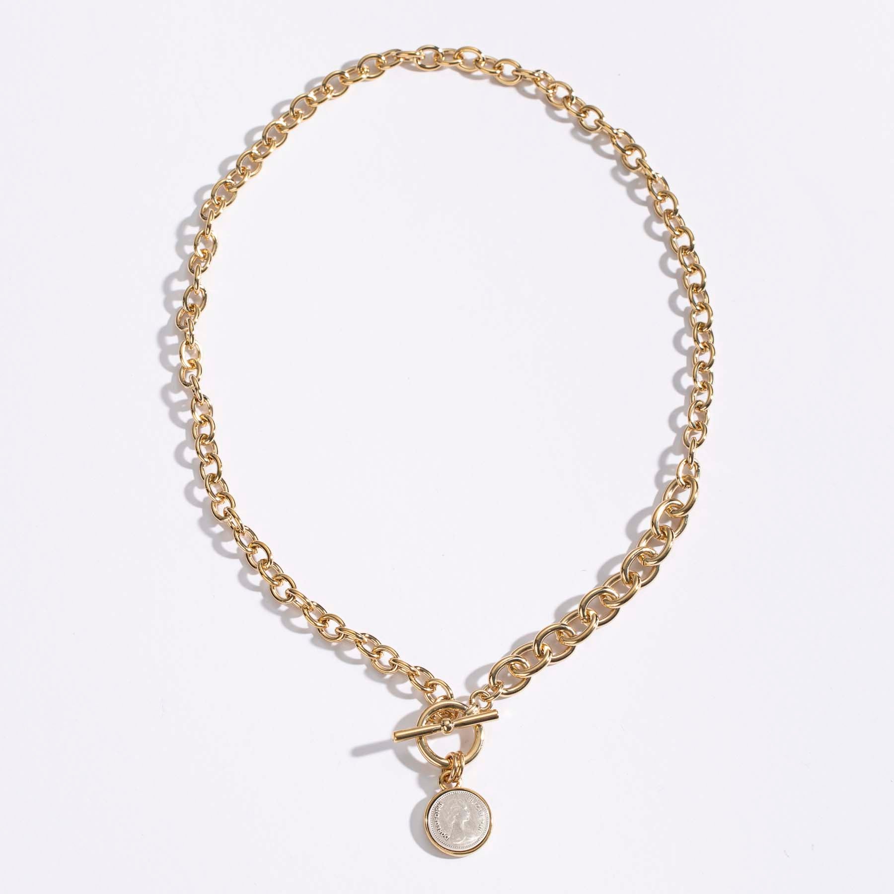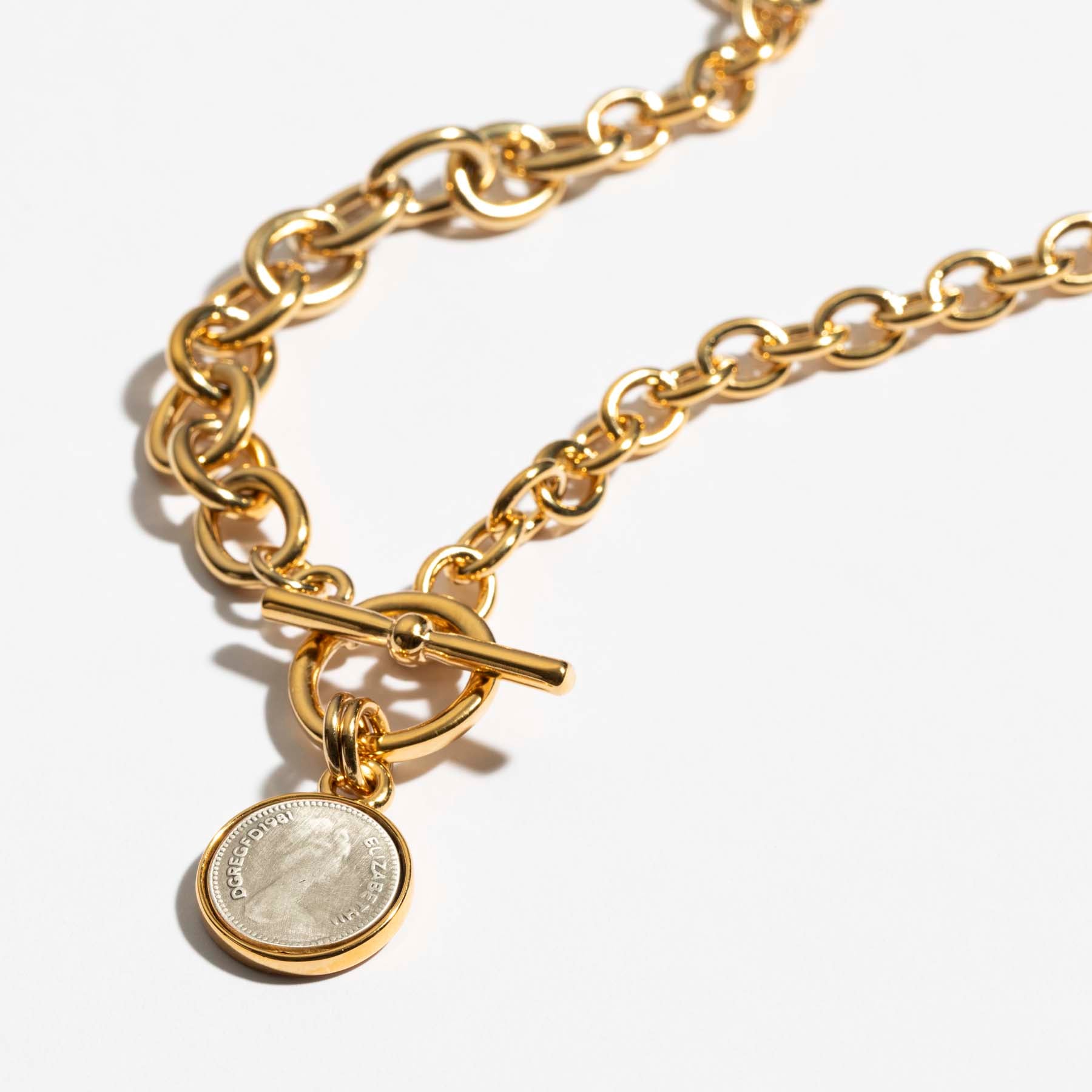 שרשרת אופנתית ונשית, בעלת נוכחות בולטת, מצופה זהב 24 קראט עם מטבע מצופה כסף טהור, שמעניק לה לוק אופנתי ומיוחד במינו.
