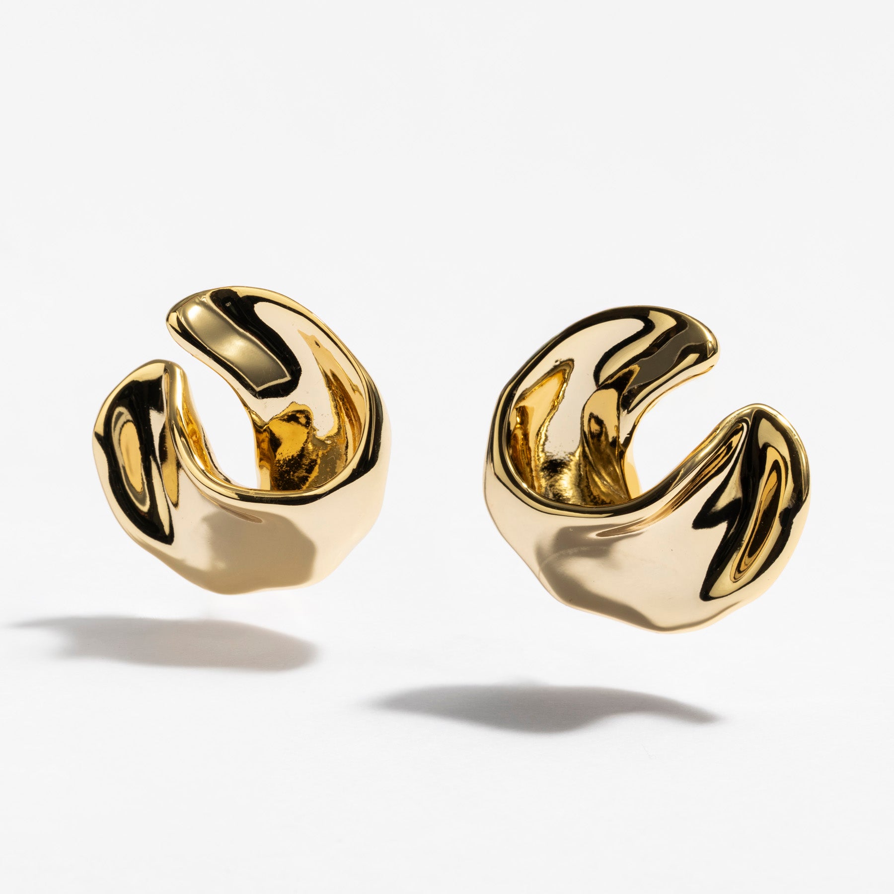 עגילי חישוק מתרחבים ונפחיים בעיצוב זורם, טרנדי ומלא נוכחות. העגילים עשויים בעבודת יד ומצופים בזהב 14K.