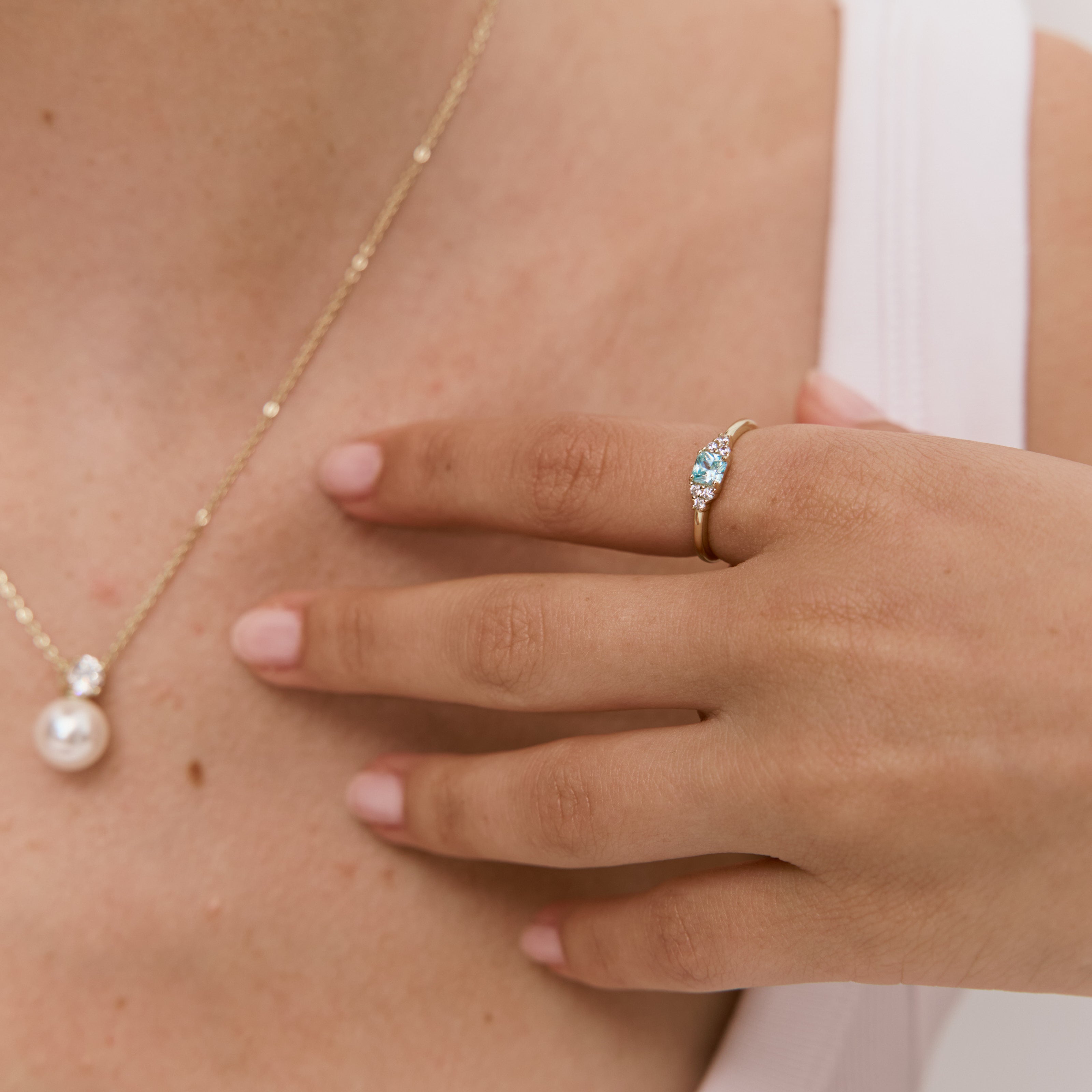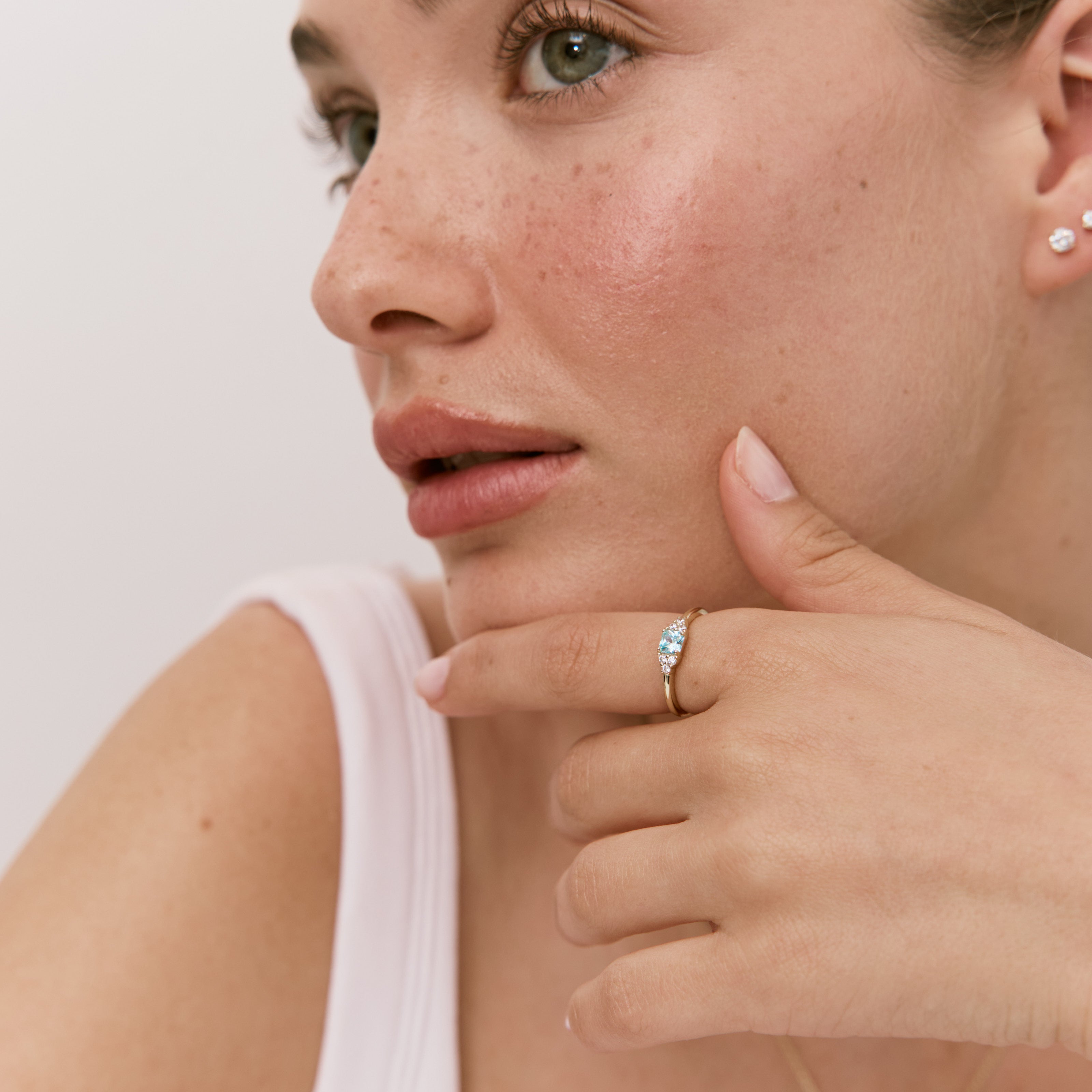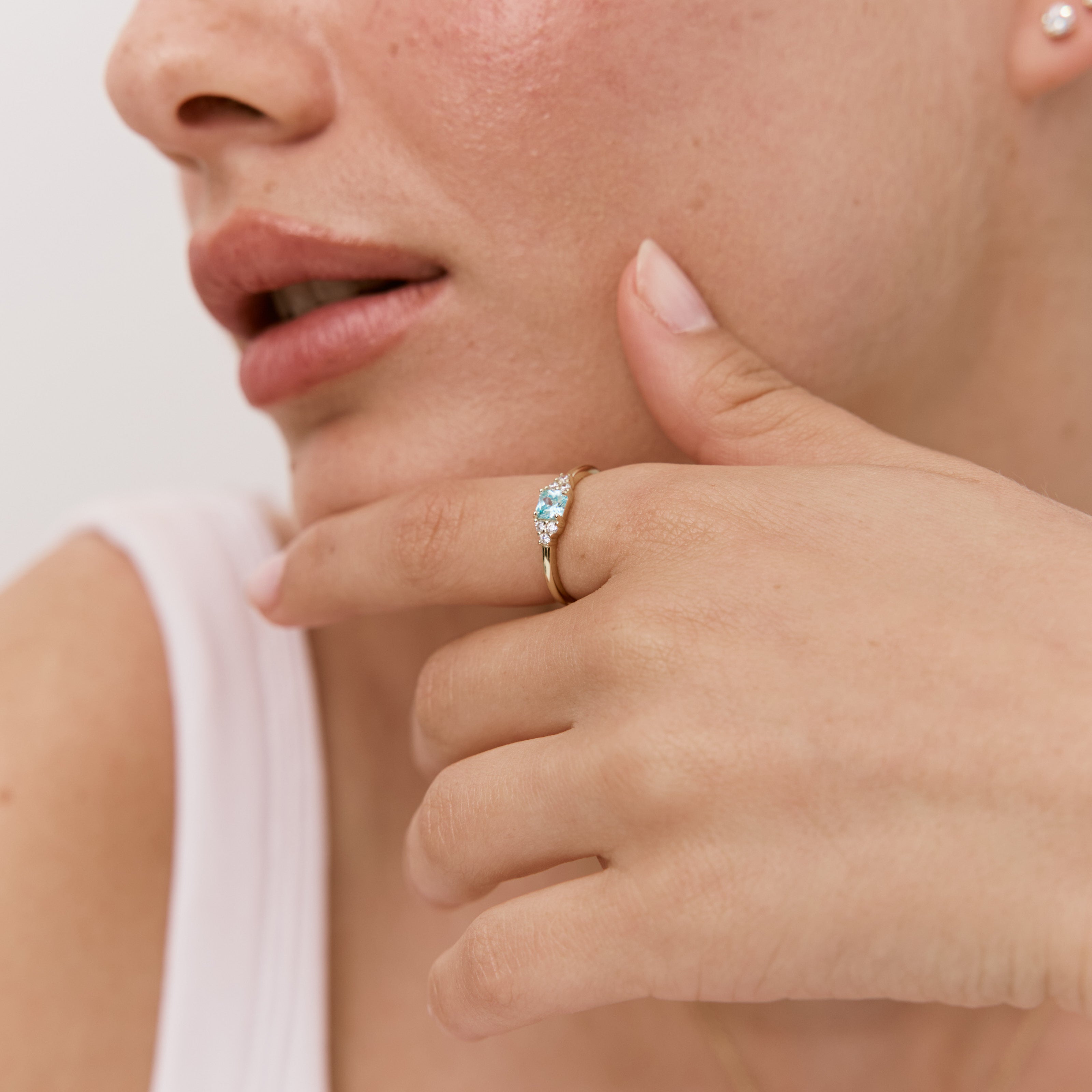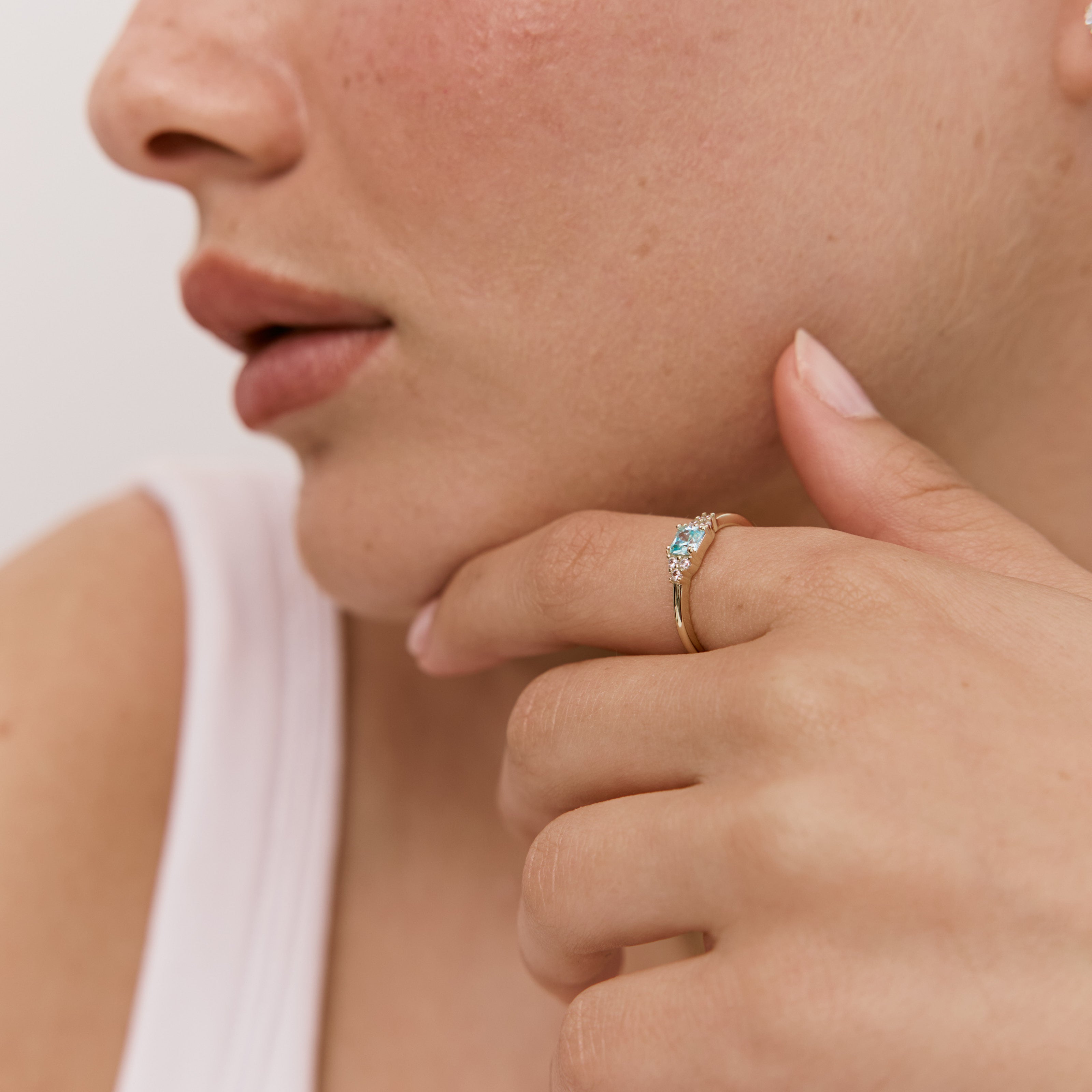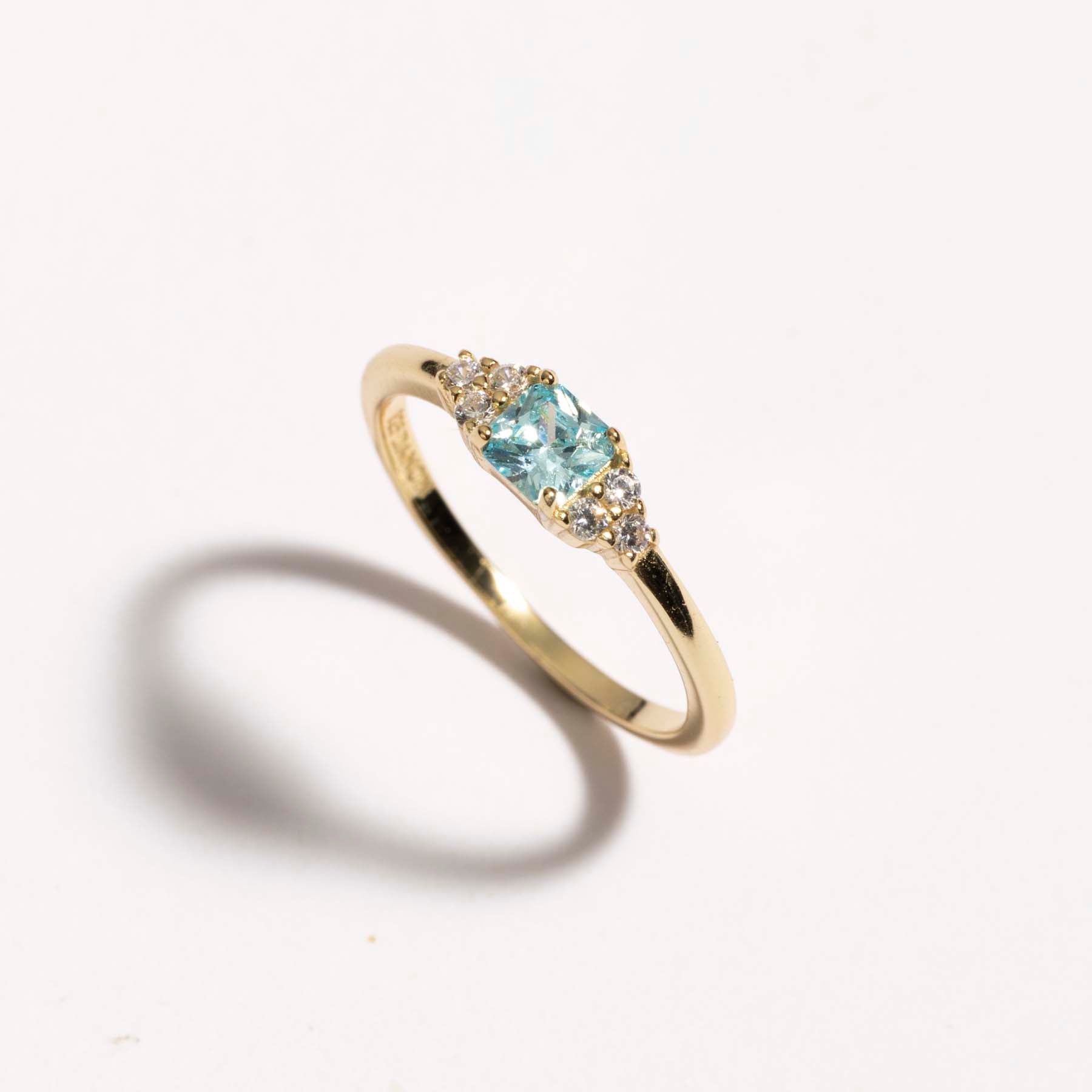 טבעת בסגנון וינטאג' משובצת בזירקונים עם זירקון תכלת מרובע במרכז, בעיצוב ייחודי ואלגנטי. טבעת עשויה בעבודת יד מכסף סטרלינג 925 ומצופה בזהב 14K.