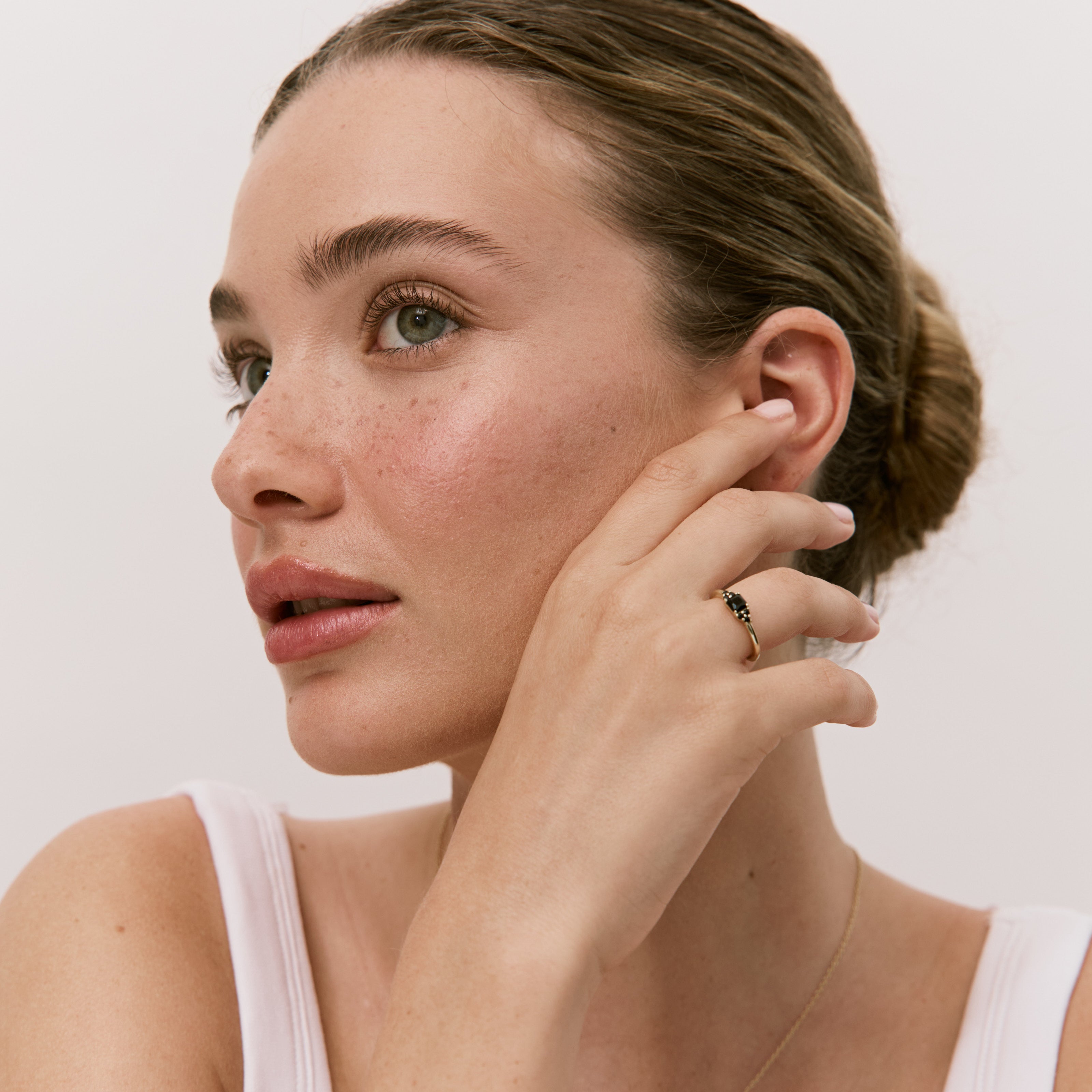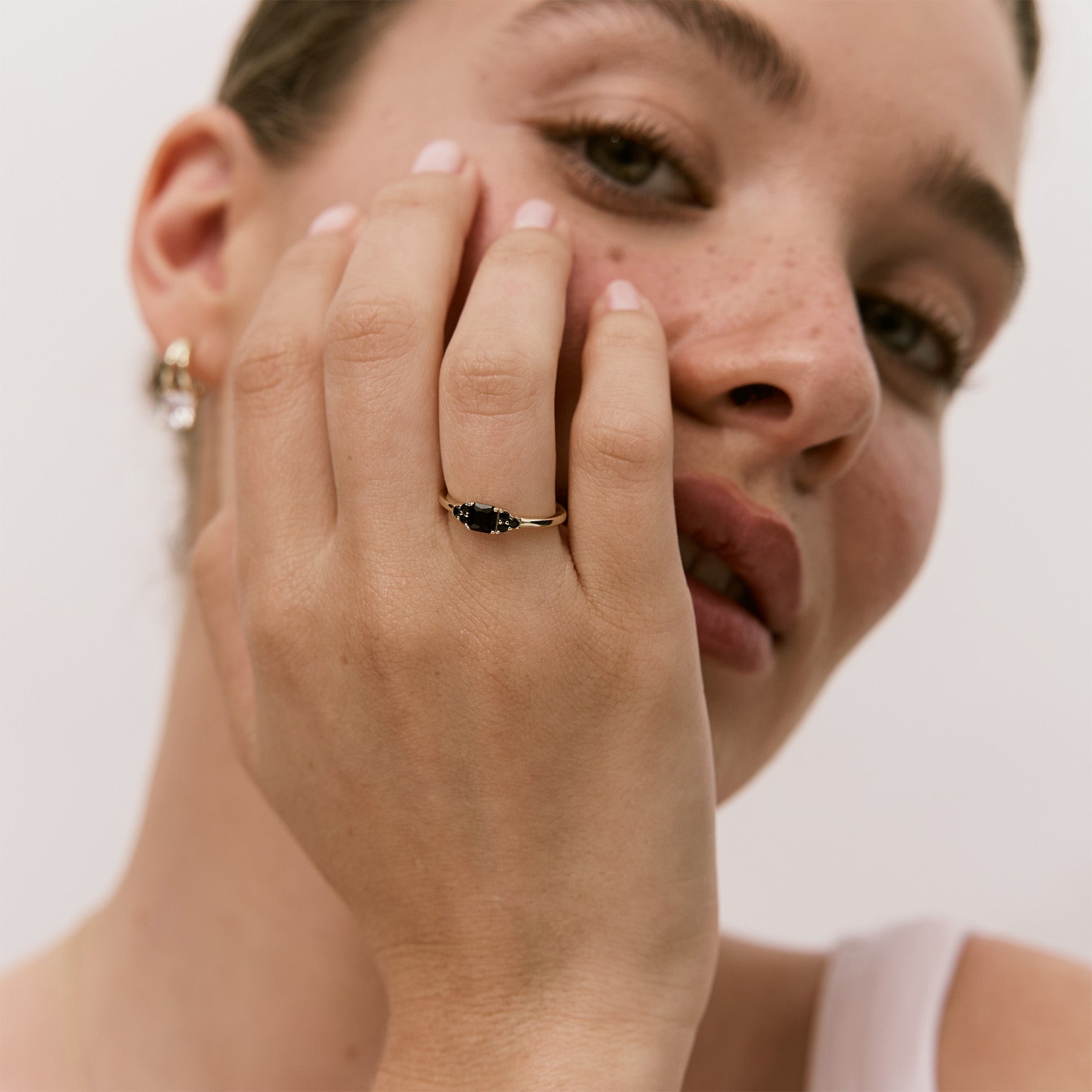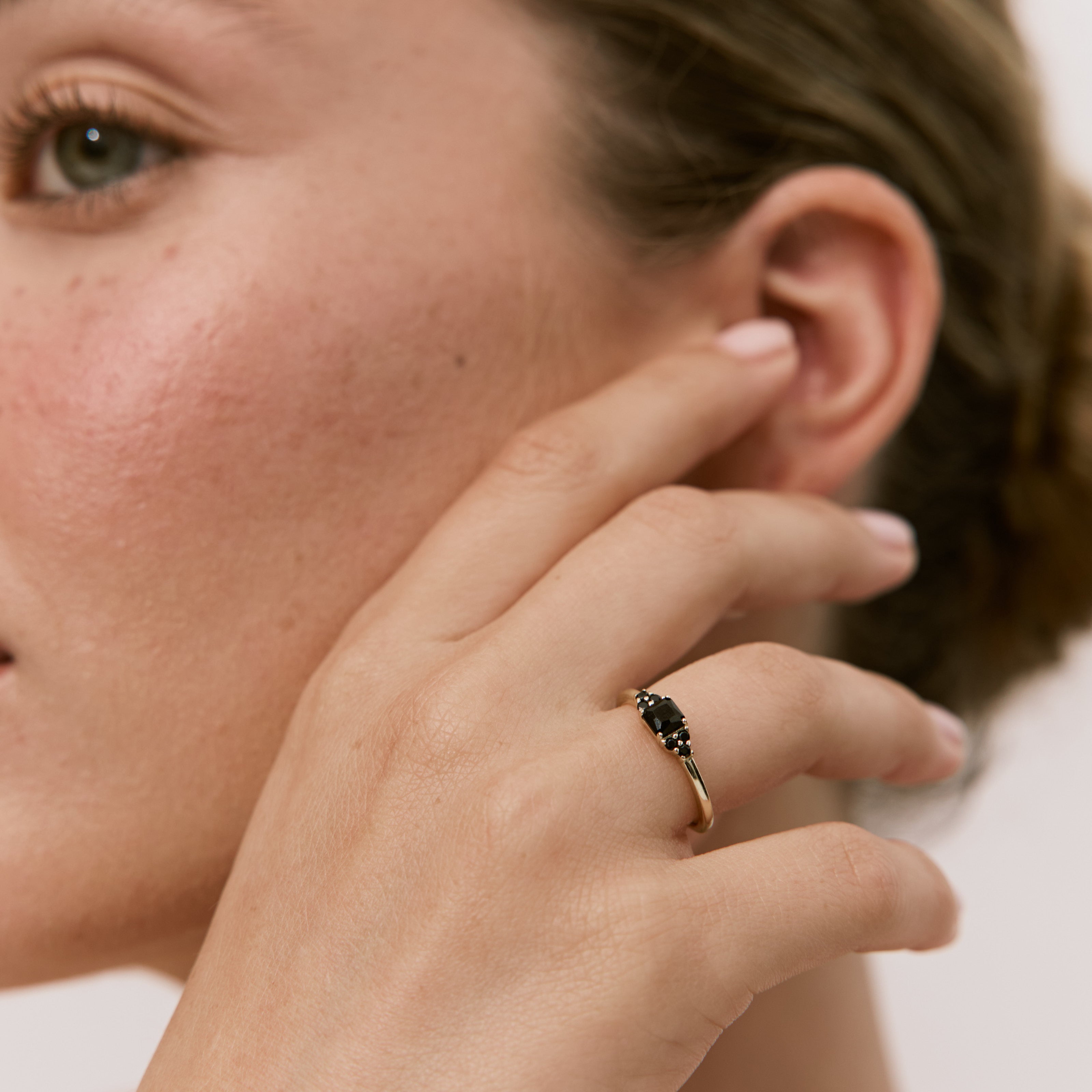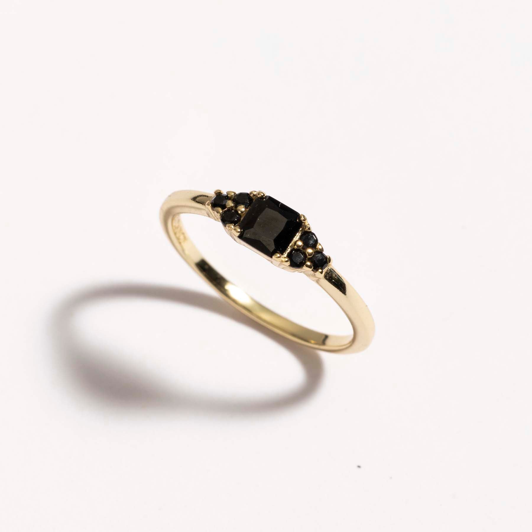 טבעת בסגנון וינטאג' משובצת בזירקונים שחורים עם זירקון שחור מרובע במרכז, בעיצוב ייחודי ואלגנטי. הטבעת עשויה בעבודת יד מכסף סטרלינג 925 ומצופה בזהב 14K.