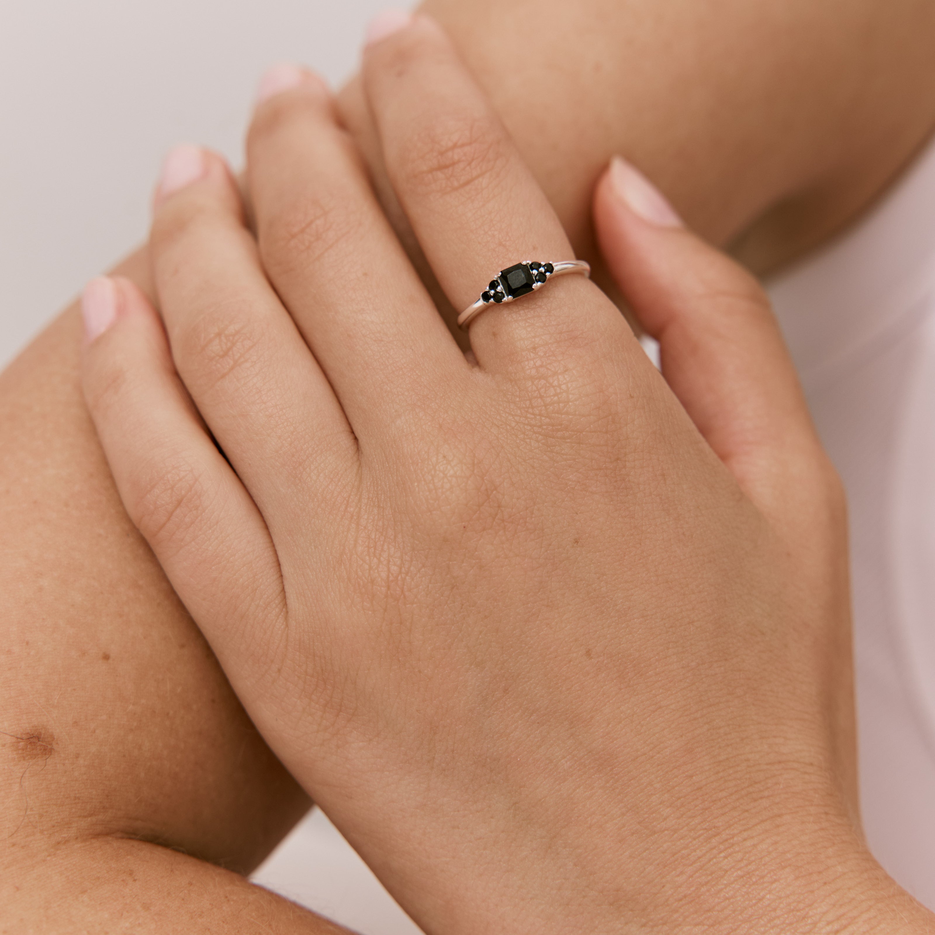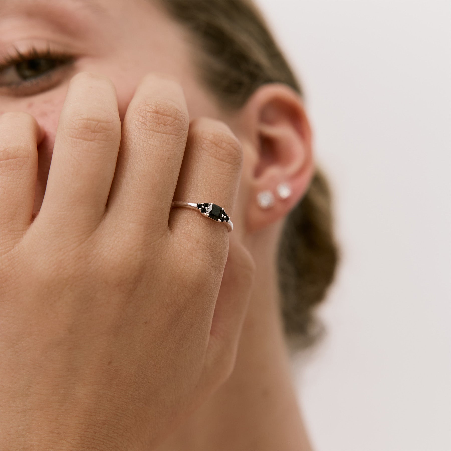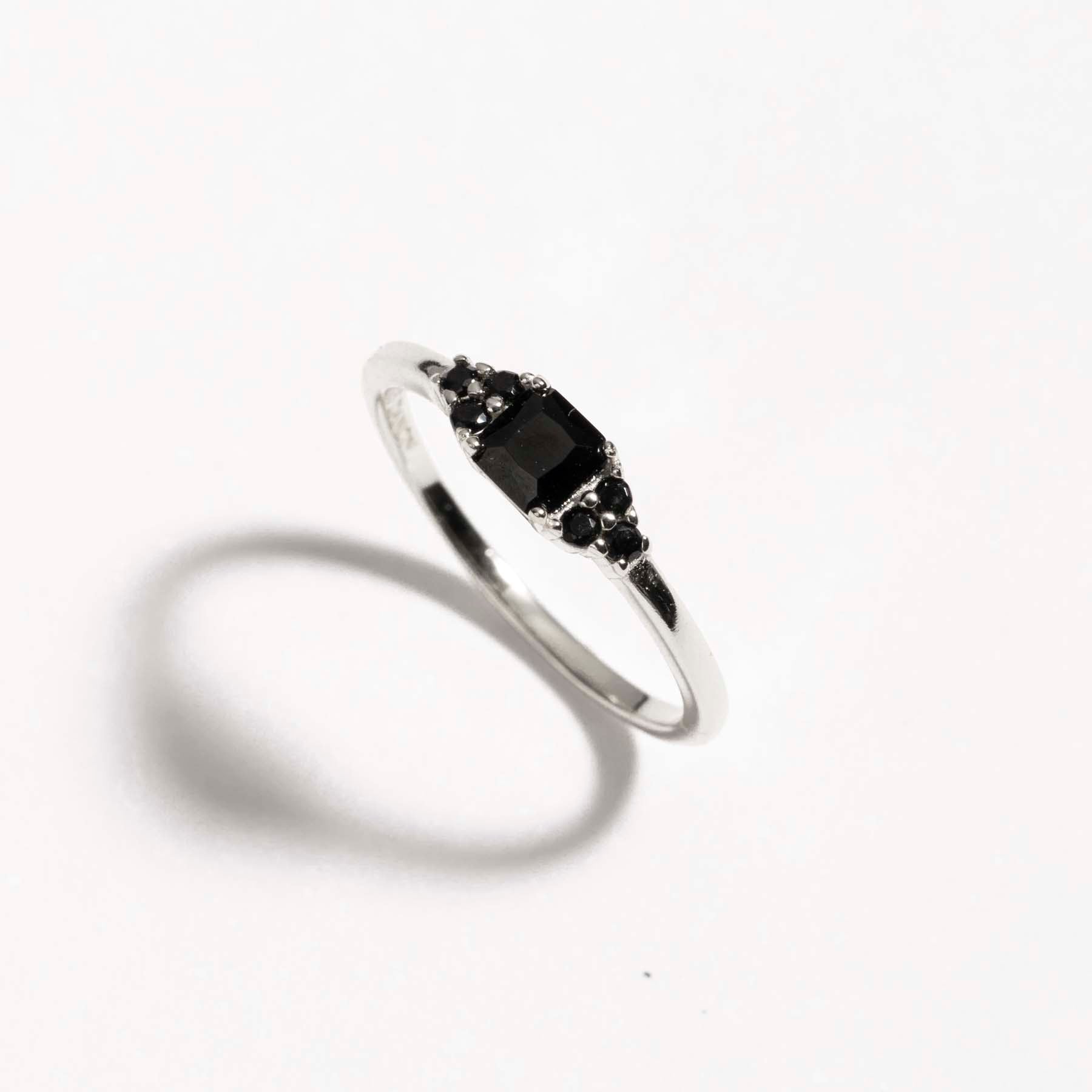 טבעת בסגנון וינטאג' משובצת בזירקונים שחורים עם זירקון שחור מרובע במרכז, בעיצוב ייחודי ואלגנטי. הטבעת עשויה בעבודת יד מכסף סטרלינג 925 ומצופה בכסף טהור.
