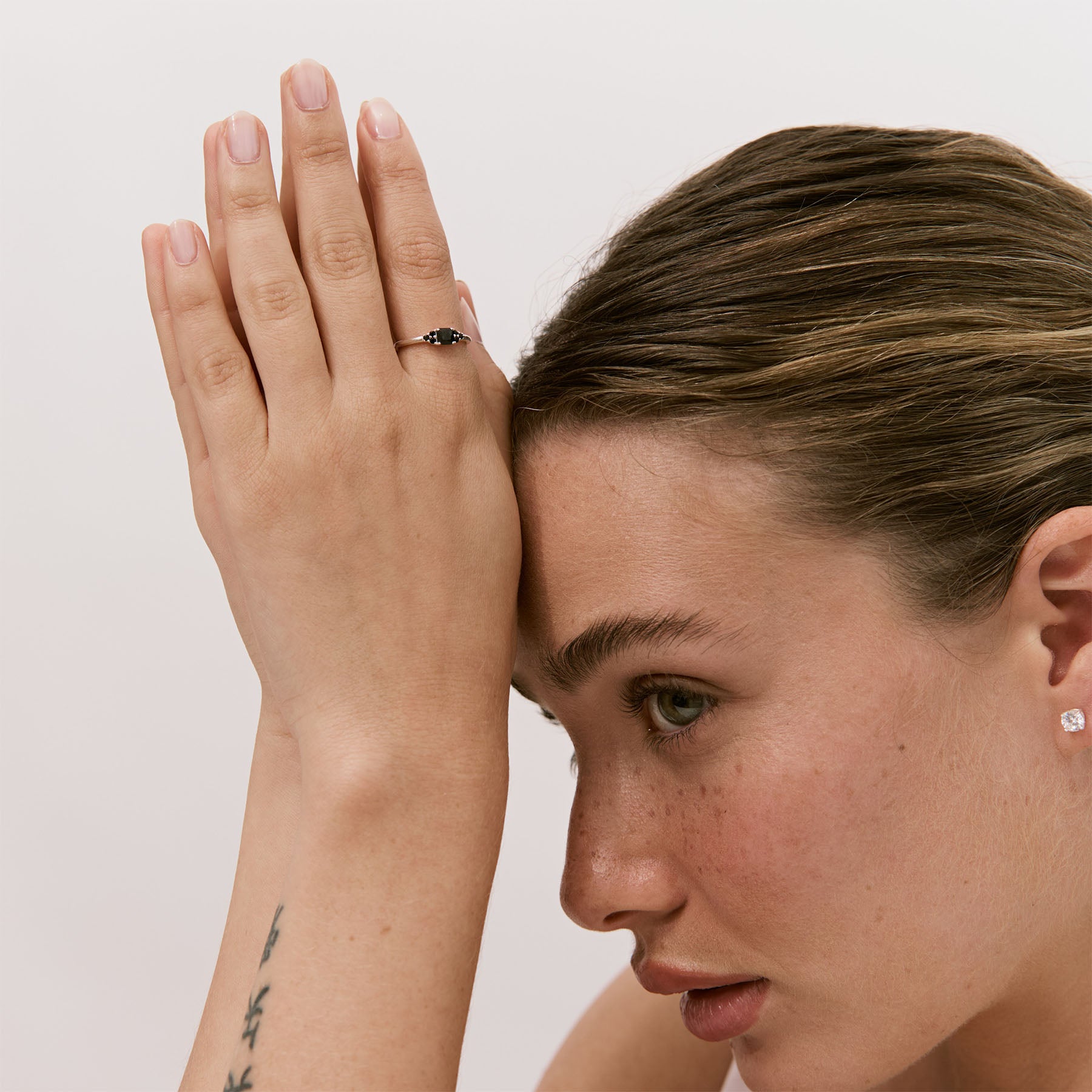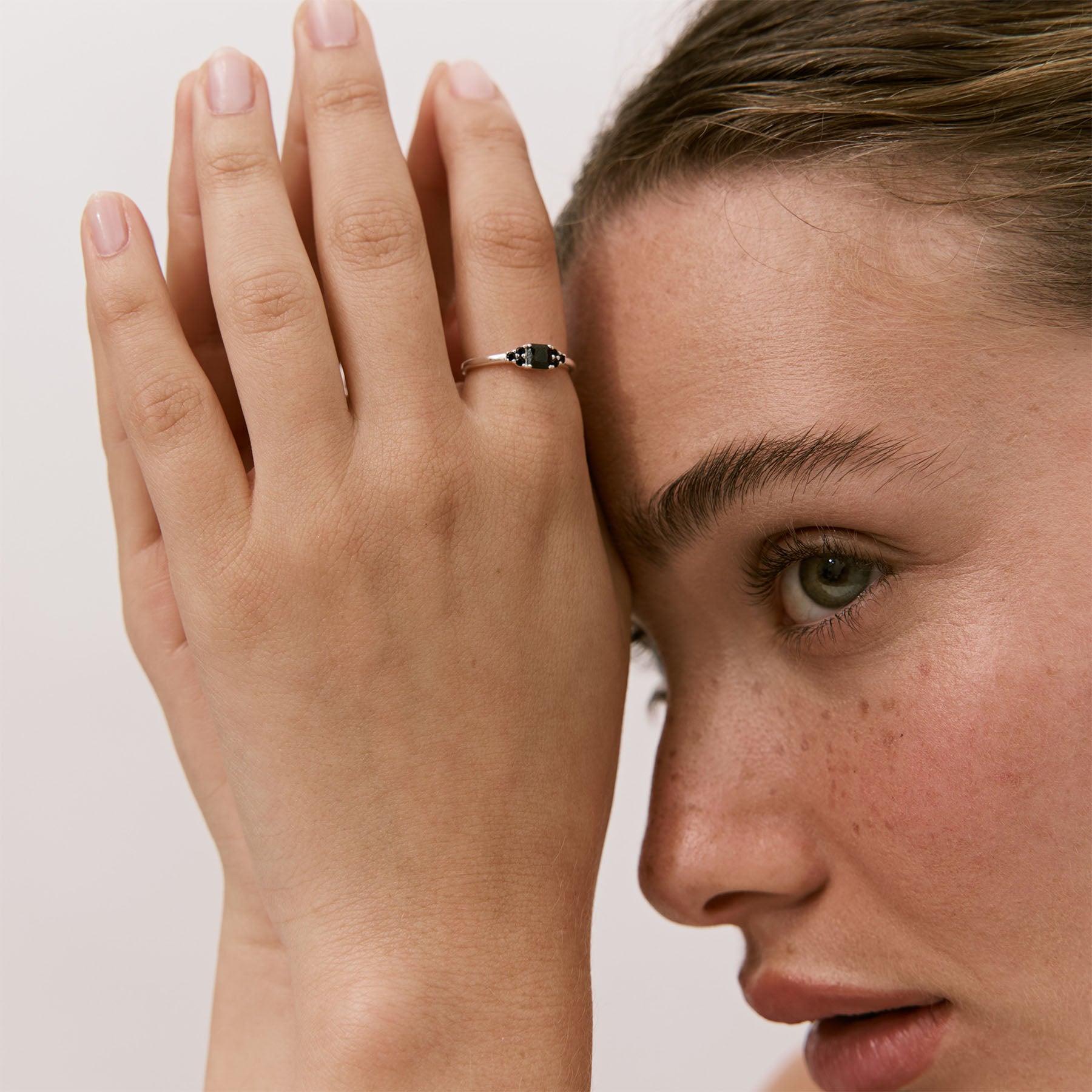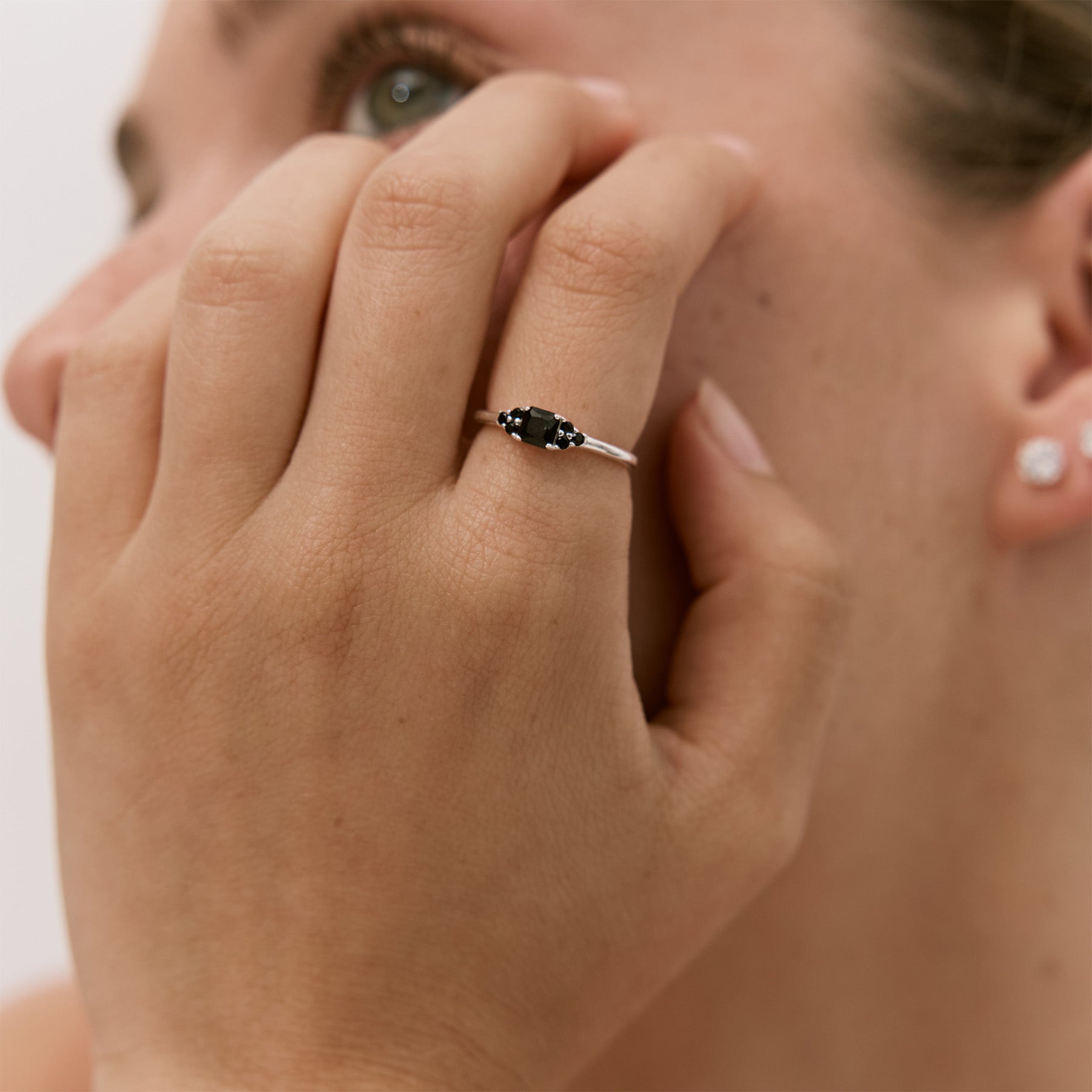 טבעת בסגנון וינטאג' משובצת בזירקונים שחורים עם זירקון שחור מרובע במרכז, בעיצוב ייחודי ואלגנטי. הטבעת עשויה בעבודת יד מכסף סטרלינג 925 ומצופה בכסף טהור.