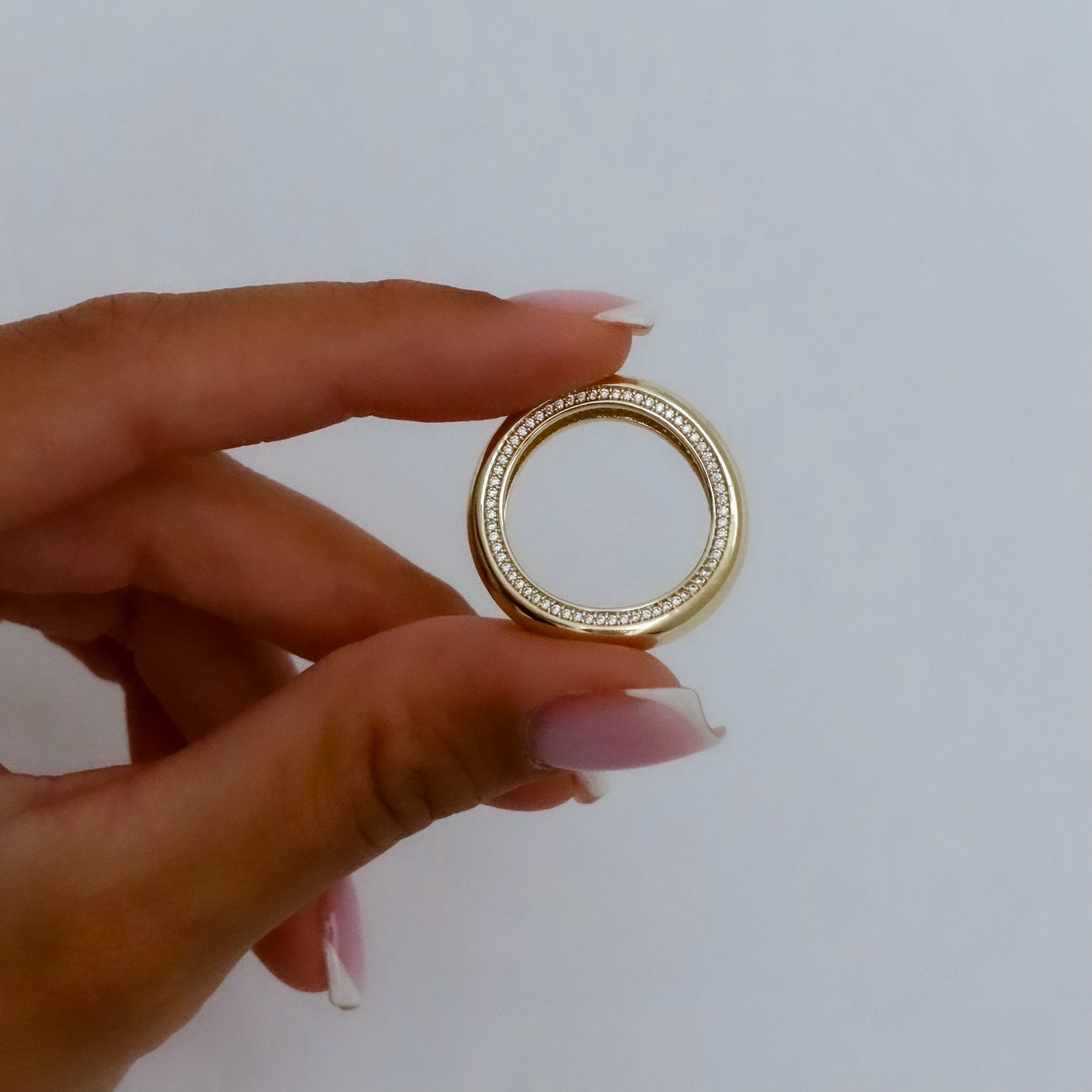 טבעת גלית משובצת בפס זירקונים מנצנצים בכל צד, בעיצוב יוקרתי, אלגנטי ומפתיע. הטבעת עשויה בעבודת יד ומצופה בזהב 14K.