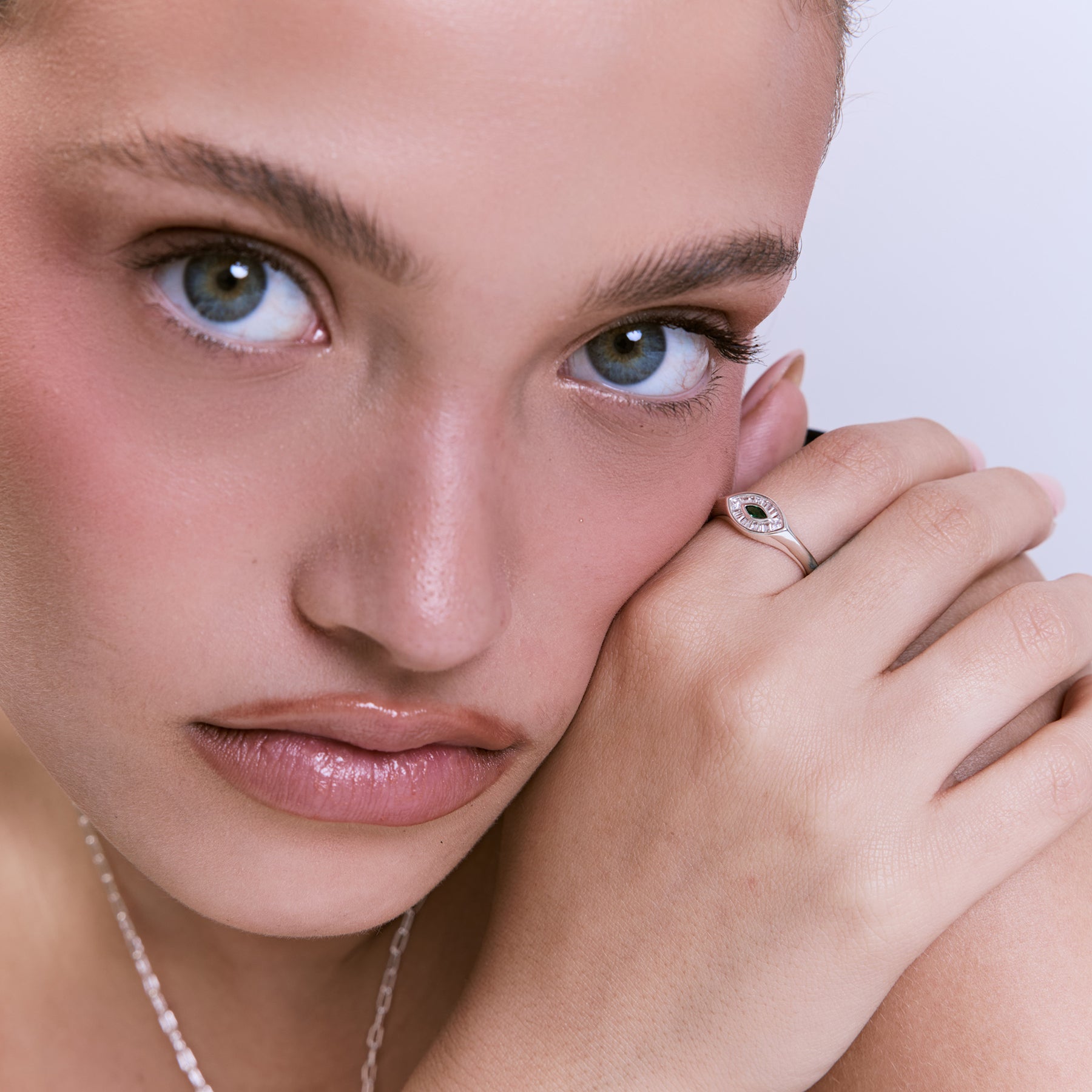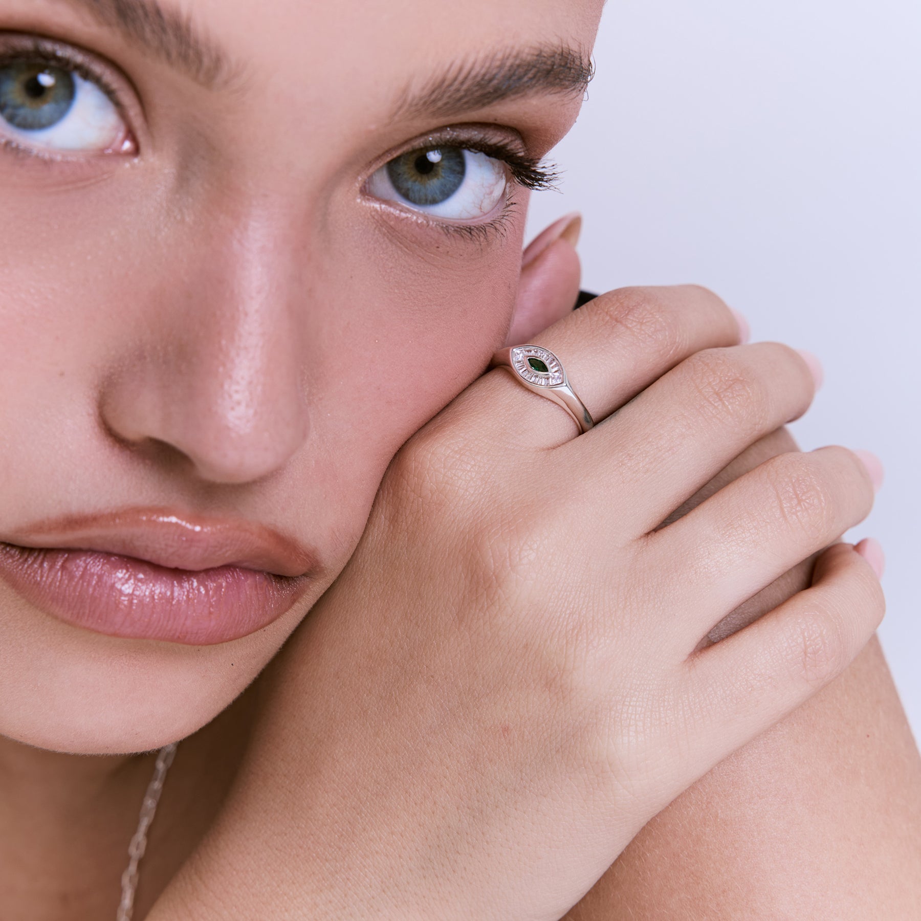 טבעת עם סנטר משובץ בצורת עין, עם זירקון ירוק וסביבו זירקונים קטנים מנצנצים. הטבעת עשויה בעבודת יד ומצופה בכסף טהור.