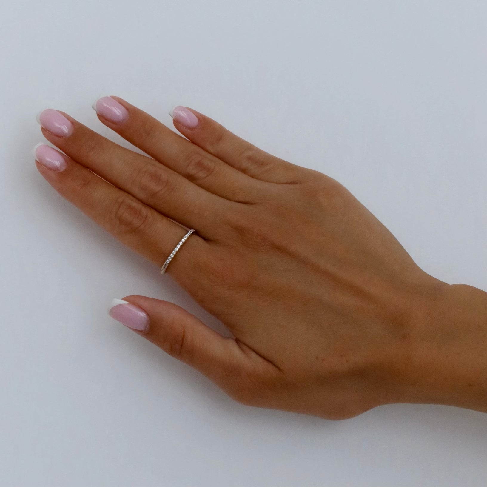 טבעת חצי איטרניטי עדינה משובצת בזירקונים, בעיצוב קלאסי על-זמני שיחמיא לכל לוק. הטבעת עשויה בעבודת יד ומצופה בכסף טהור.