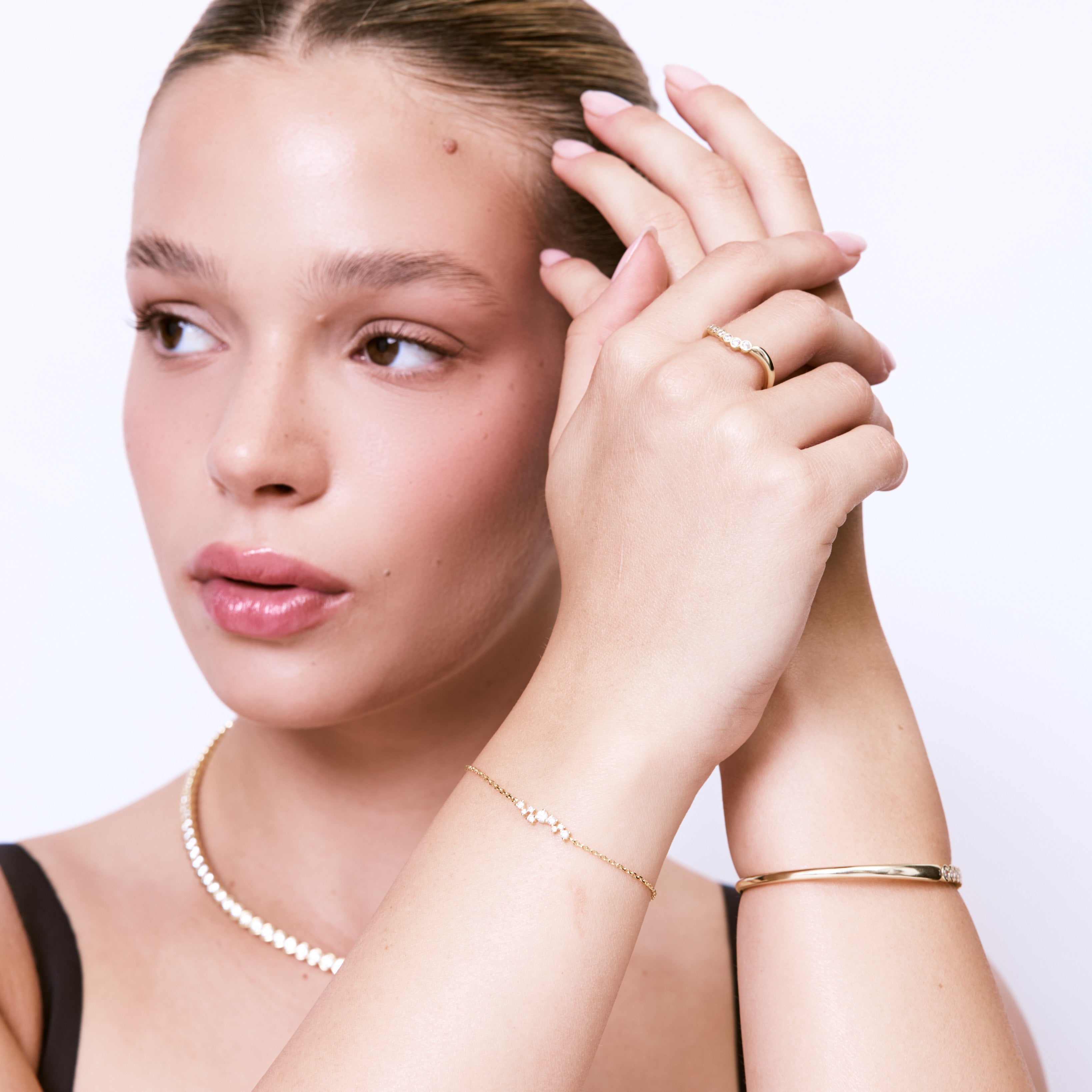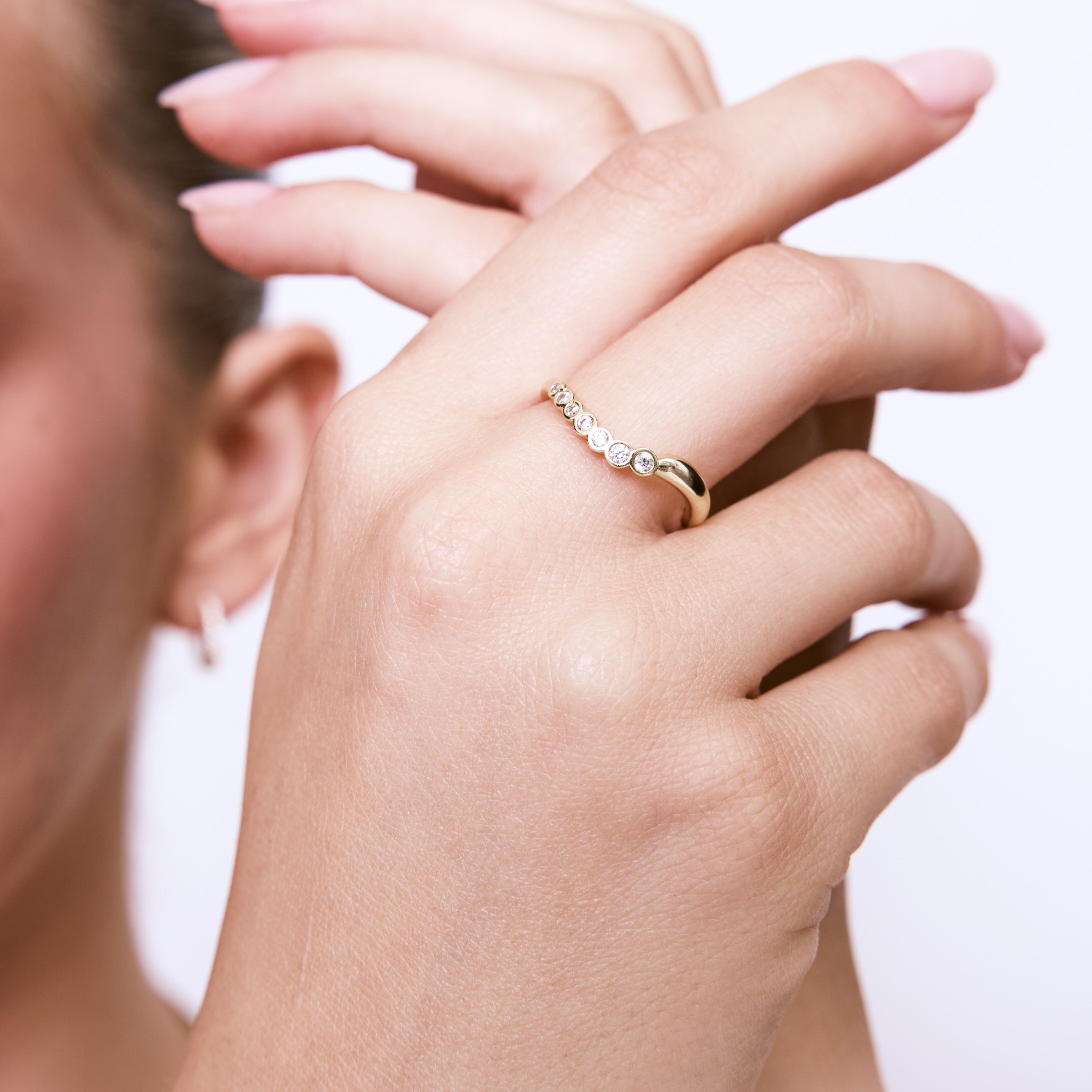 טבעת מפותלת משובצת בזירקונים נוצצים, בעיצוב יוקרתי ומדויק. הטבעת עשויה בעבודת יד ומצופה בזהב 14K.