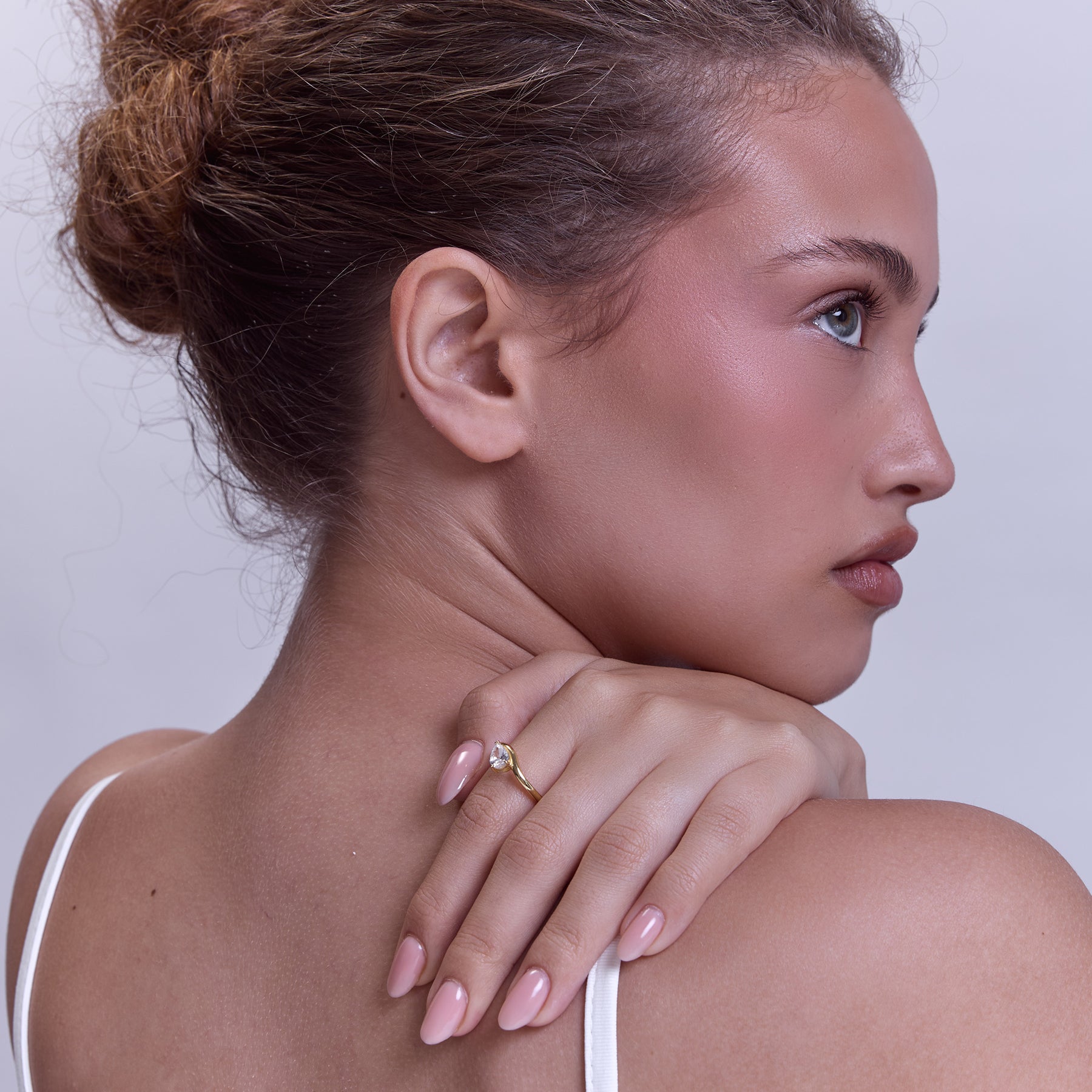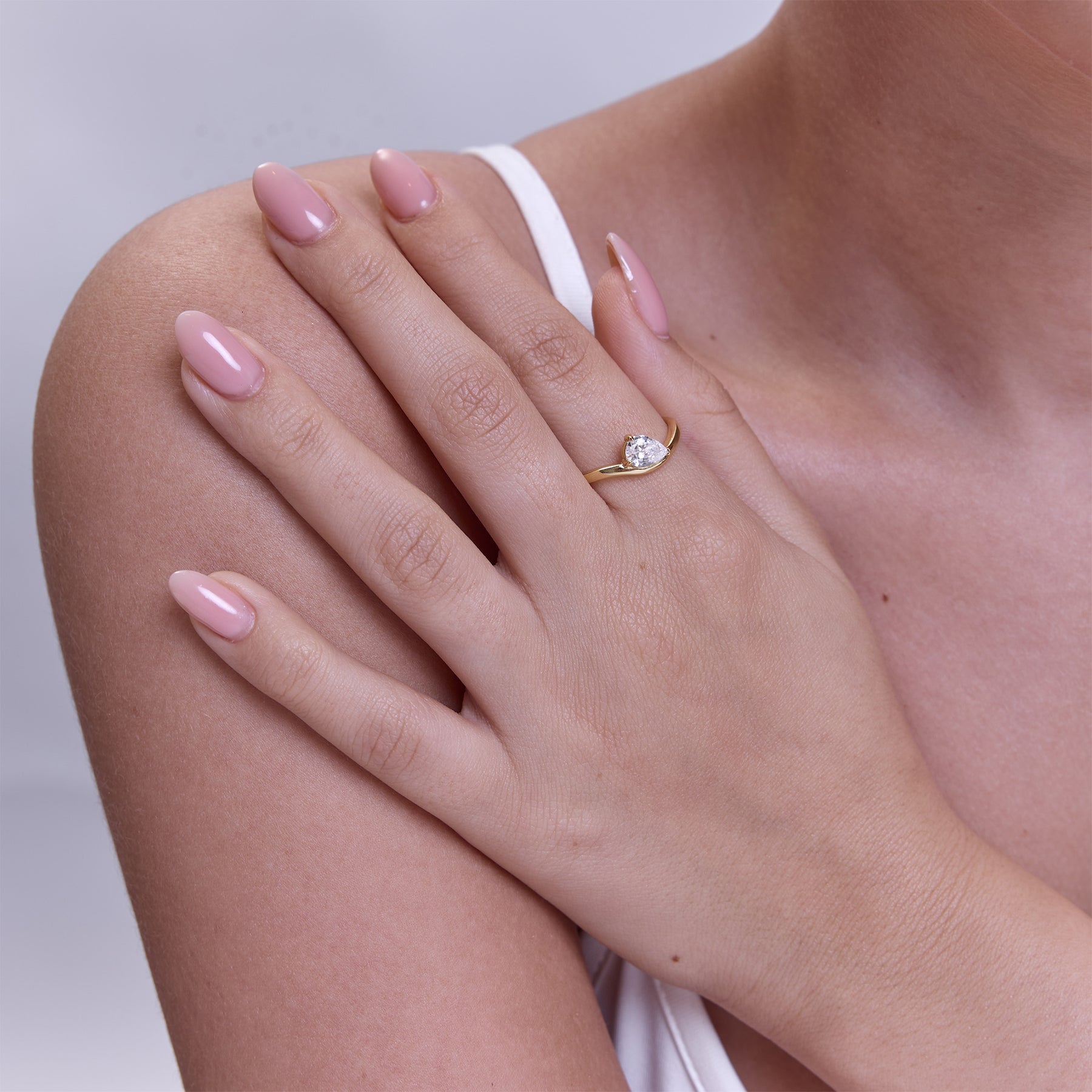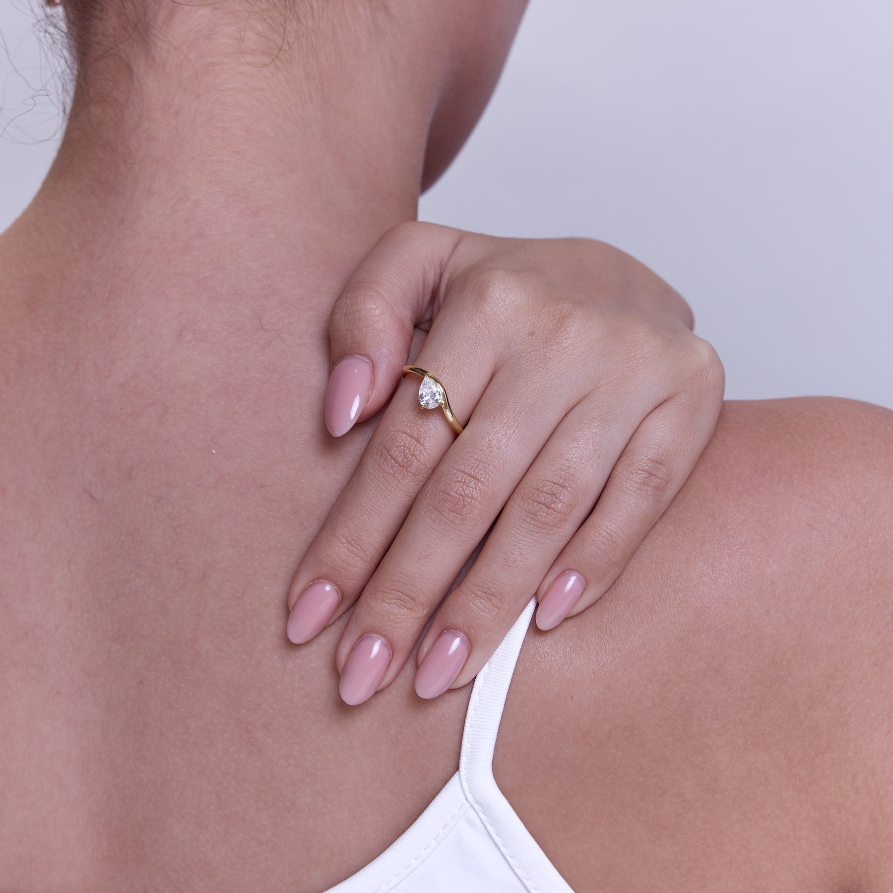 טבעת סנטר ייחודית משובצת זירקון בצורת טיפה, בעיצוב מעודן וזורם, ללוק בלתי נשכח. הטבעת עשויה בעבודת יד מכסף סטרלינג 925 ומצופה בזהב 14K.
