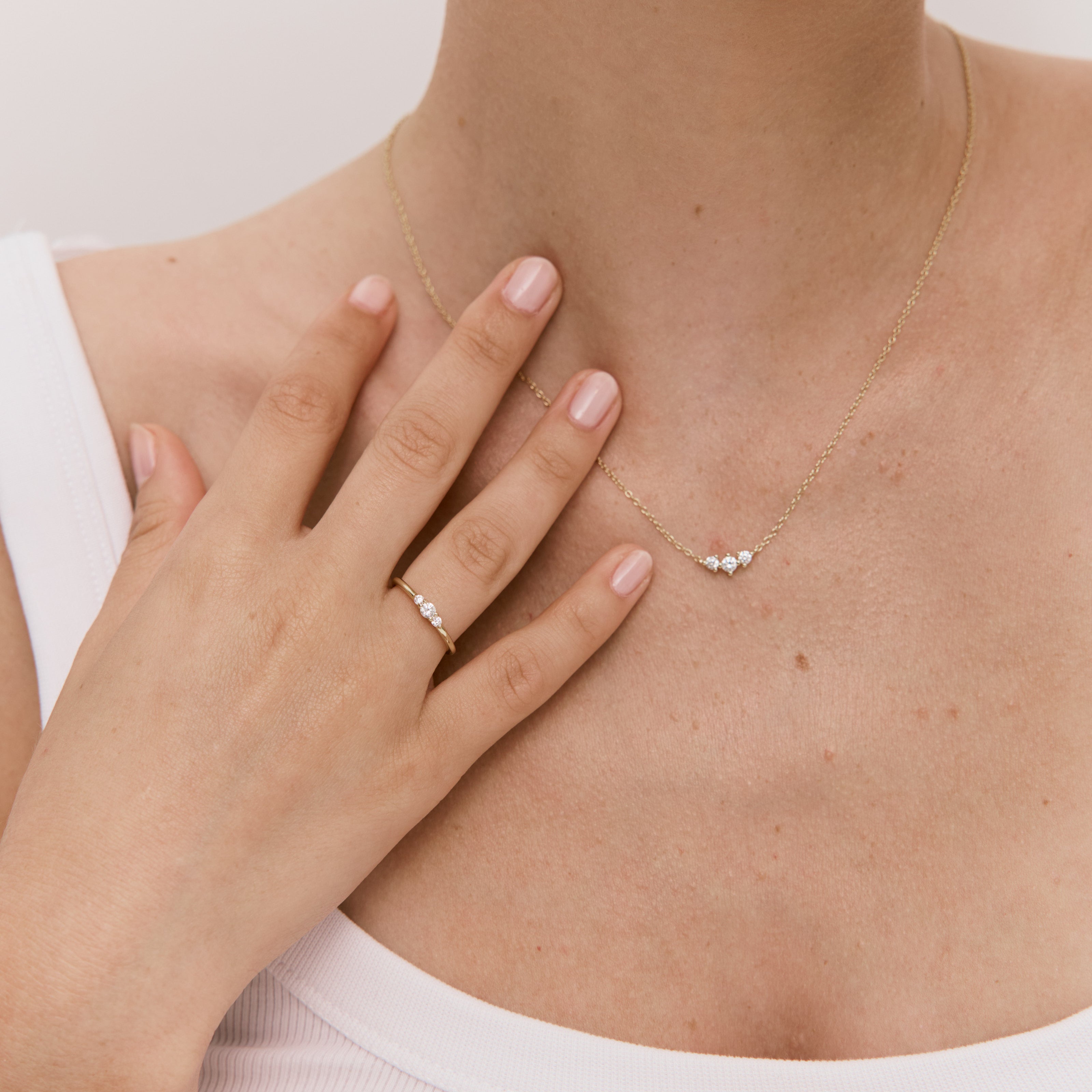 טבעת עדינה משובצת בשלישיית זירקונים, בעיצוב נקי וקלאסי. הטבעת עשויה בעבודת יד מכסף סטרלינג 925 ומצופה בזהב 14K.