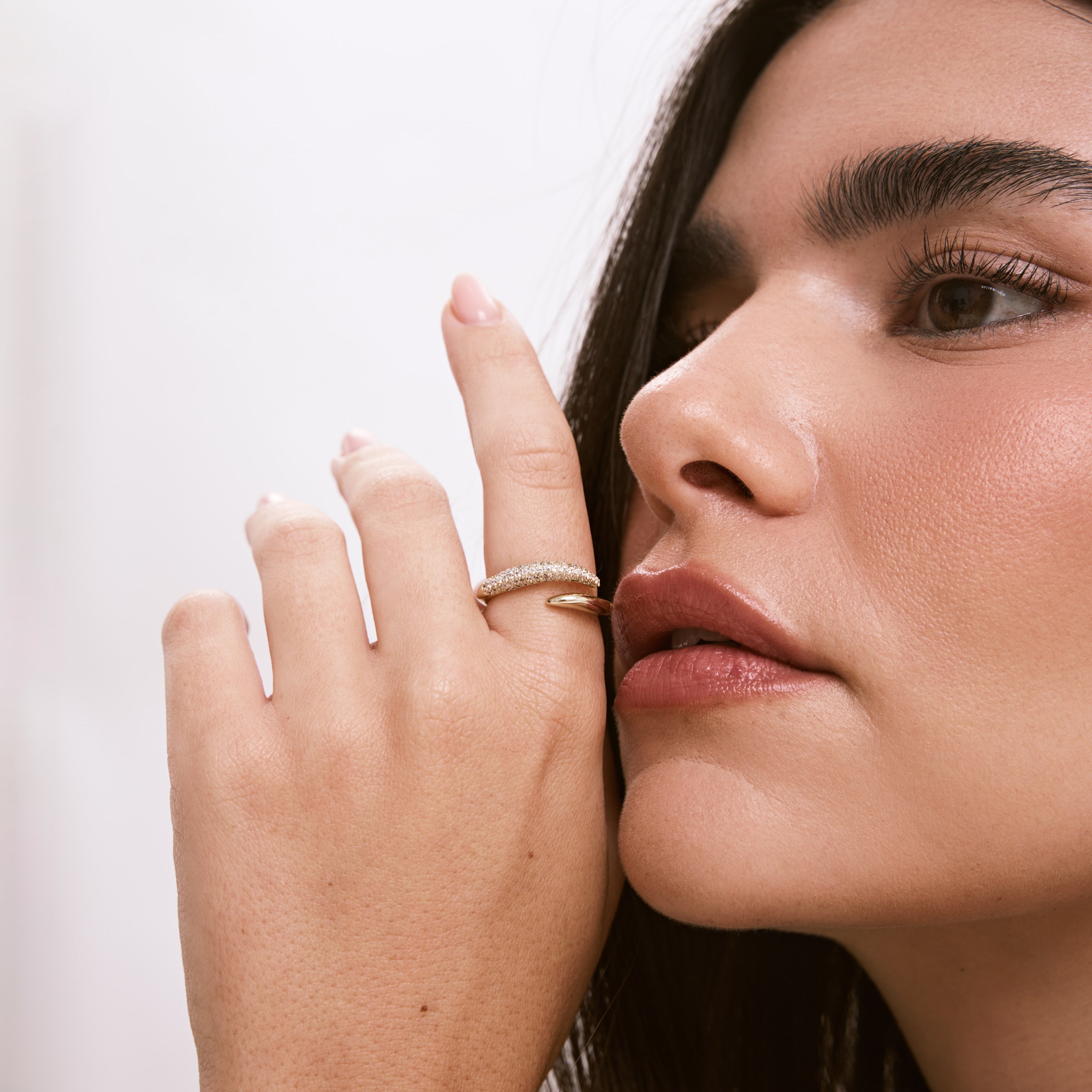 טבעת מתכווננת בעיצוב יוקרתי ואלגנטי, משובצת בזירקונים מנצנצים ללוק על-זמני ומדויק. הטבעת עשויה בעבודת יד ומצופה בזהב 14K.