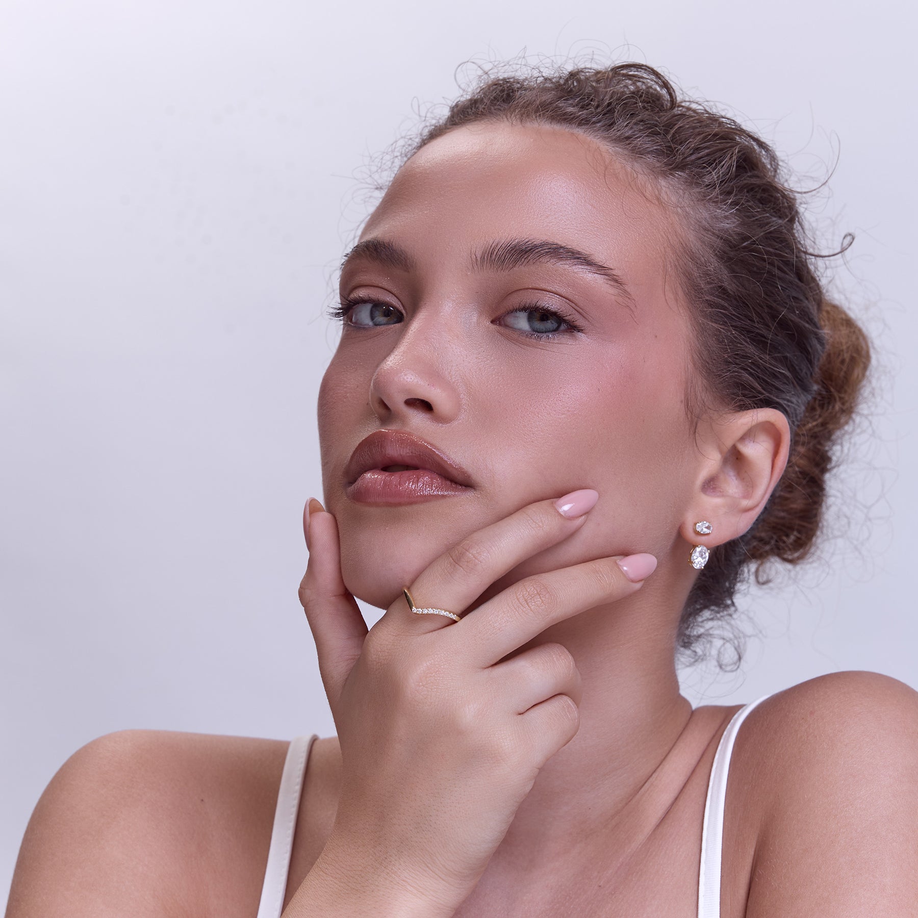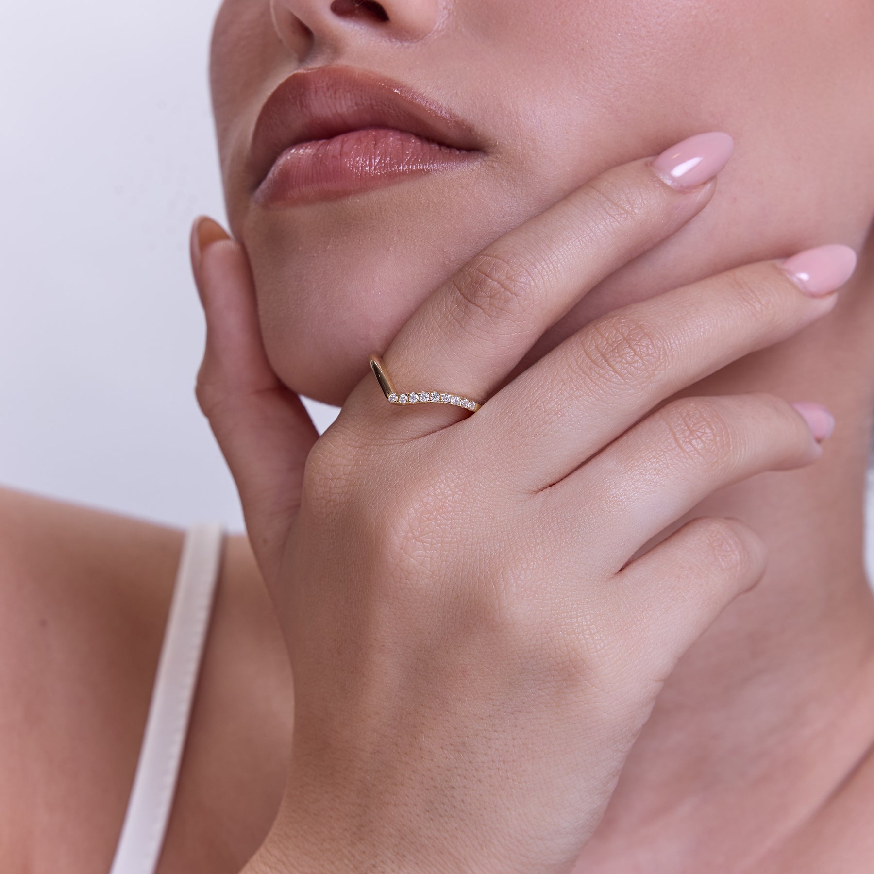 טבעת וי עדינה עם חלק משובץ בזירקונים נוצצים, בעיצוב טרנדי ומושלם שניתן לענוד לבד או עם טבעת נוספת. הטבעת עשויה בעבודת יד מכסף סטרלינג 925 ומצופה בזהב 14K.