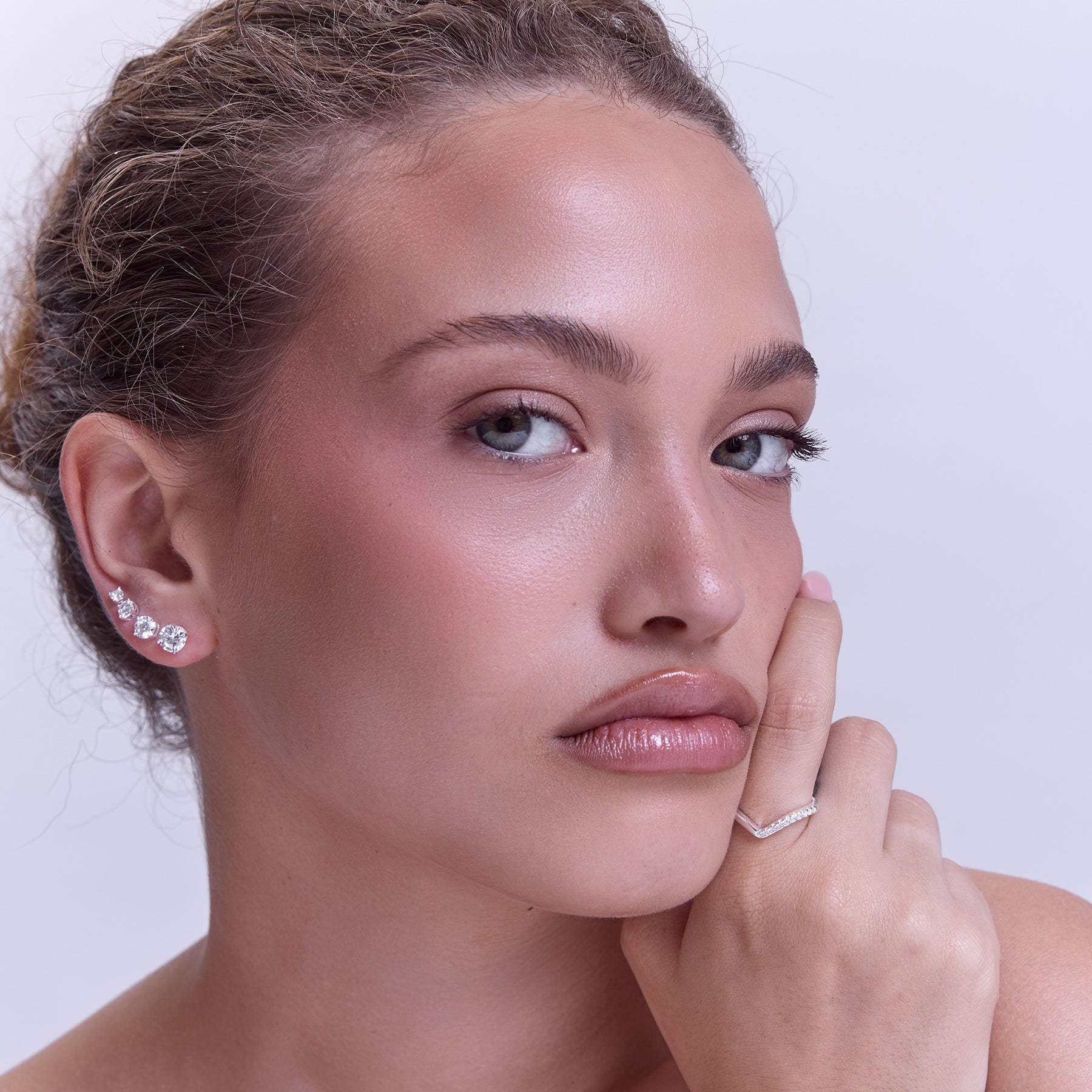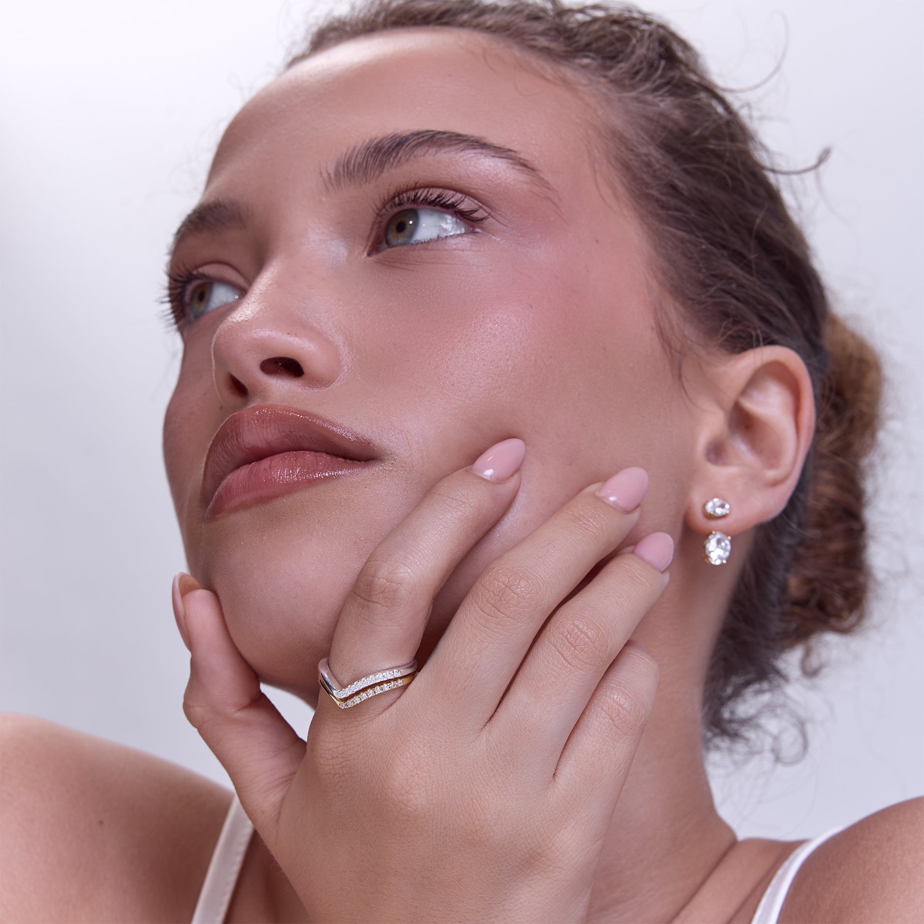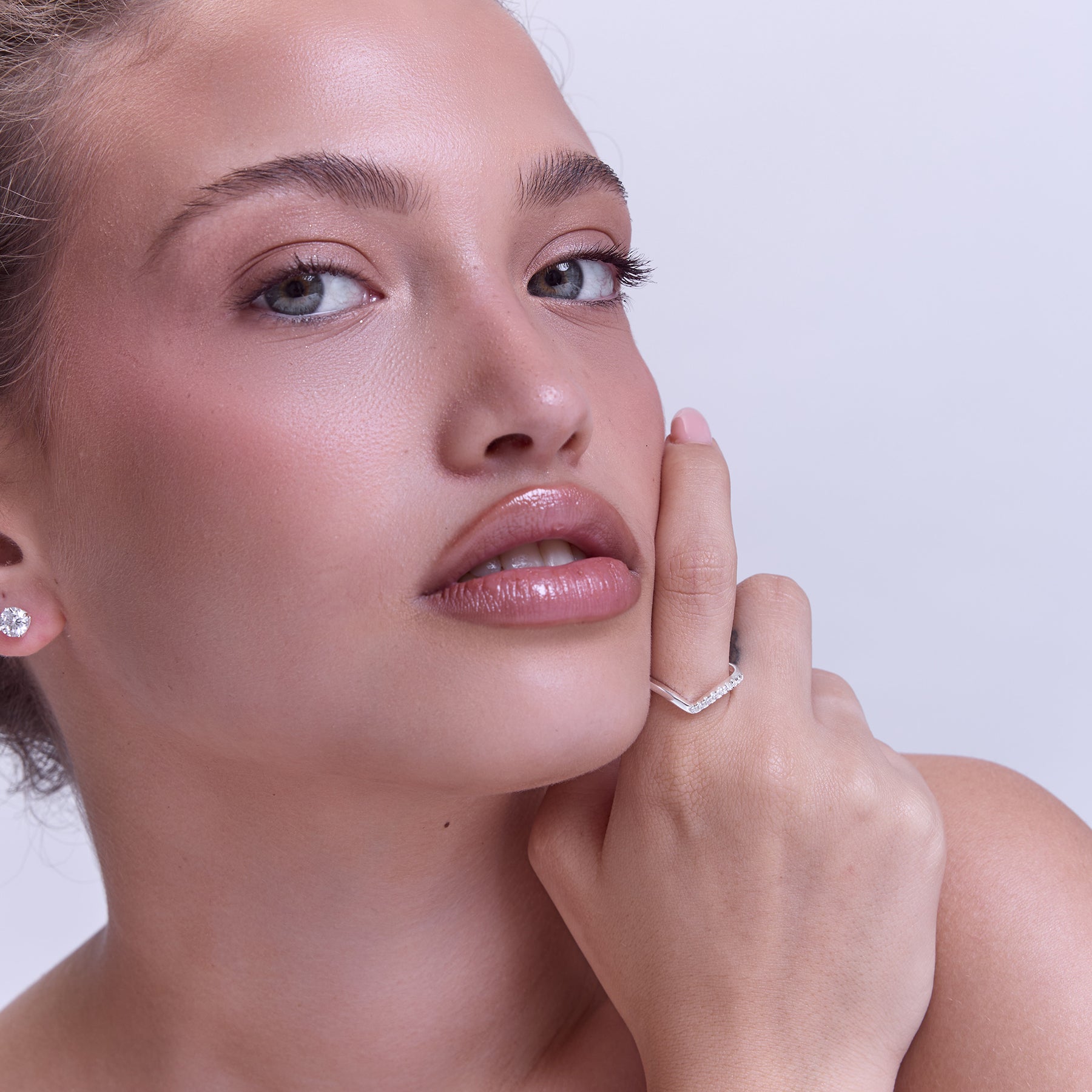 טבעת וי עדינה עם חלק משובץ בזירקונים נוצצים, בעיצוב טרנדי ומושלם שניתן לענוד לבד או עם טבעת נוספת. הטבעת עשויה בעבודת יד מכסף סטרלינג 925 ומצופה בכסף טהור.