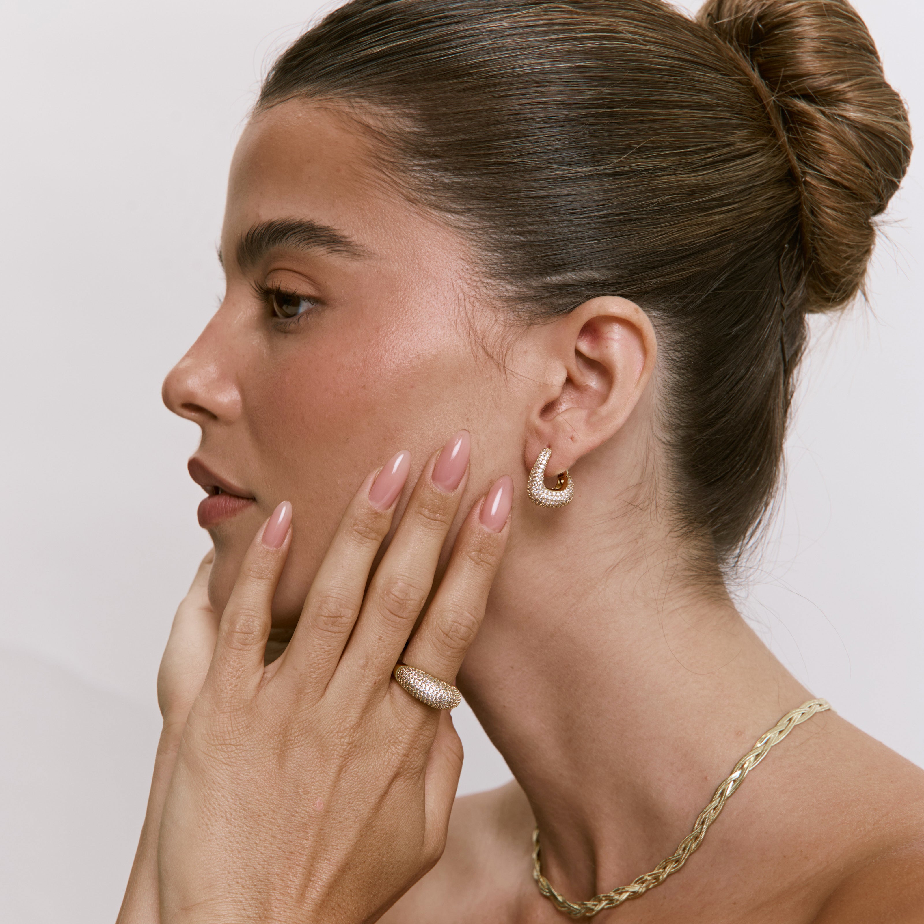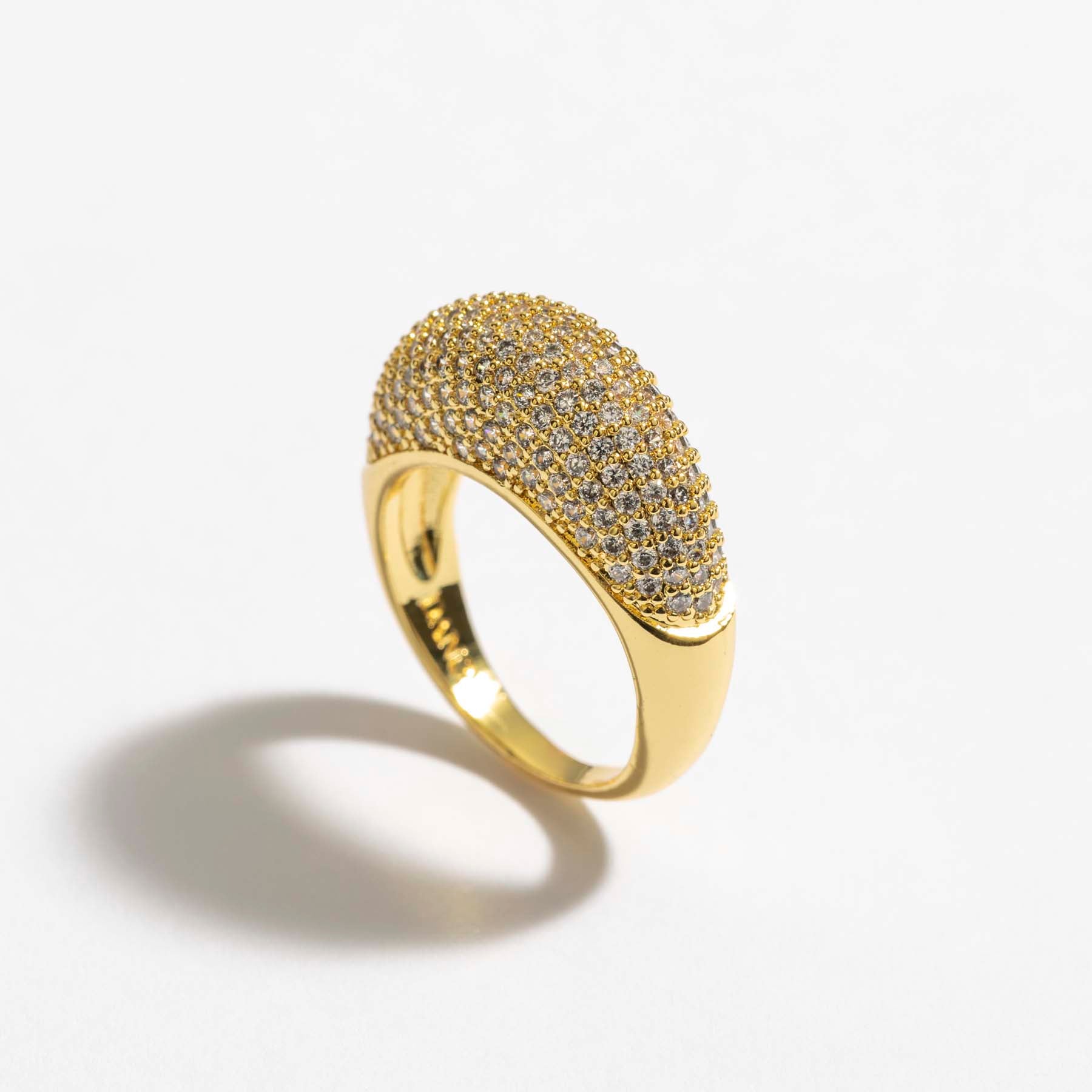 טבעת סנטר מרשימה ומלאה בזירקונים בשיבוץ פווה, בעיצוב אלגנטי ומלא נוכחות. הטבעת עשויה בעבודת יד ומצופה בזהב 14K.