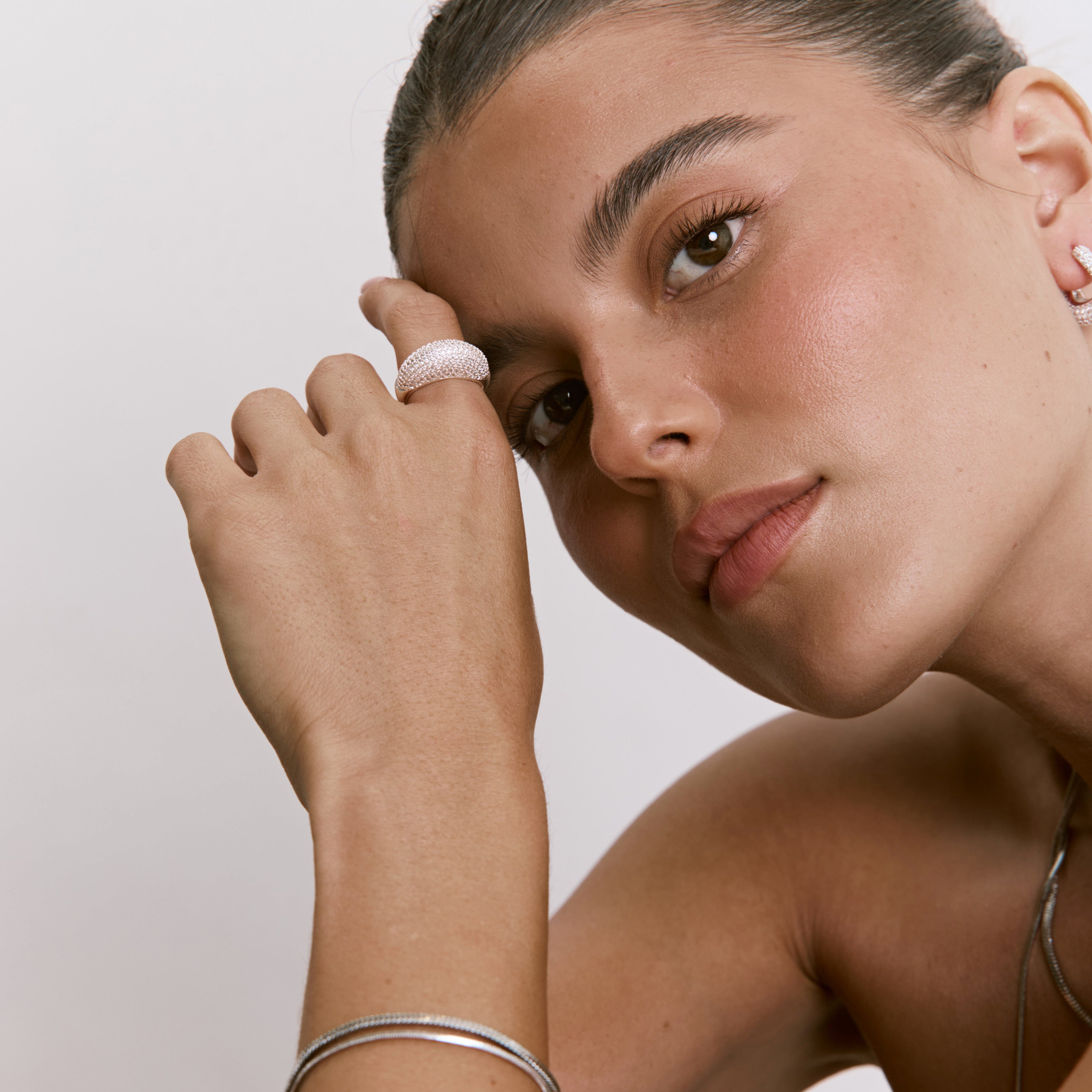 טבעת סנטר מרשימה ומלאה בזירקונים בשיבוץ פווה, בעיצוב אלגנטי ומלא נוכחות. הטבעת עשויה בעבודת יד ומצופה בכסף טהור.