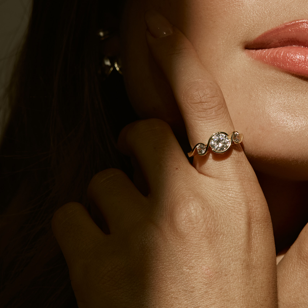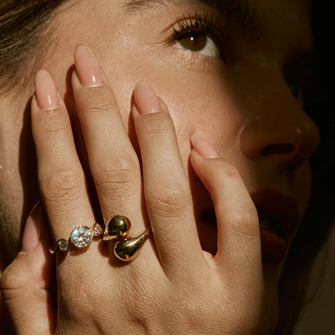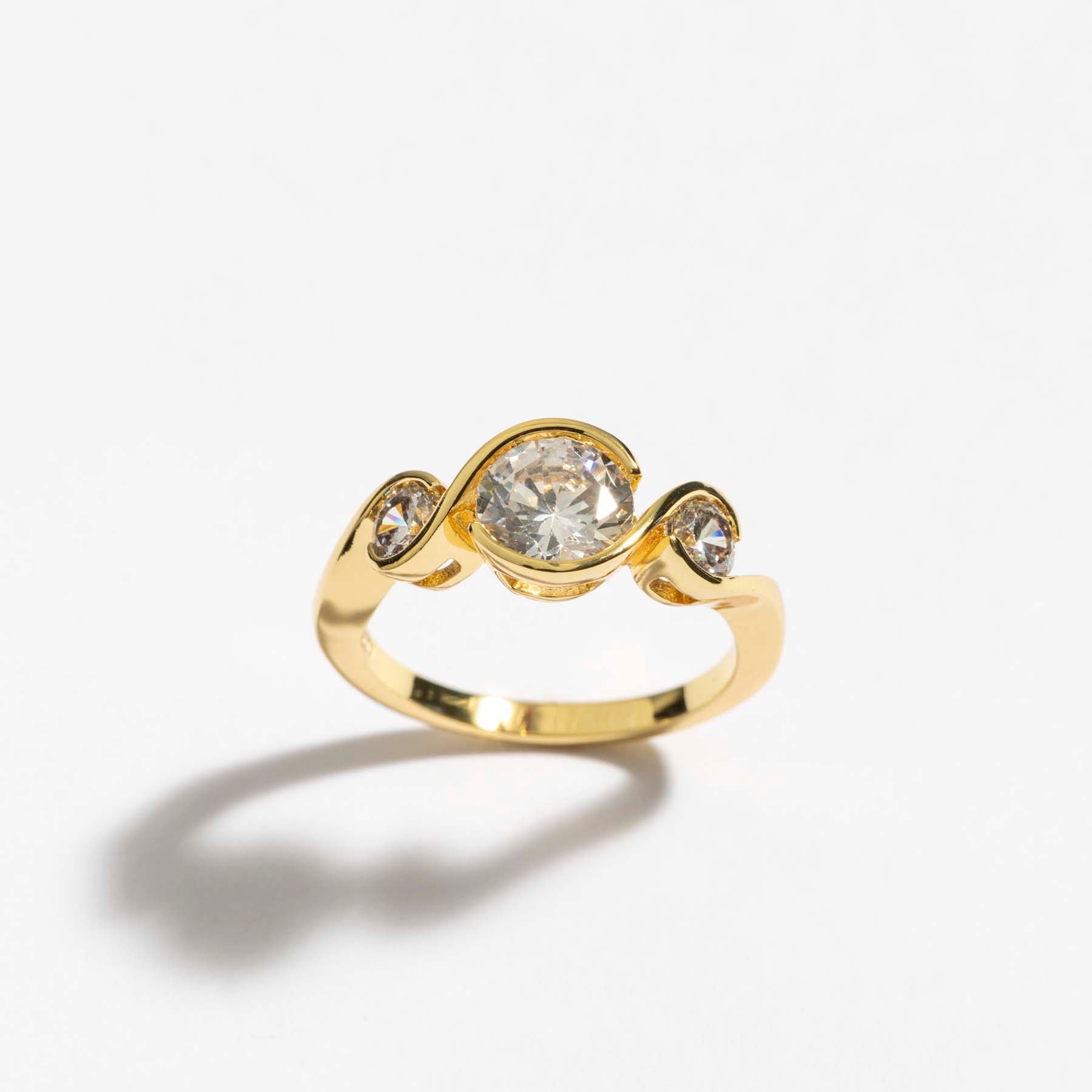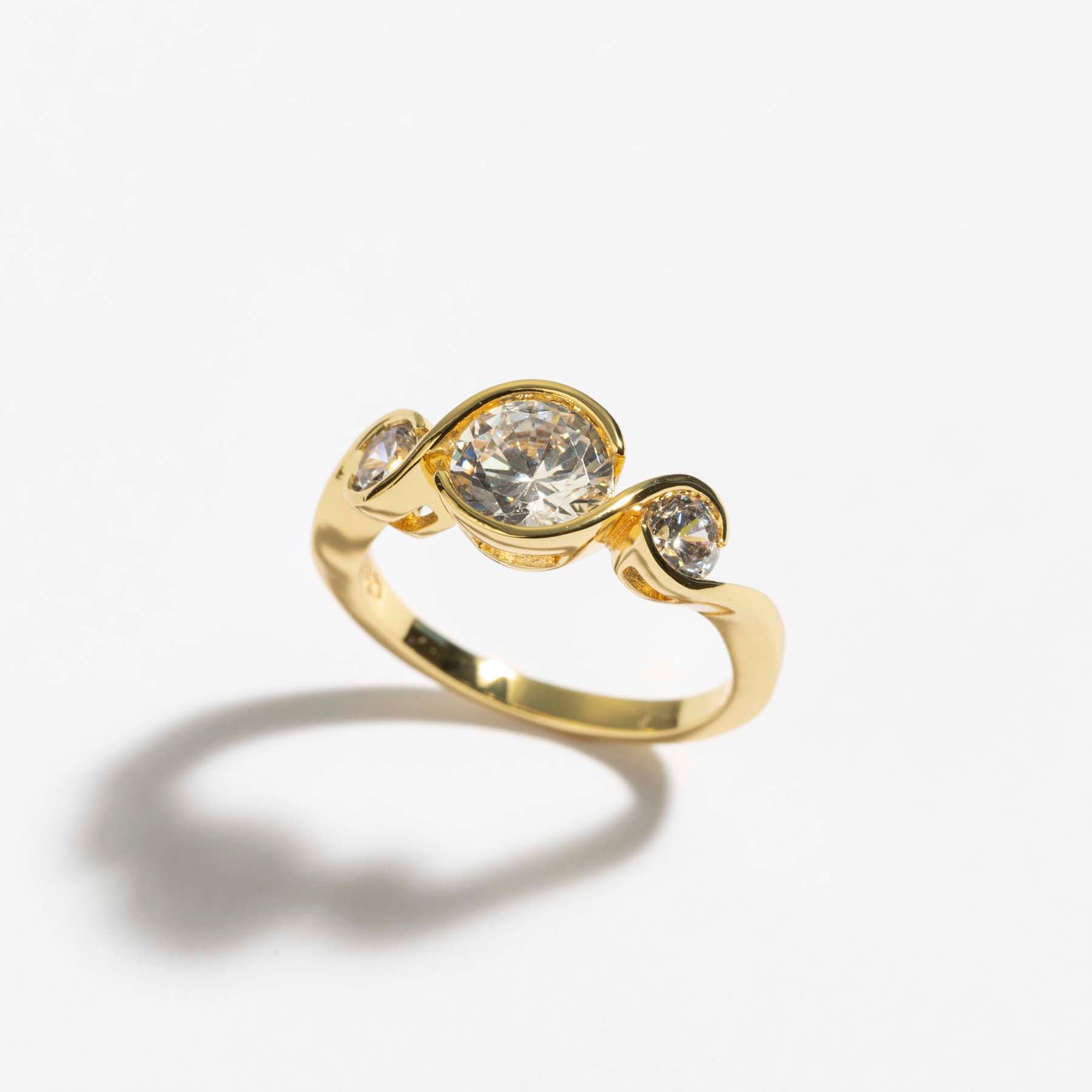 טבעת סנטר משובצת בשלישיית זירקונים בעיצוב ייחודי, יוקרתי ומלא סטייל. הטבעת עשויה בעבודת יד ומצופה בזהב 14K.