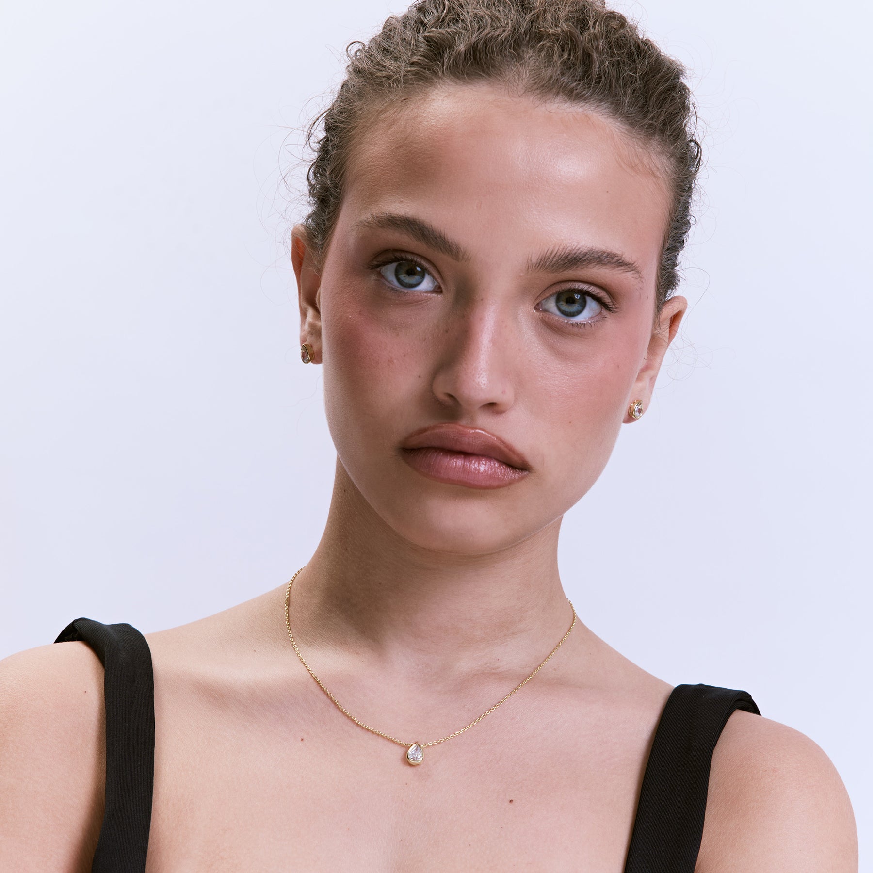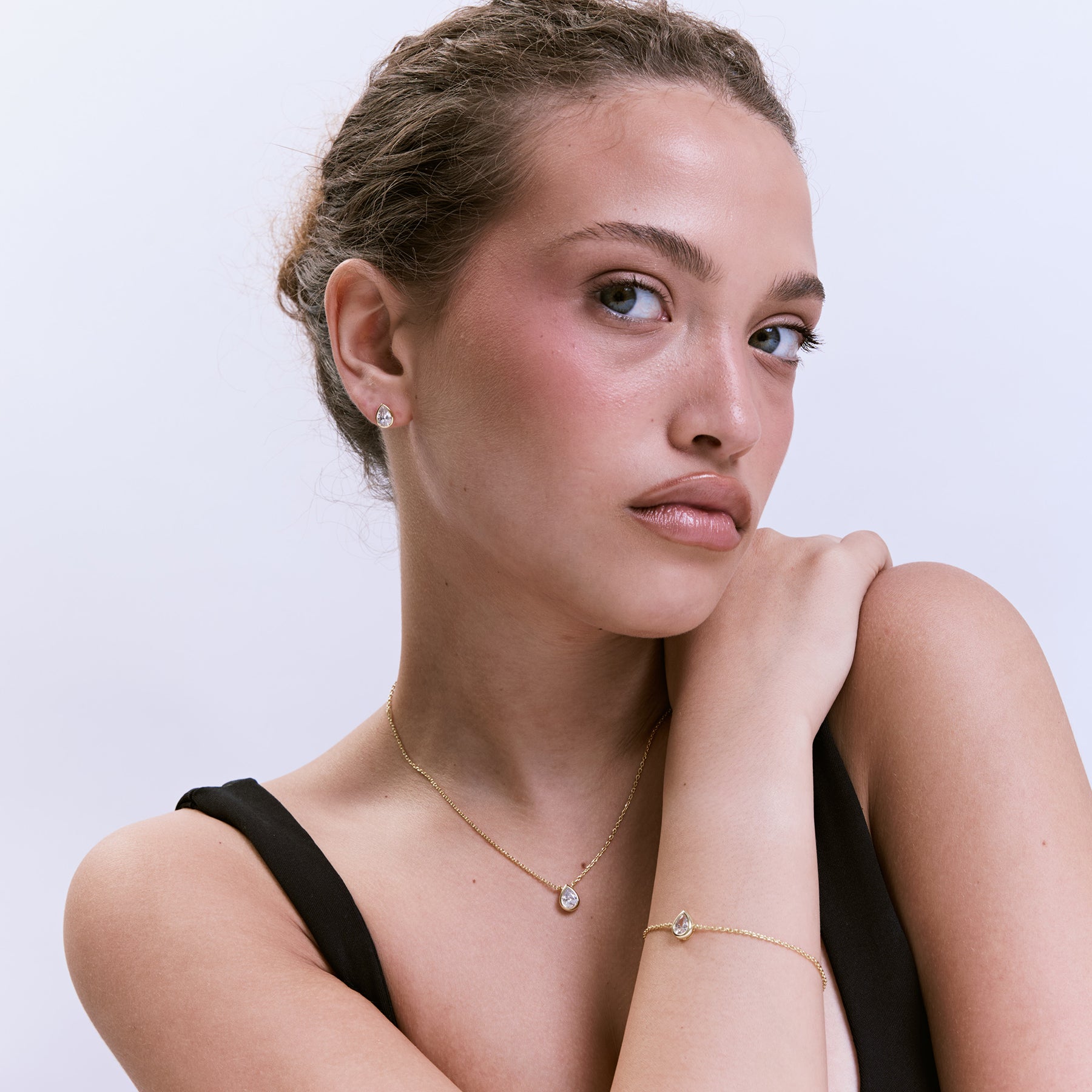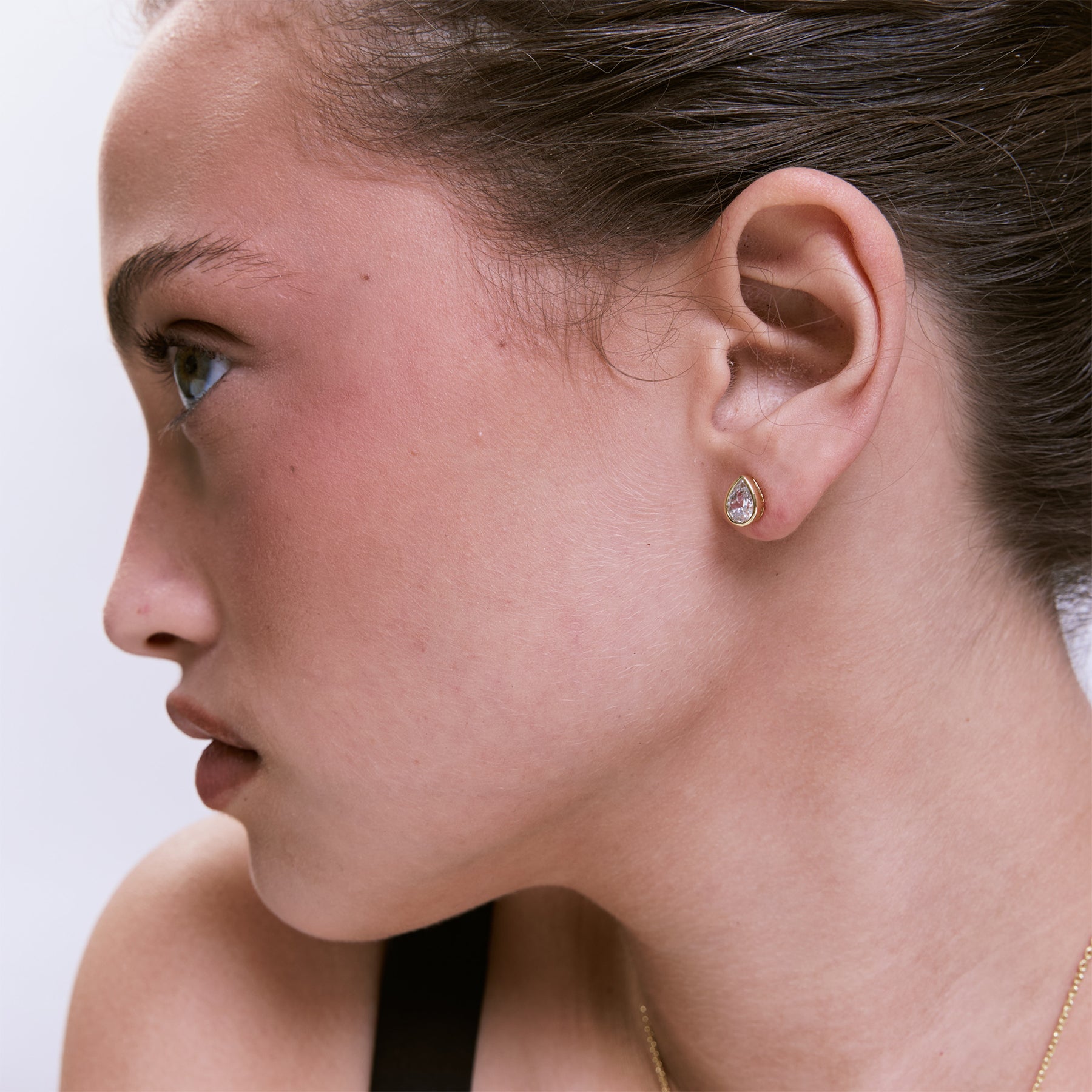 עגילים קלאסיים צמודים משובצים בזירקון בצורת טיפה, בעיצוב נקי ואלגנטי. העגילים עשויים בעבודת יד ומצופים בזהב 14K.