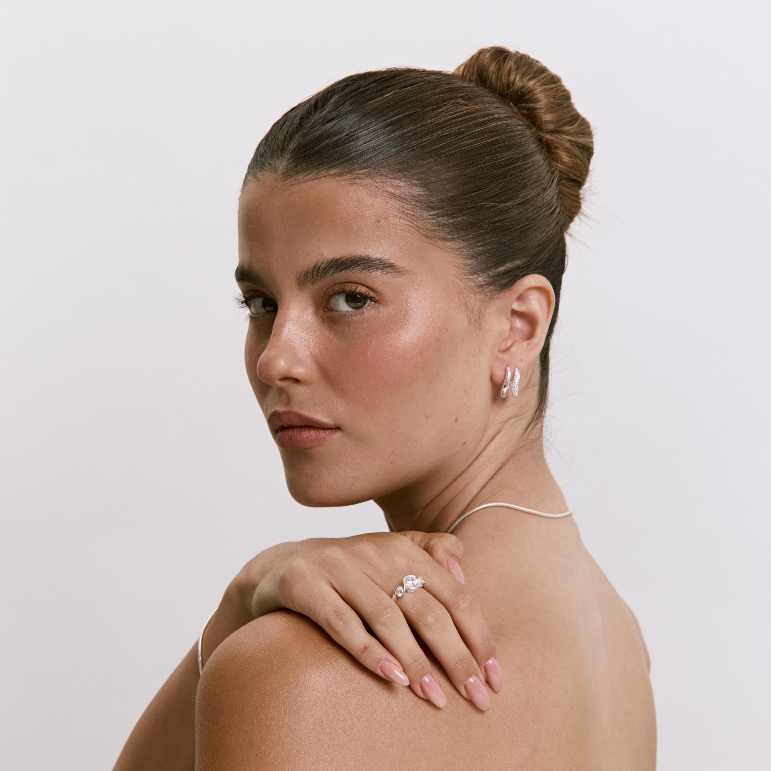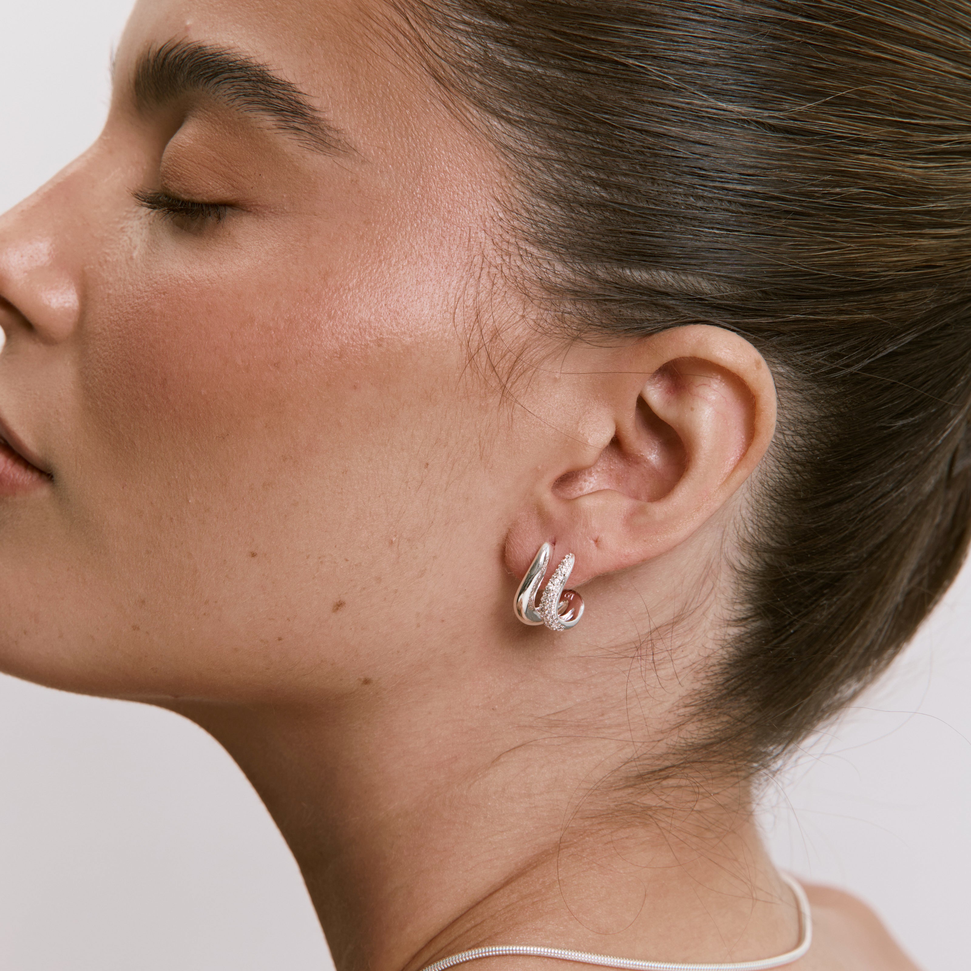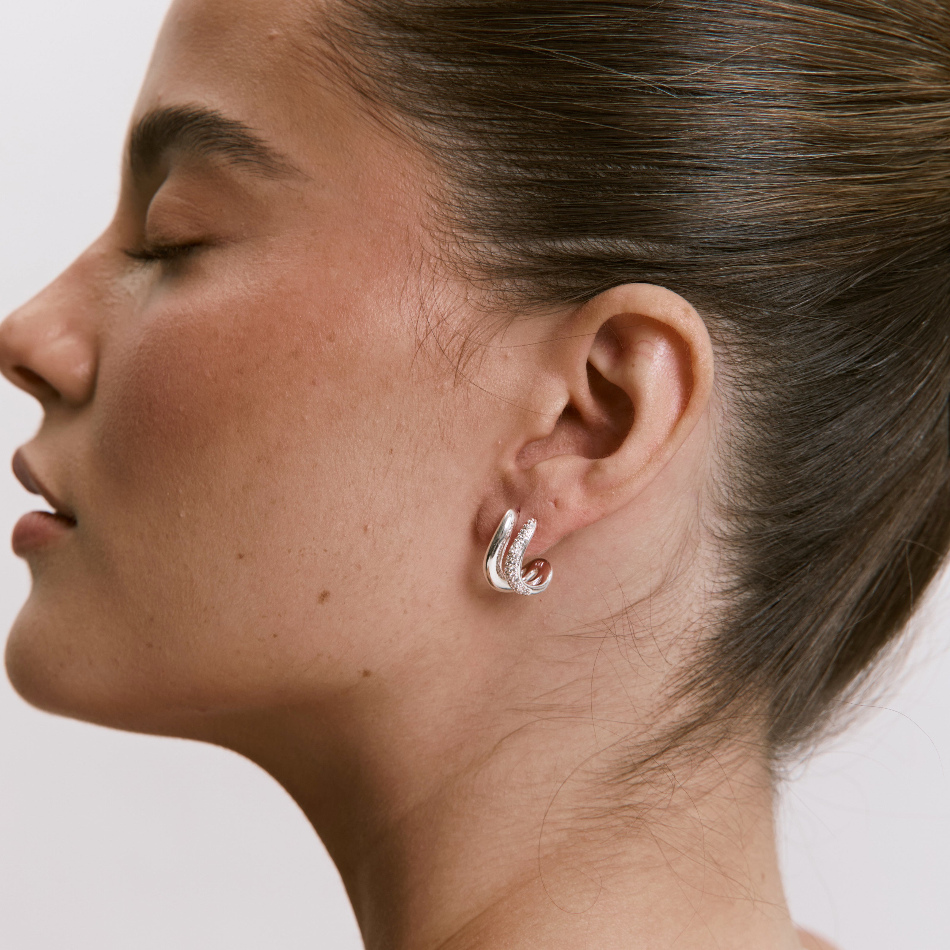 עגילים כפולים עם פס בגימור מבריק וחלק ופס מכוסה בזירקונים מנצנצים, בעיצוב טרנדי, זורם ומלא סטייל. העגילים עשויים בעבודת יד ומצופים בכסף טהור.