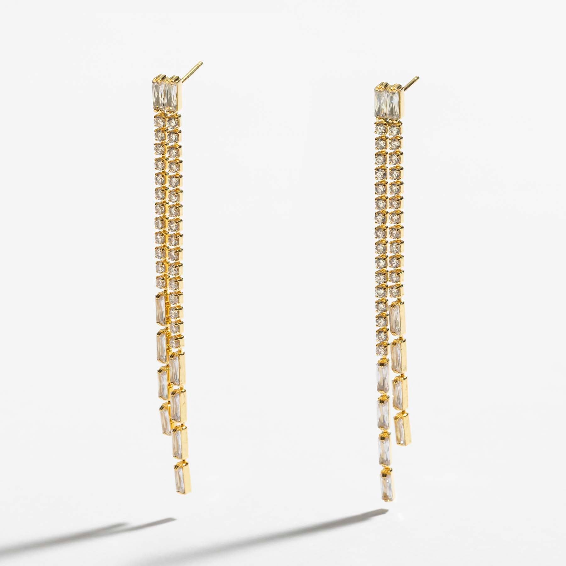 עגילים תלויים ארוכים, משובצים בזירקונים עגולים ומלבניים, בעיצוב אלגנטי ומלא גלאם. העגילים עשויים בעבודת יד ומצופים בזהב 14K.