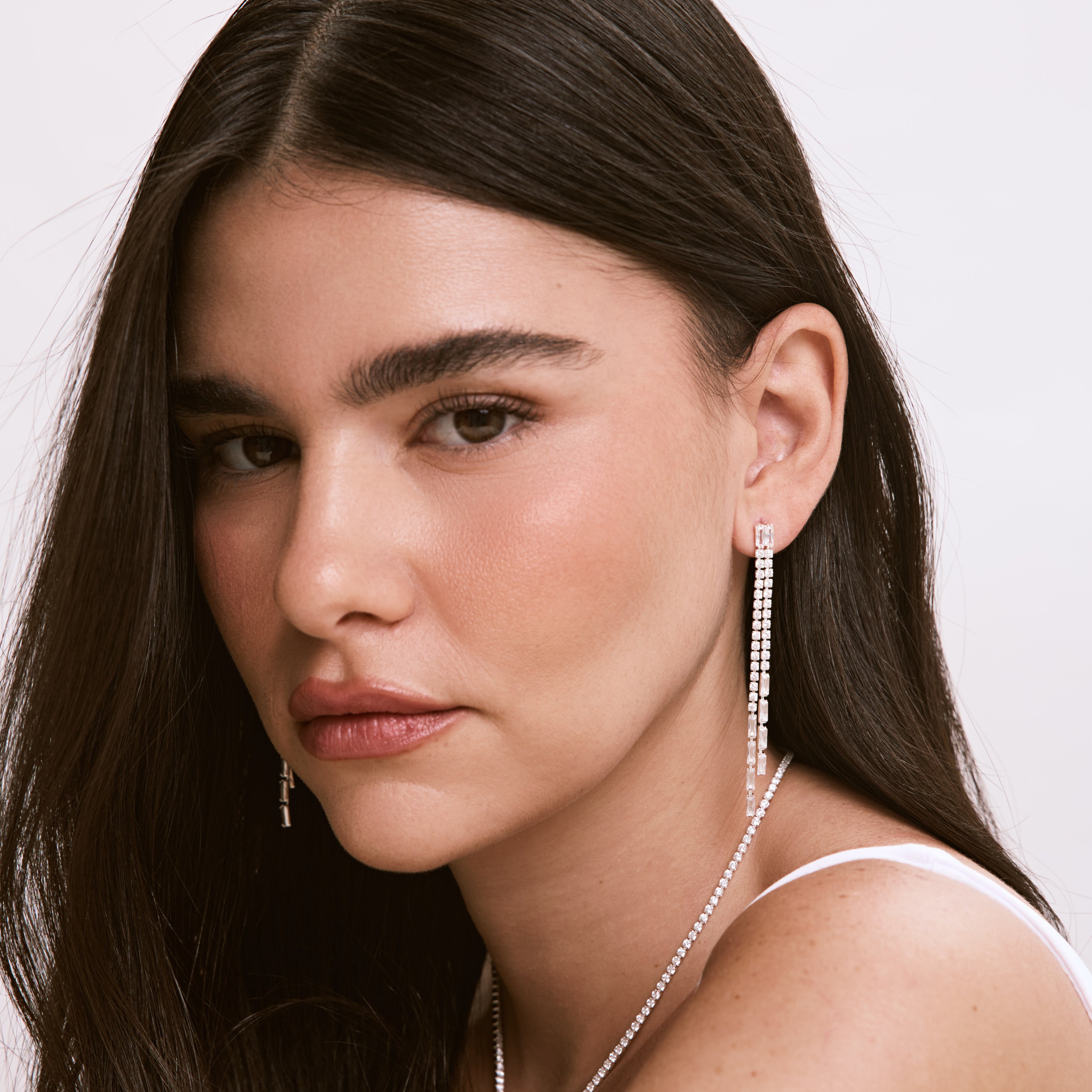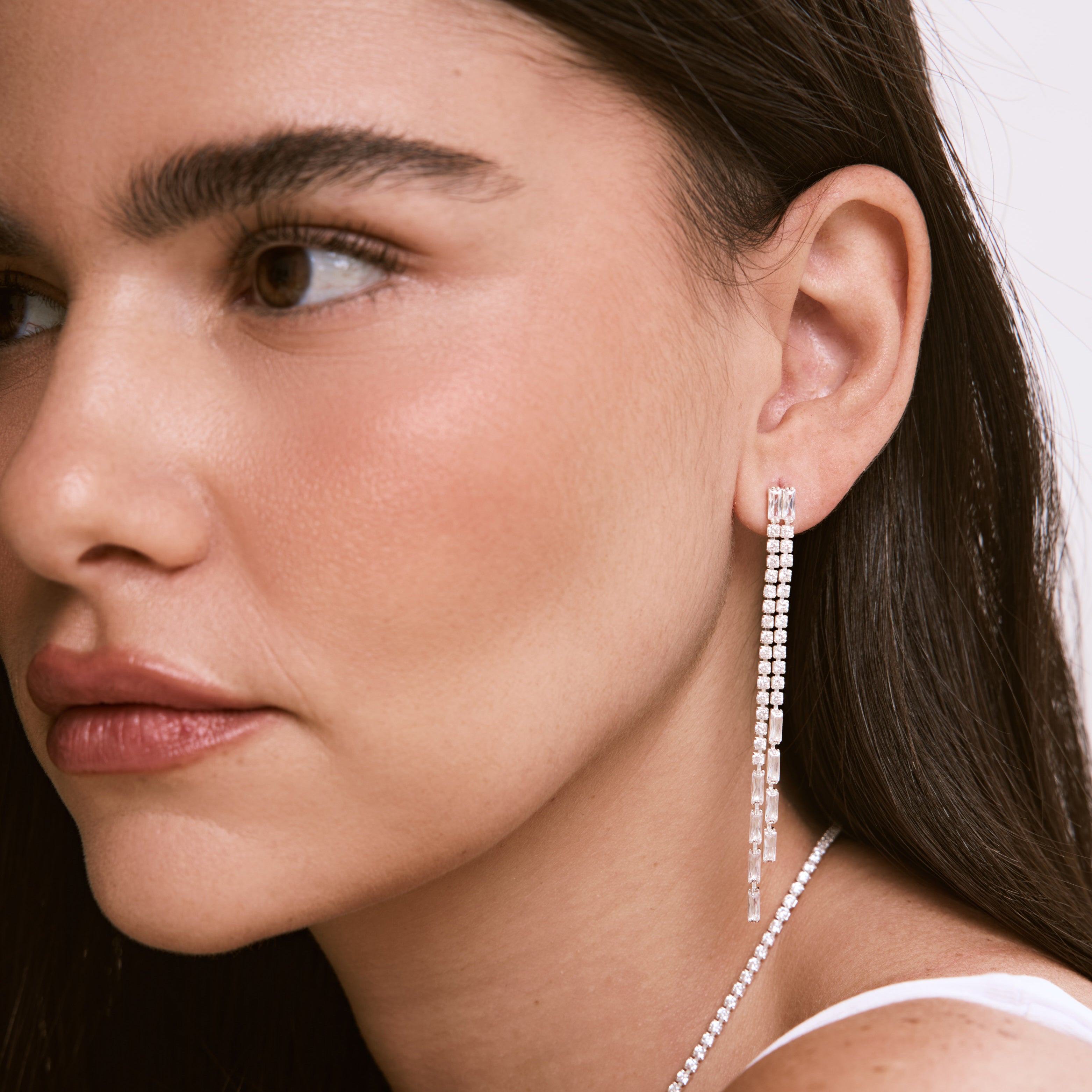 עגילים תלויים ארוכים, משובצים בזירקונים עגולים ומלבניים, בעיצוב אלגנטי ומלא גלאם. העגילים עשויים בעבודת יד ומצופים בכסף טהור.