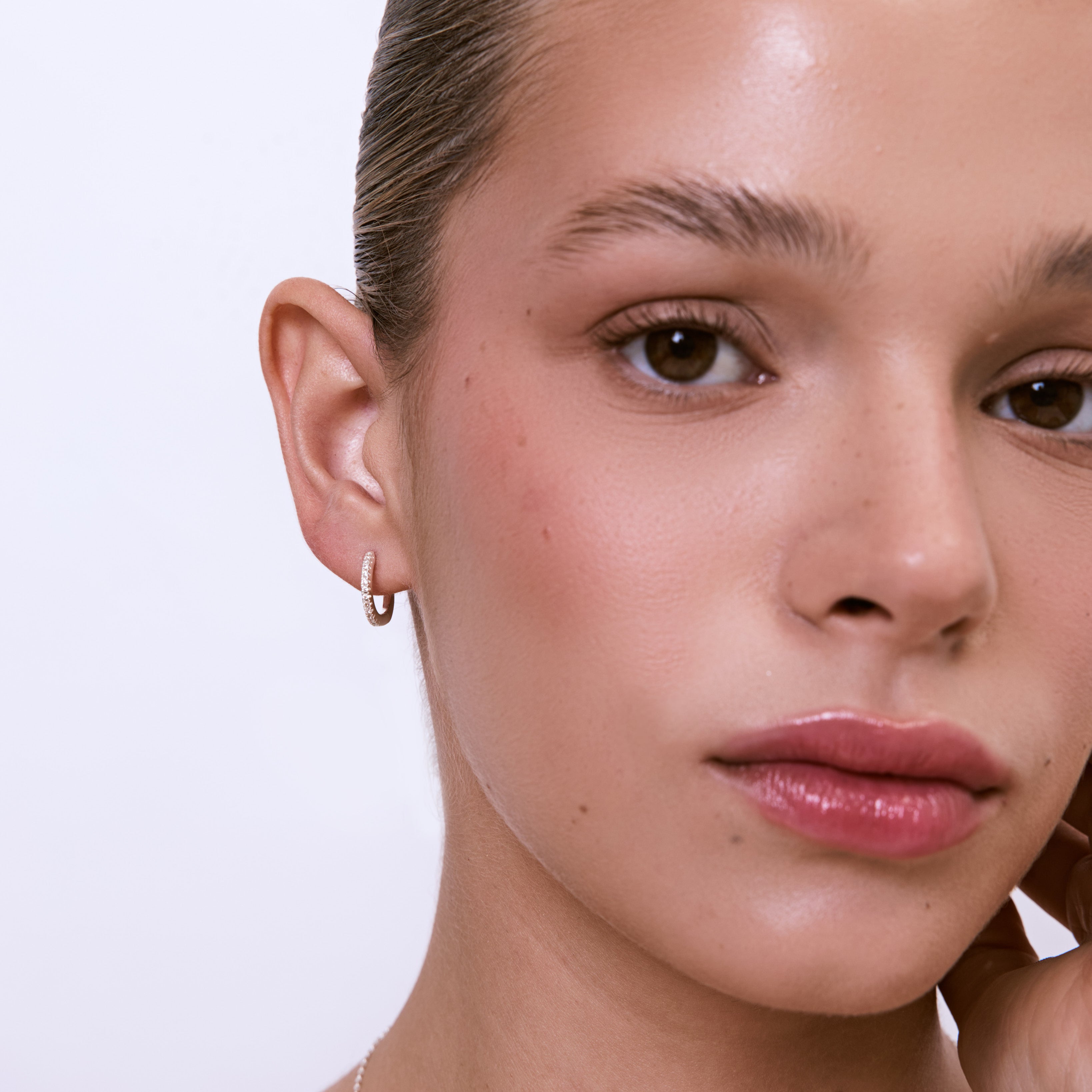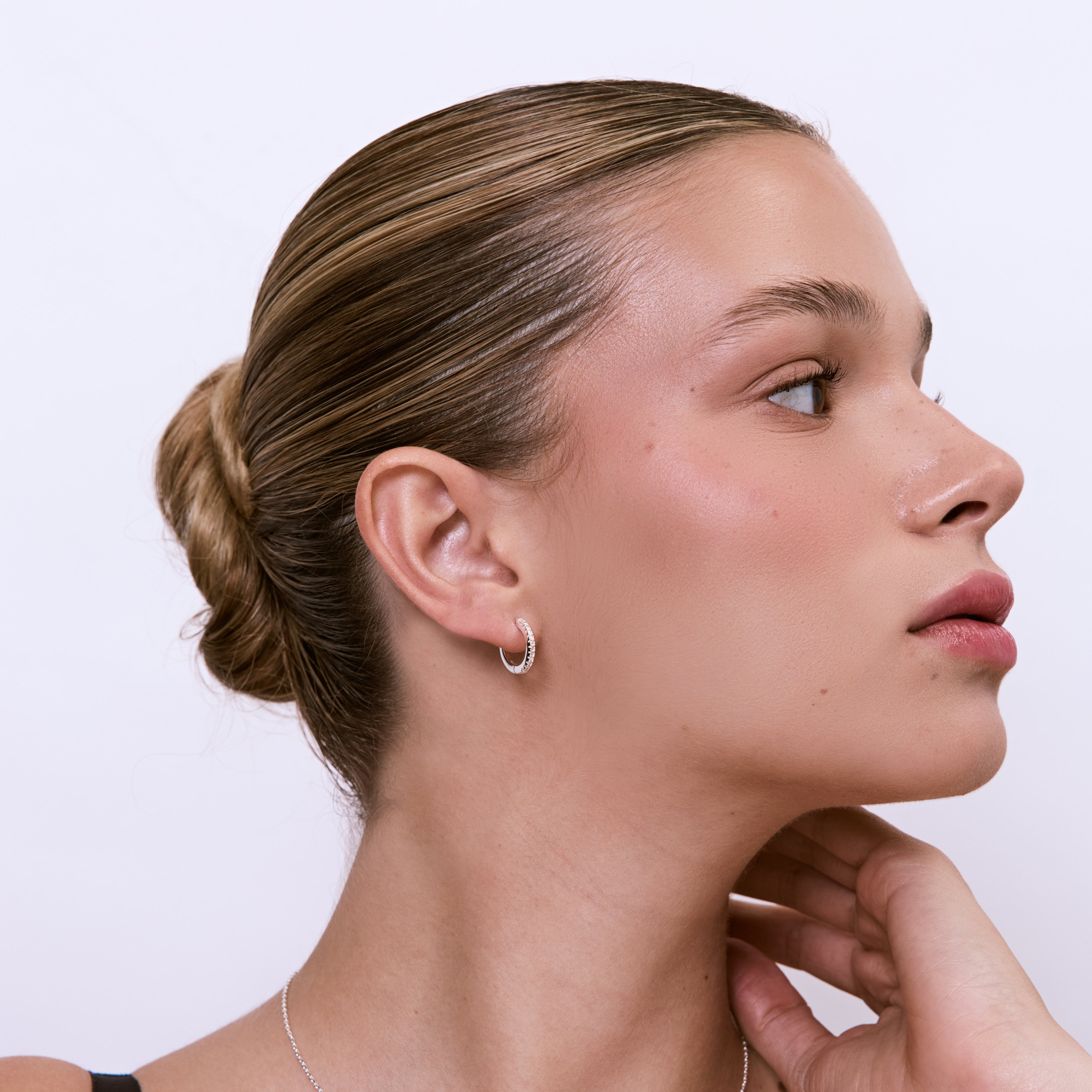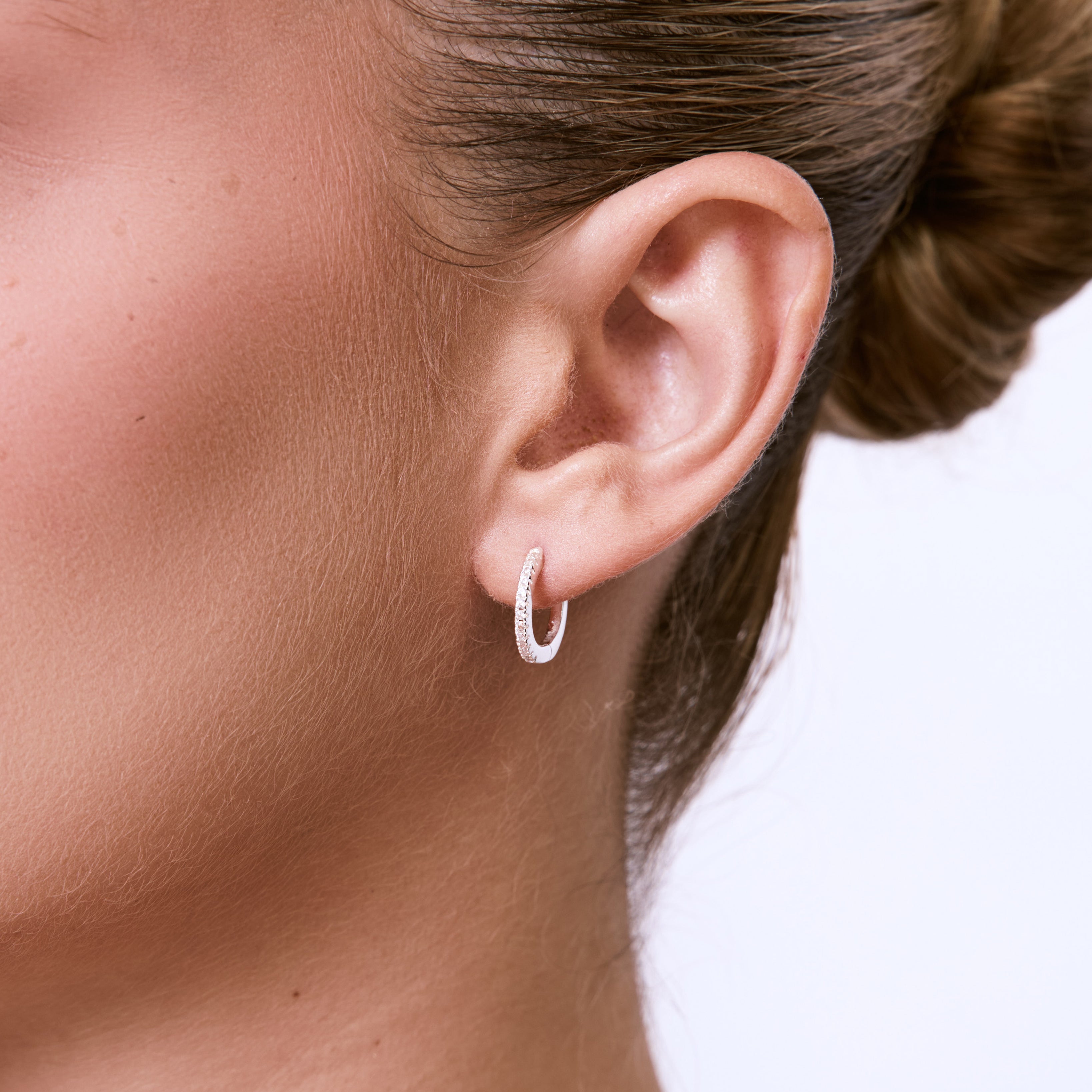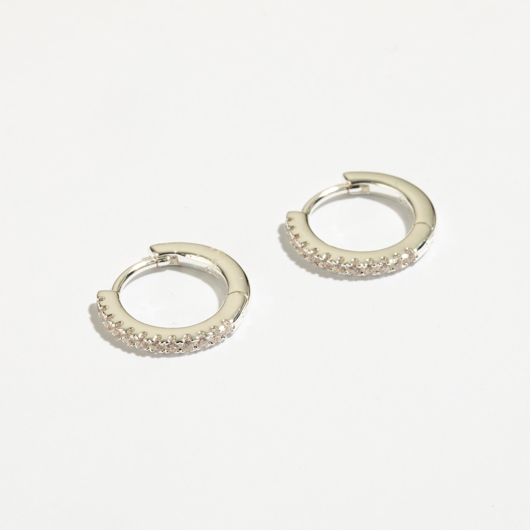 עגילי חישוק משובצים זירקונים מנצנצים בעיצוב קלאסי ואלגנטי, שלא ירדו לך מהאוזן. גודל בינוני. העגילים עשויים בעבודת יד ומצופים בכסף טהור.