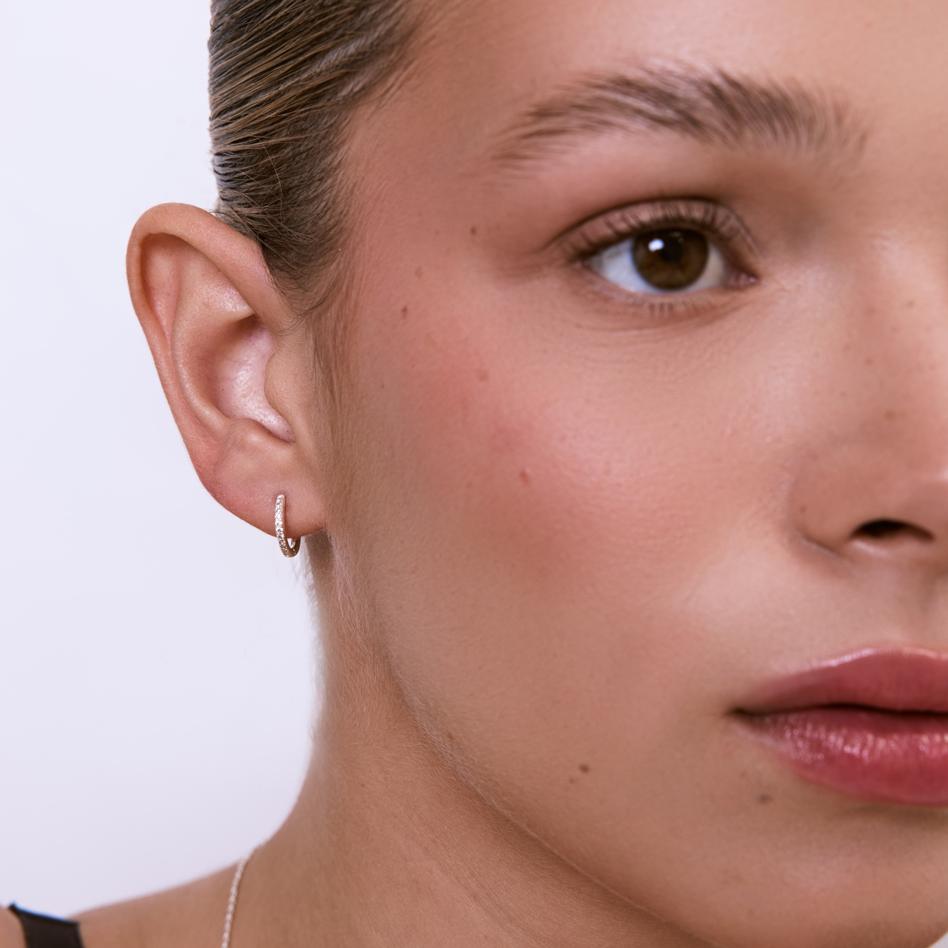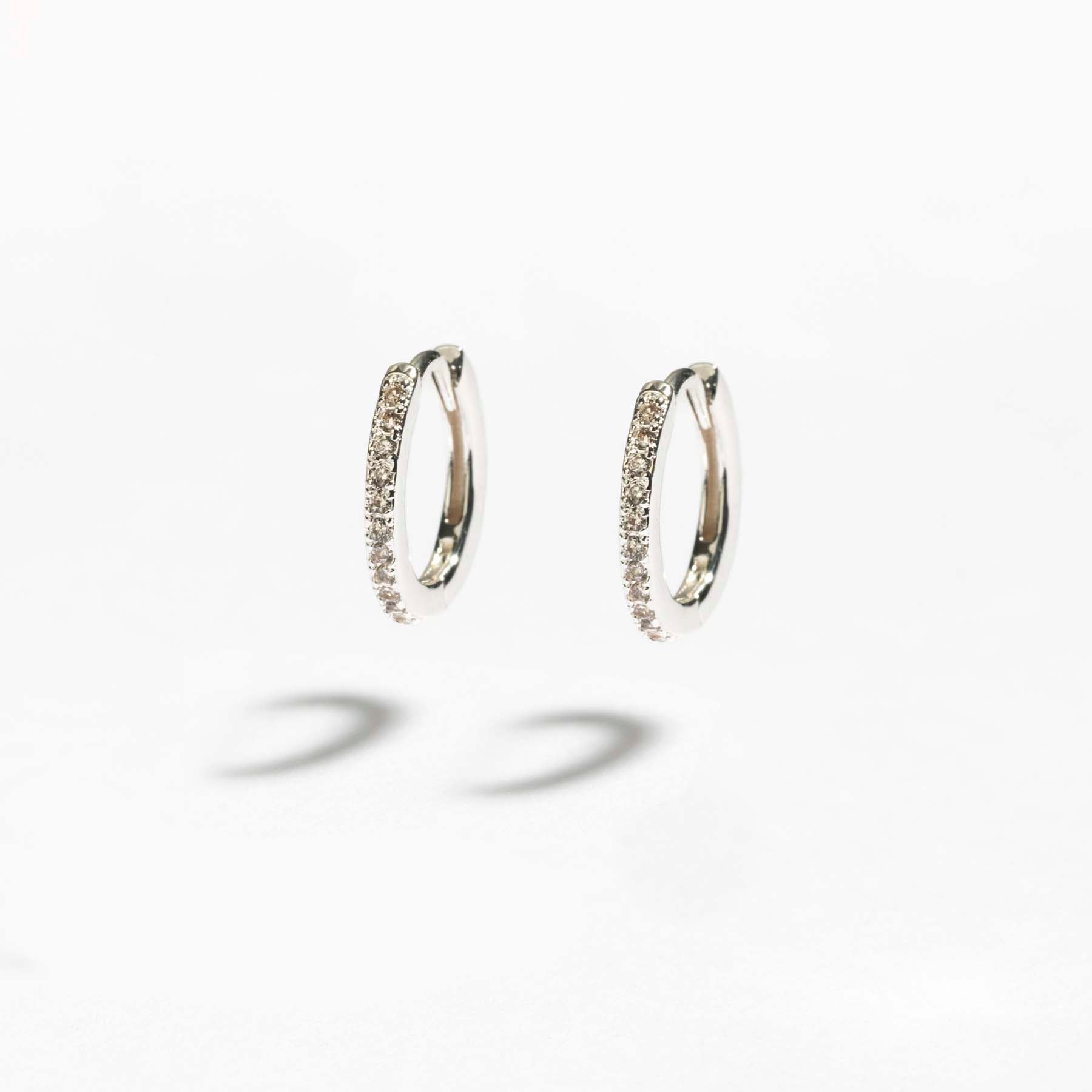 עגילי חישוק משובצים זירקונים מנצנצים בעיצוב קלאסי ואלגנטי, שלא ירדו לך מהאוזן. גודל קטן. העגילים עשויים בעבודת יד ומצופים בכסף טהור.