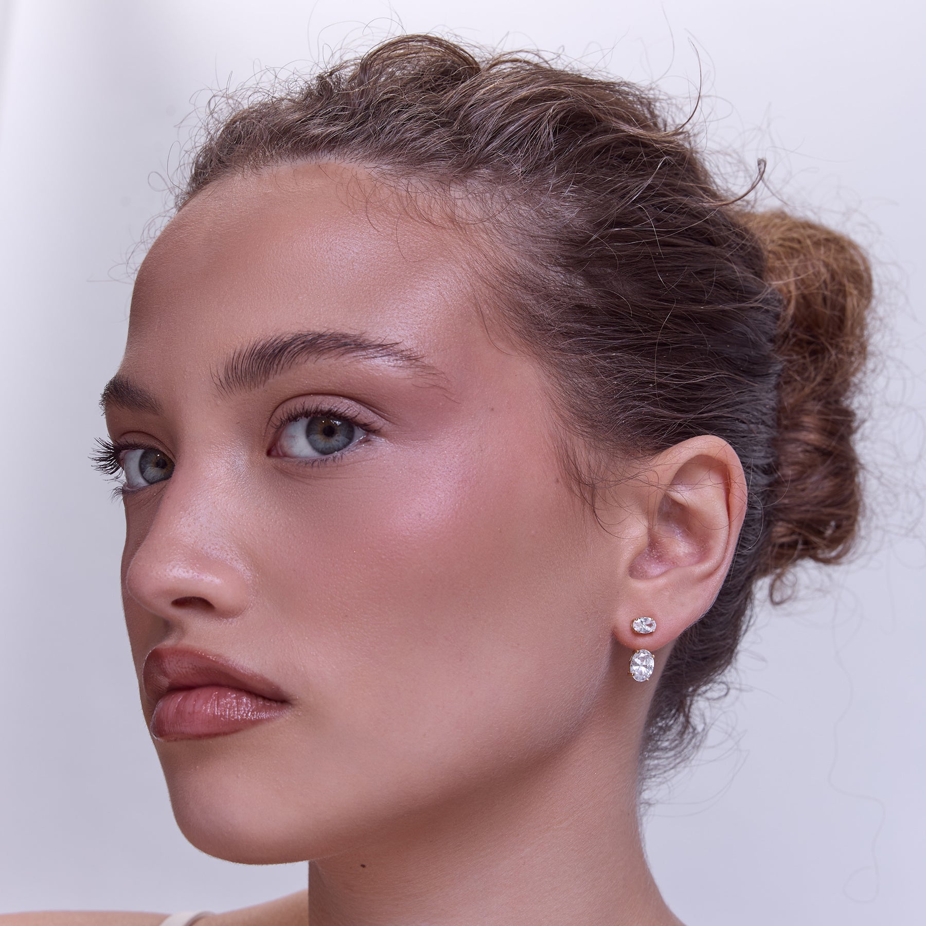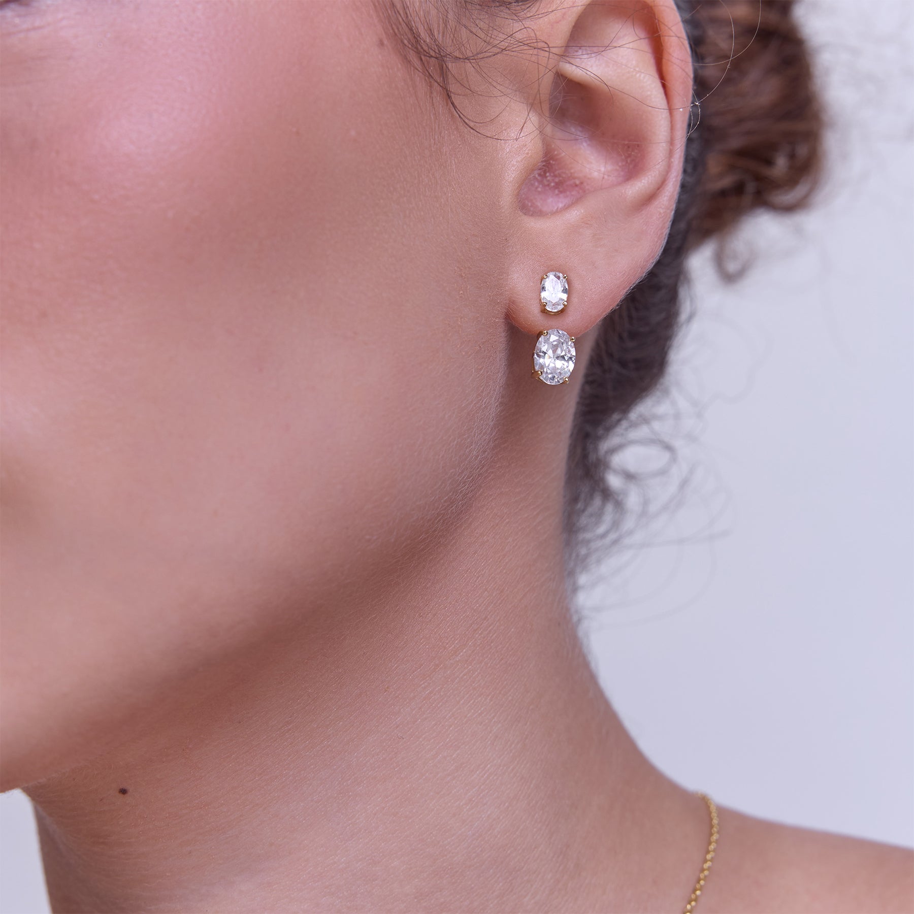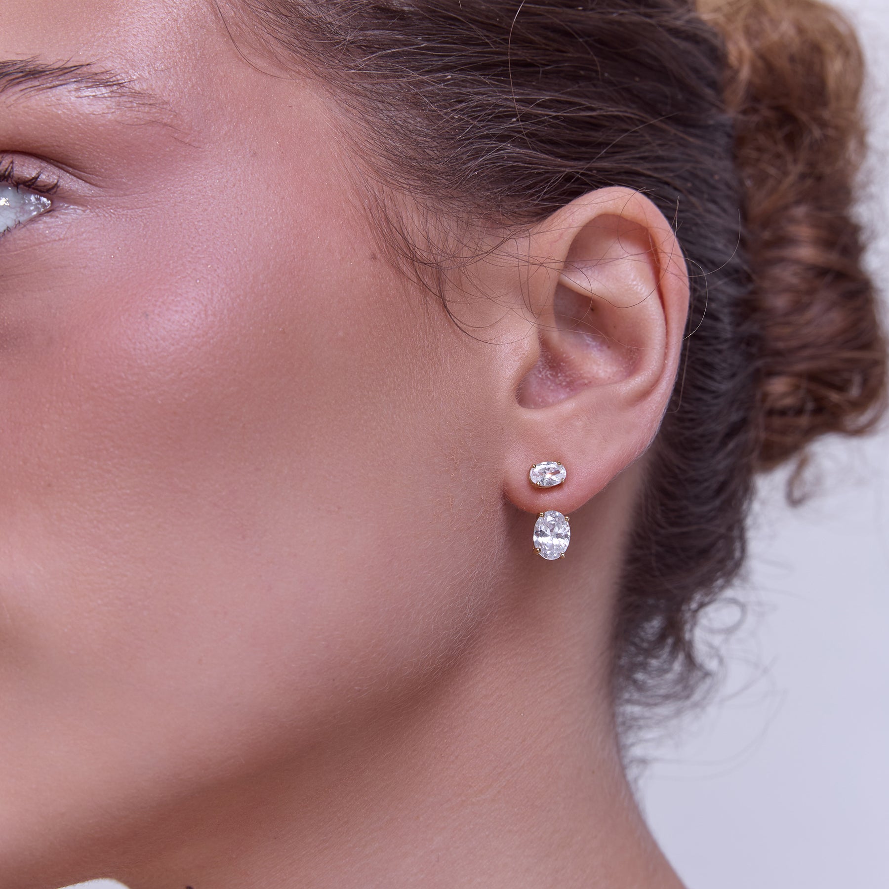 עגילי ג'אקט עדינים משובצים בזירקונים אובליים יפהפיים, בעיצוב יוקרתי, טרנדי ומחמיא. העגילים ניתנים להתאמה לתנוך האוזן. העגילים עשויים בעבודת יד מכסף סטרלינג 925 ומצופים בזהב 14K.