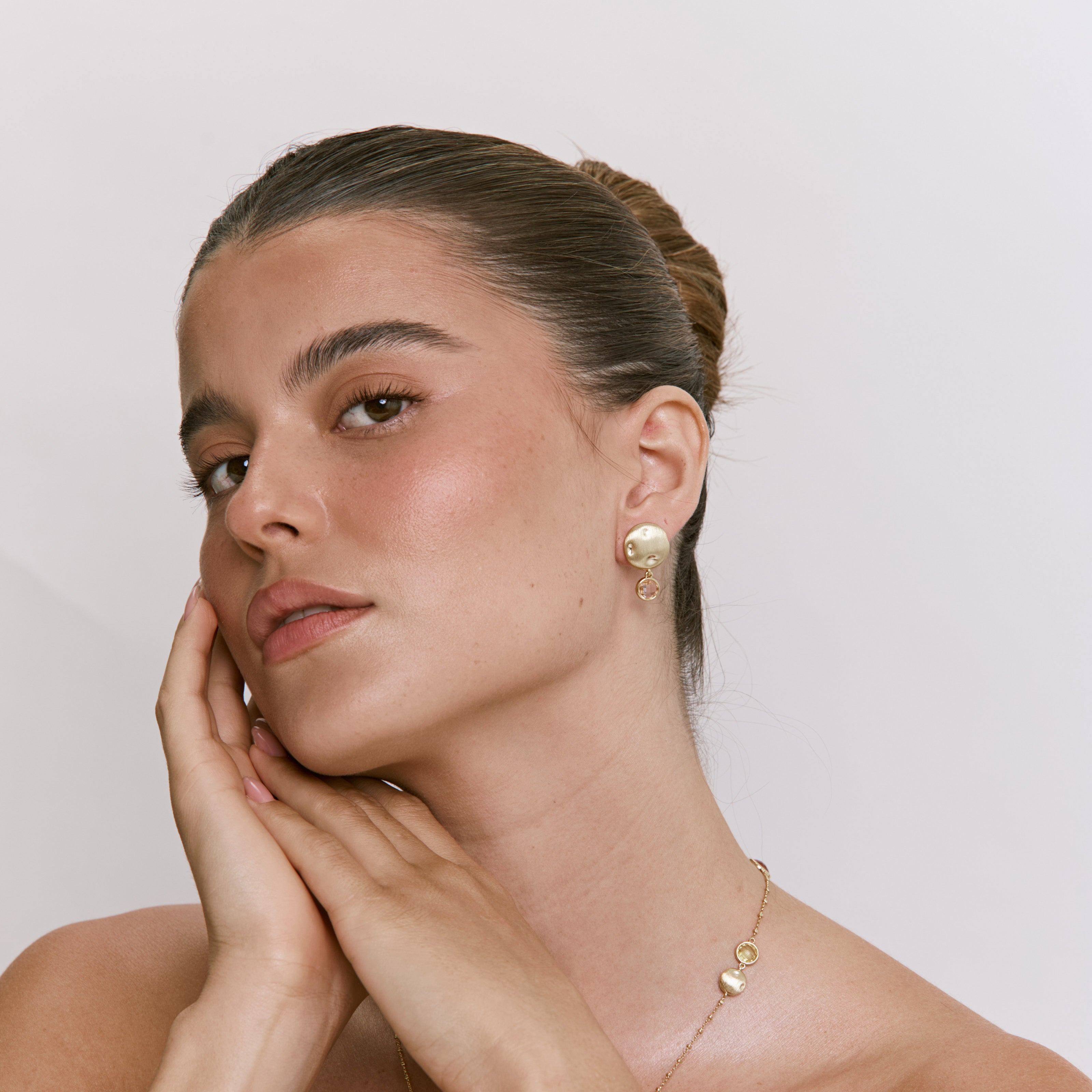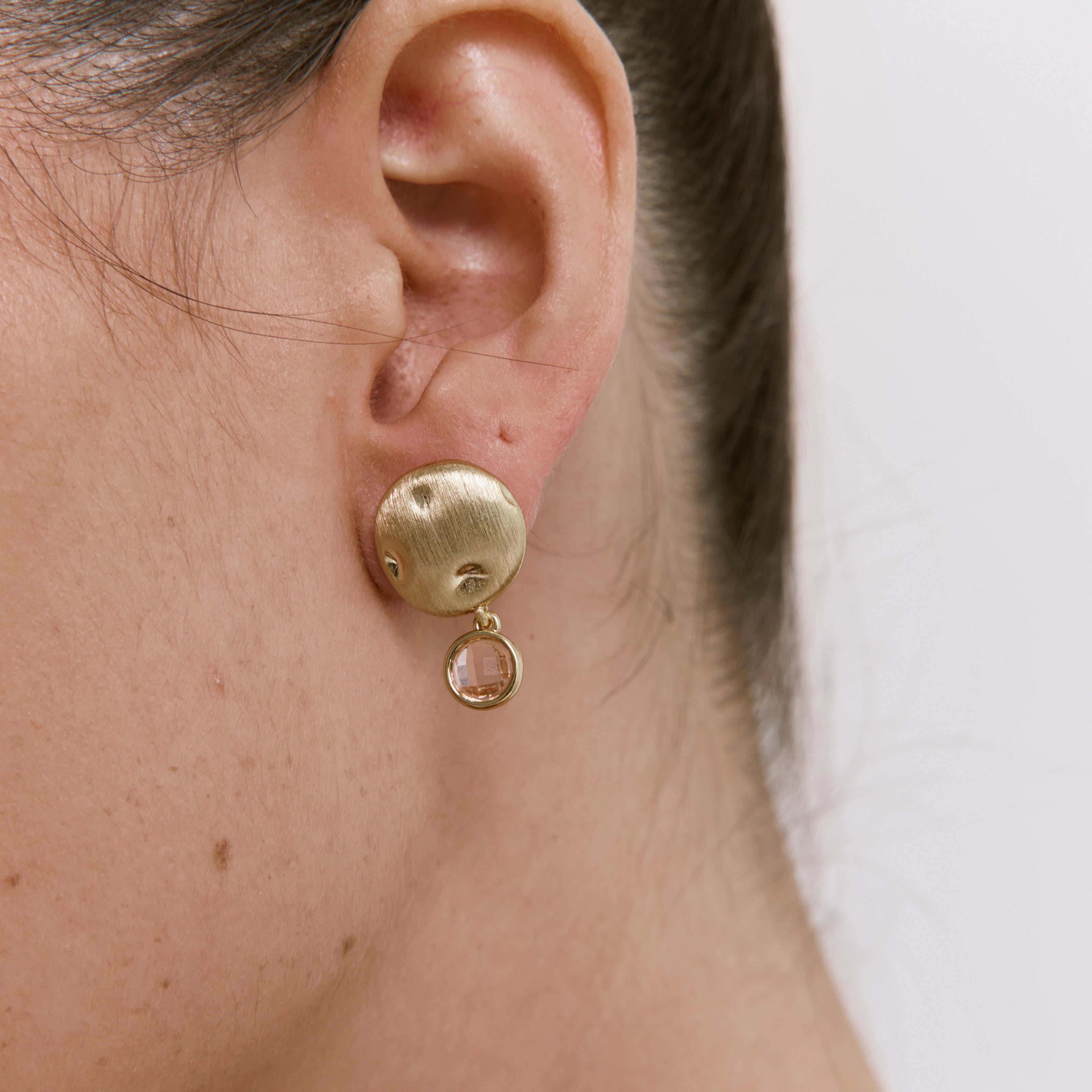 עגילים צמודים בעלי טקסטורה ייחודית, משובצים בזירקונים צבעוניים תלויים. העגילים עשויים בעבודת יד ומצופים בזהב 14K.