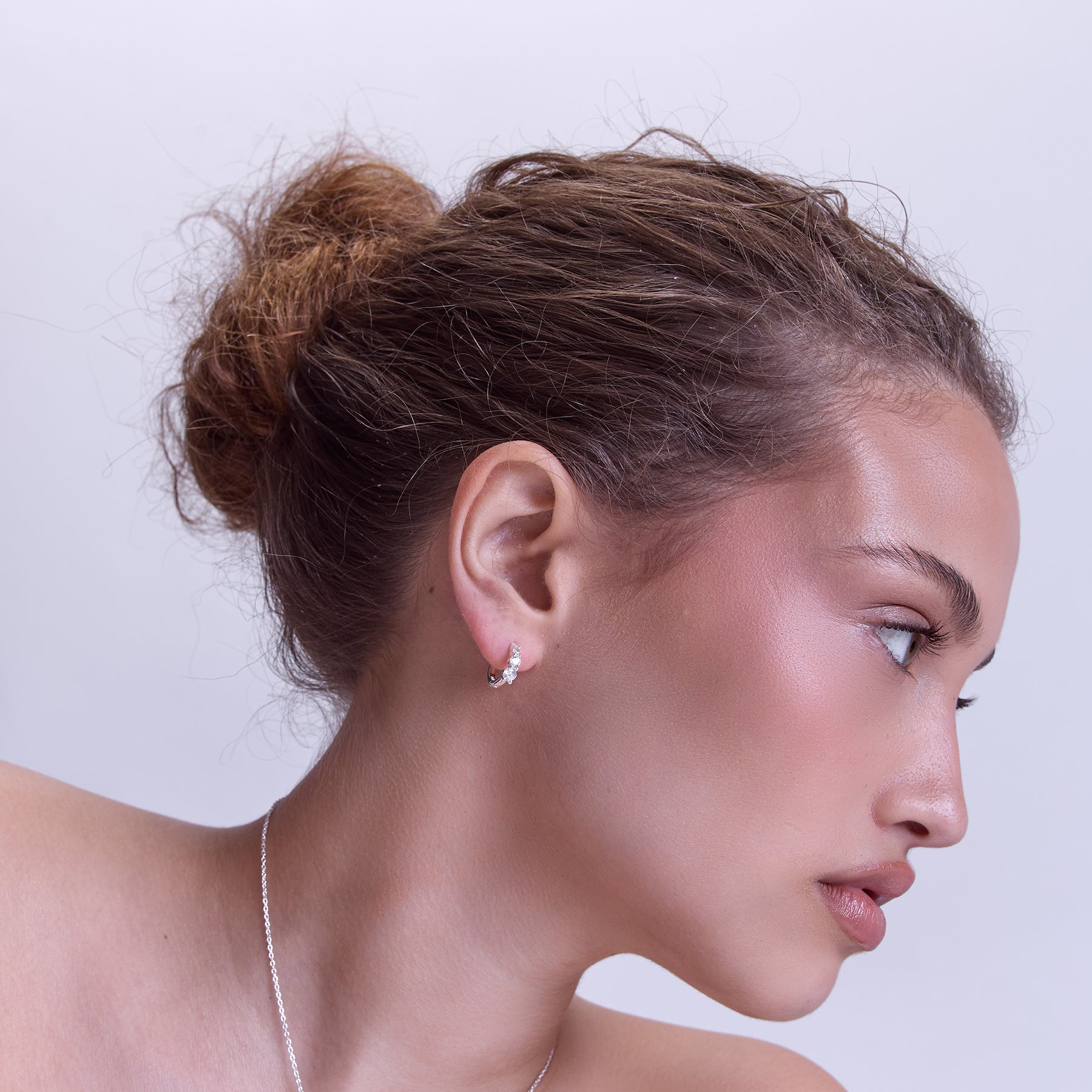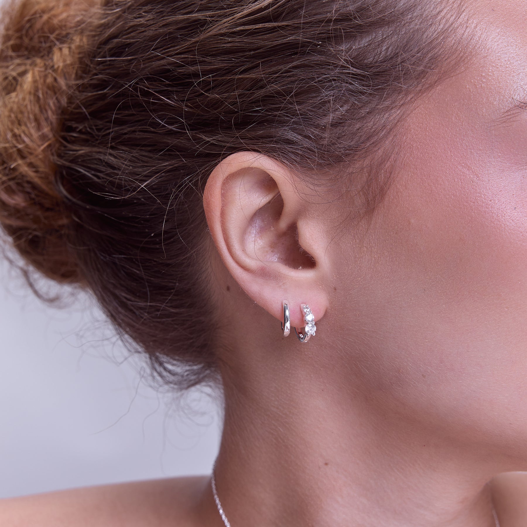 עגילי חישוק עדינים משובצים בשלישיית זירקונים בגודל עולה, בעיצוב מדויק ומחמיא שהולך עם הכל. העגילים עשויים בעבודת יד מכסף סטרלינג 925 ומצופים בכסף טהור.