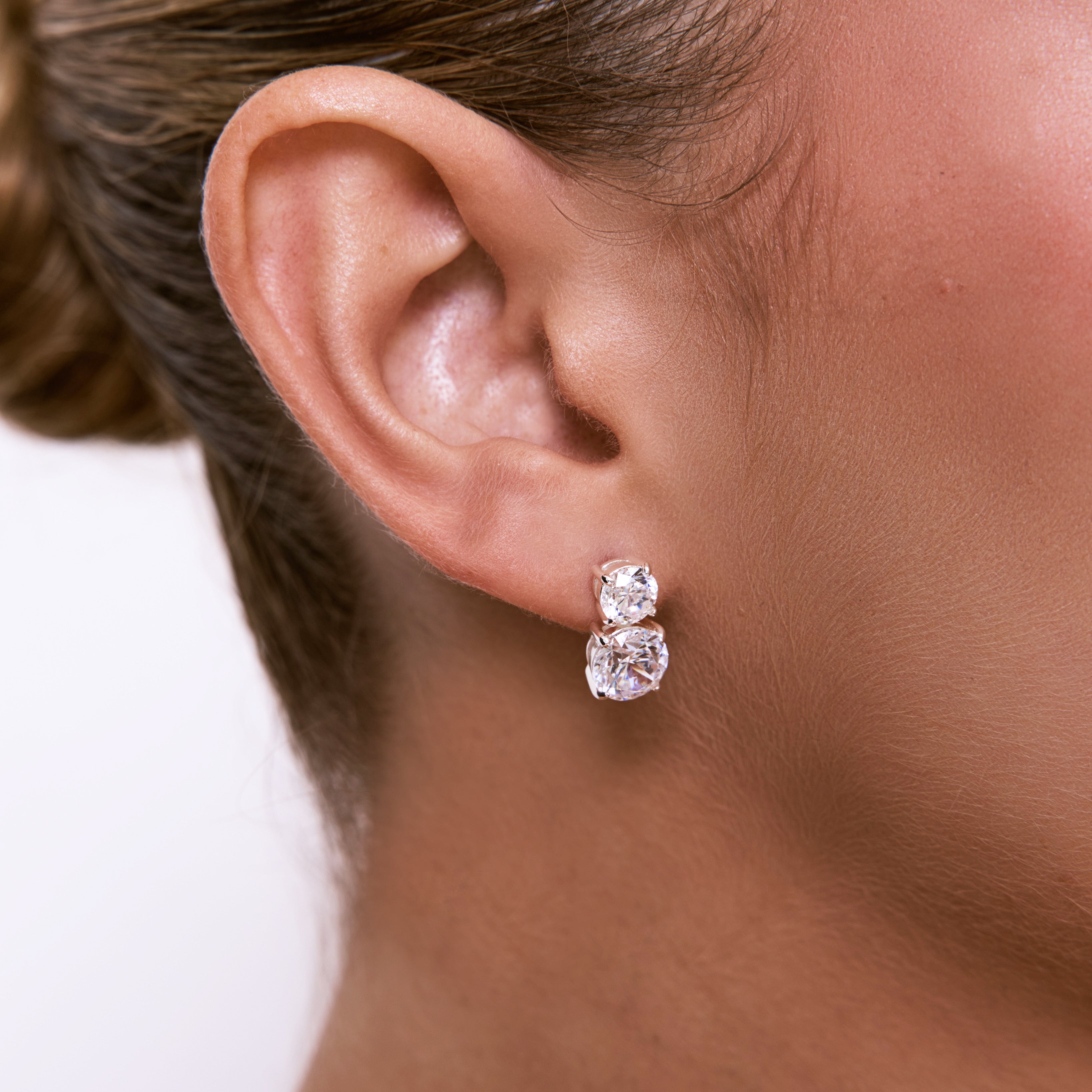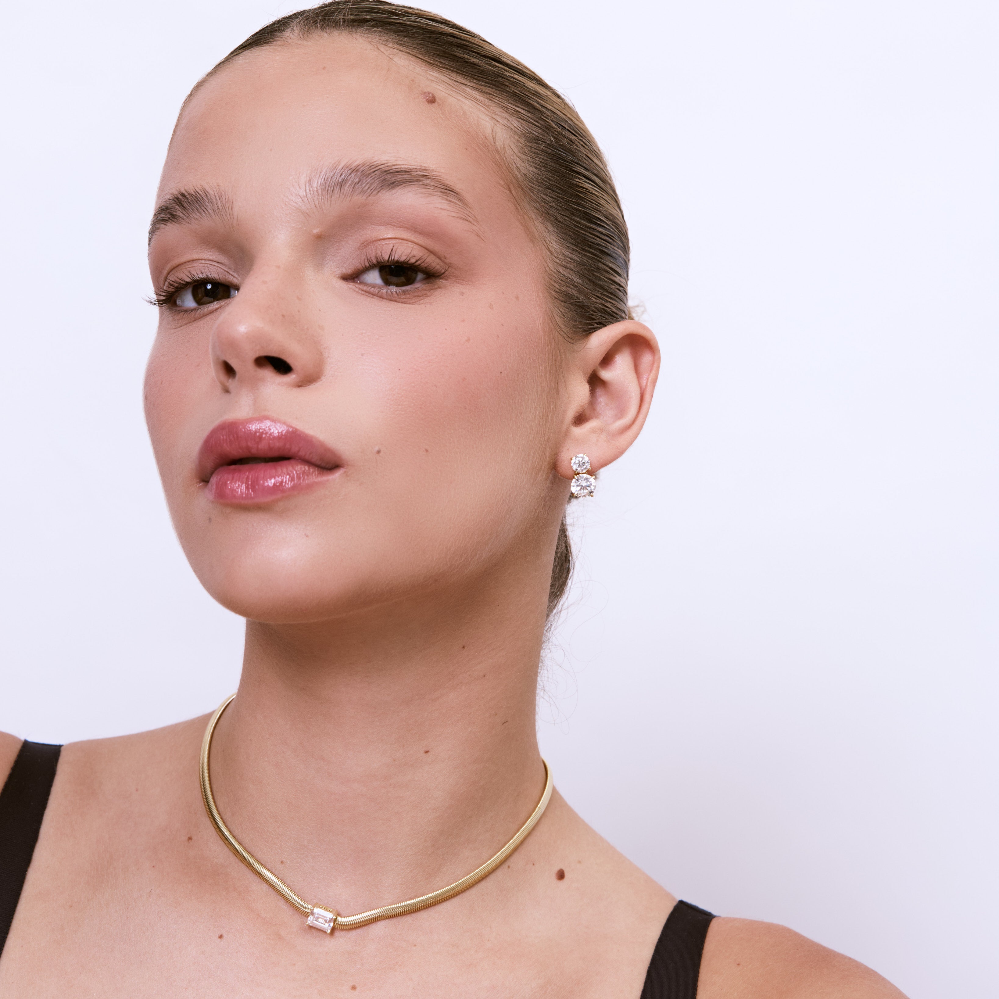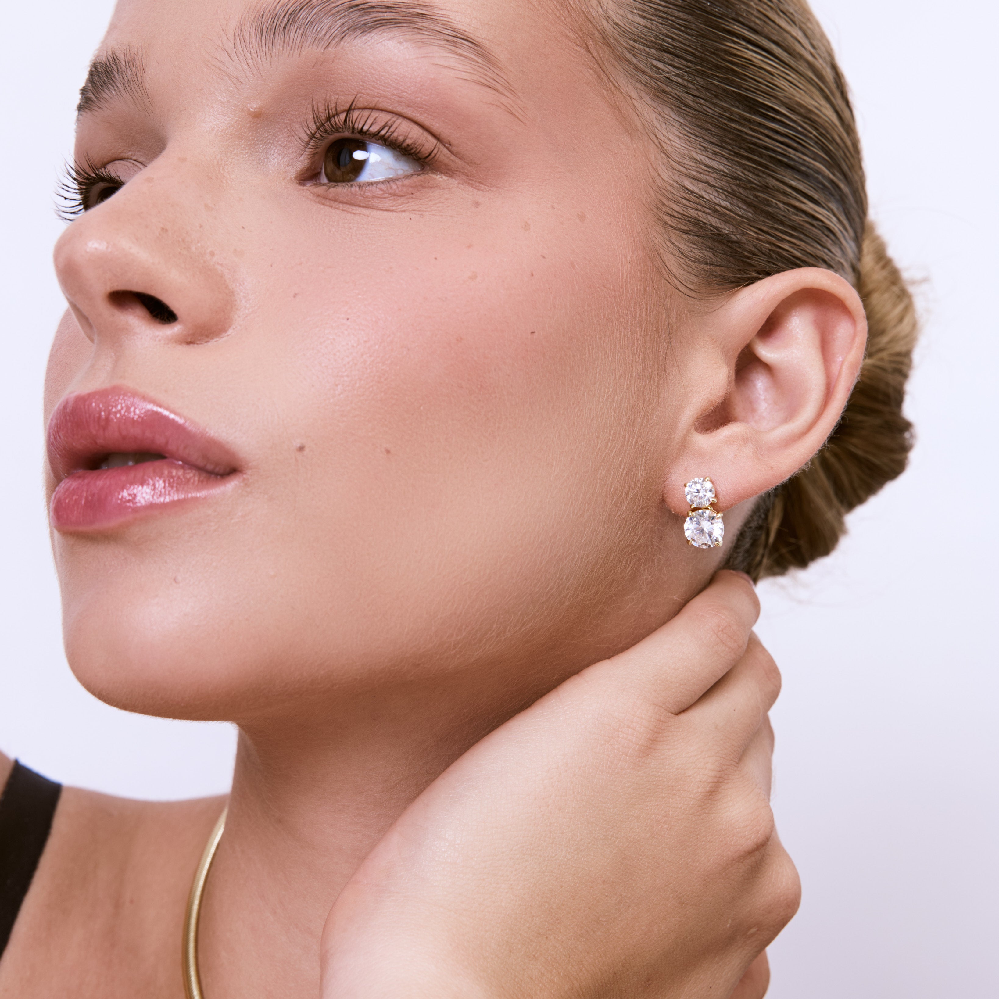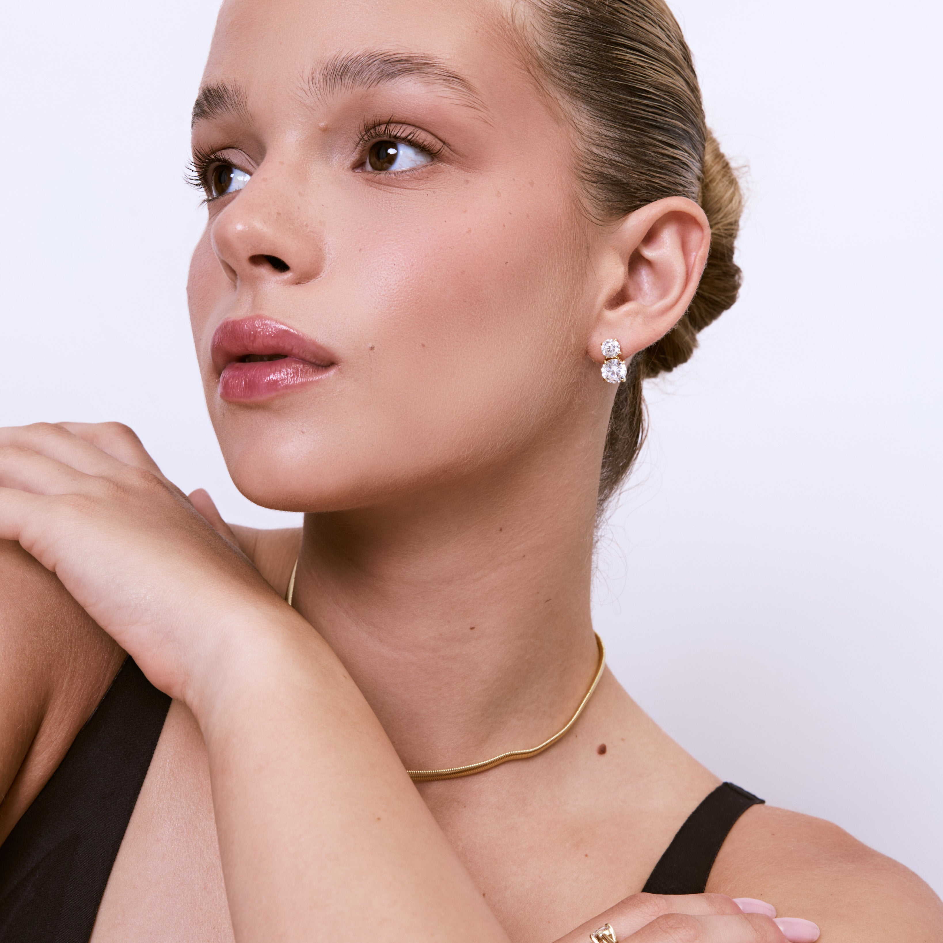 עגילים צמודים משובצים בזוג זירקונים, בעיצוב מדויק, יוקרתי ואלגנטי. העגילים עשויים בעבודת יד ומצופים בזהב 14K.
