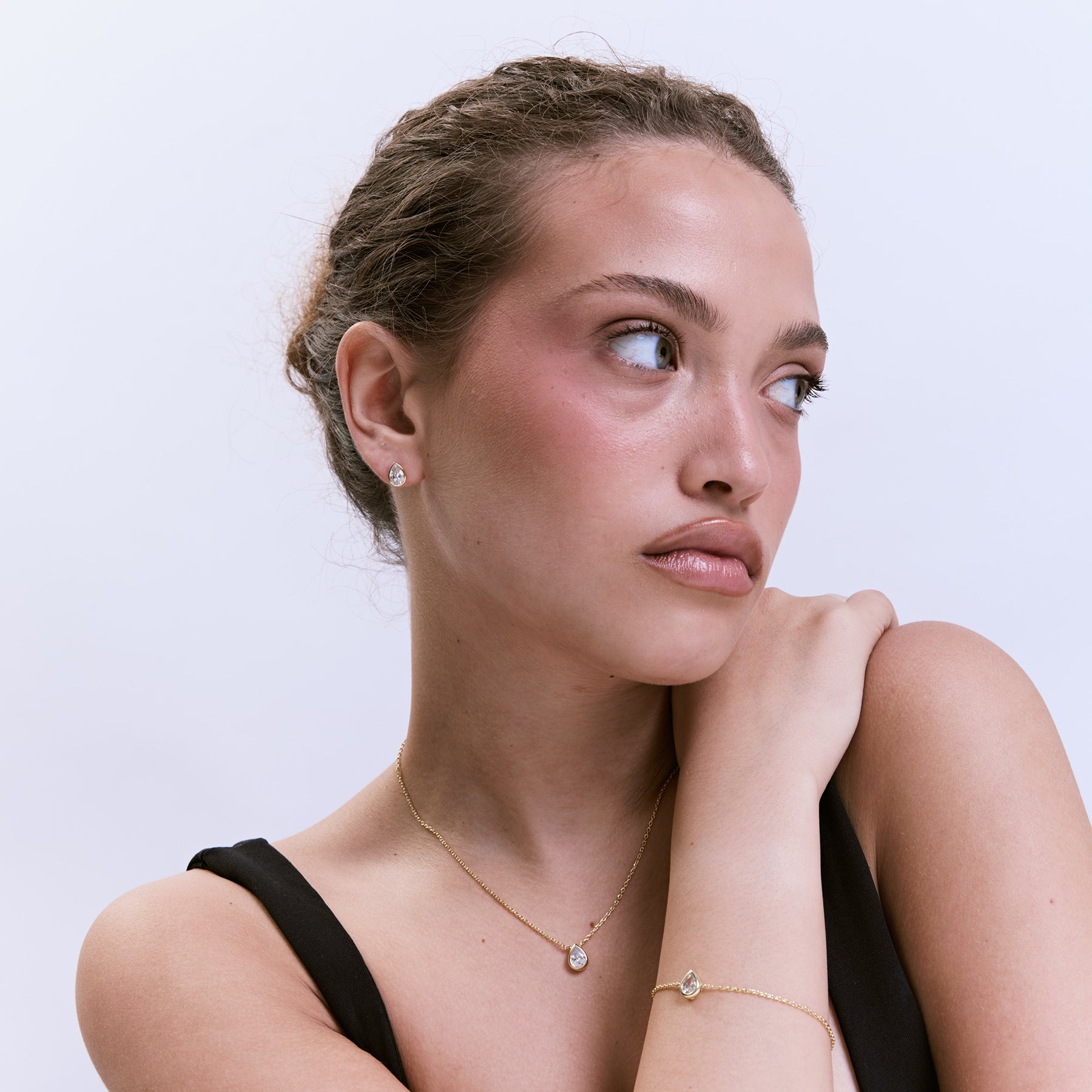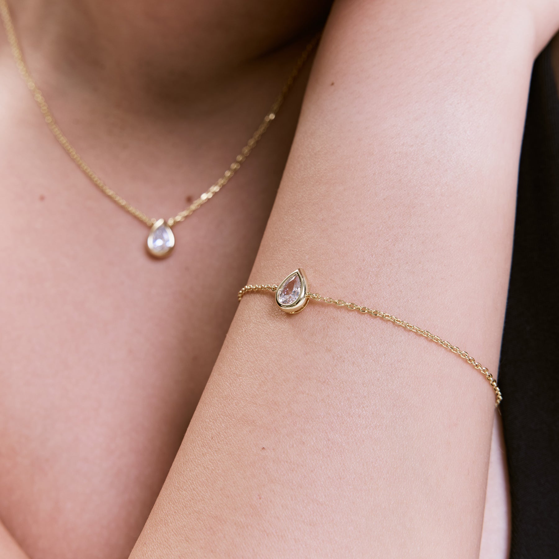 צמיד קלאסי עדין עם סנטר משובץ בזירקון בצורת טיפה, בעיצוב נקי ואלגנטי. הצמיד עשוי בעבודת יד ומצופה בזהב 14K.