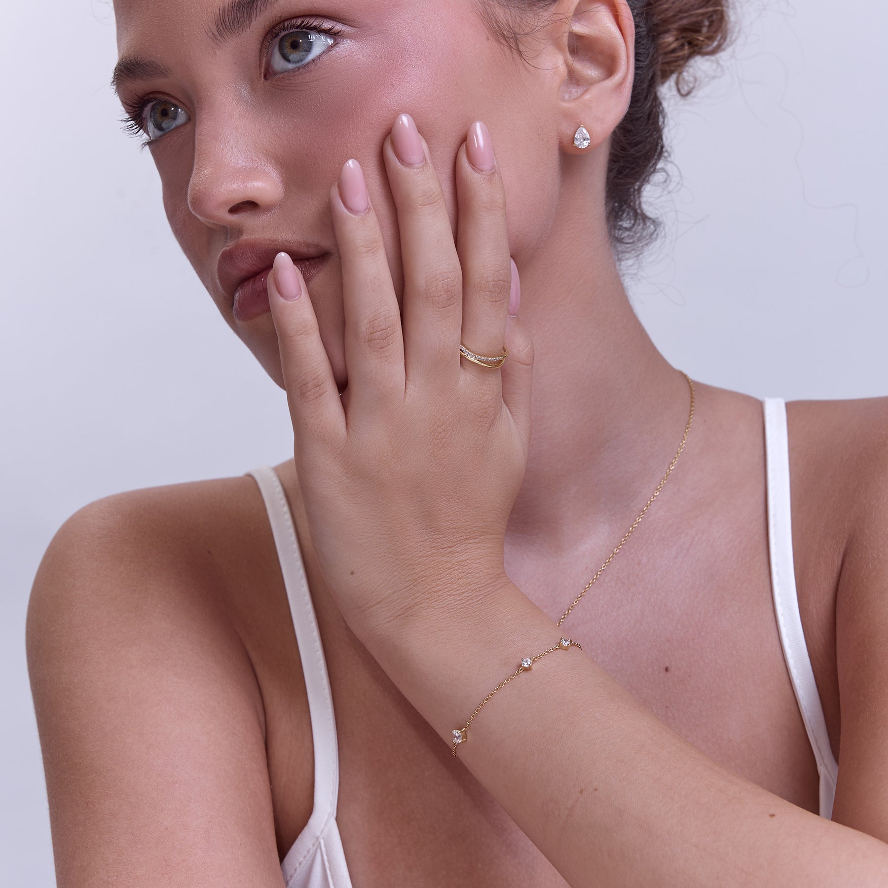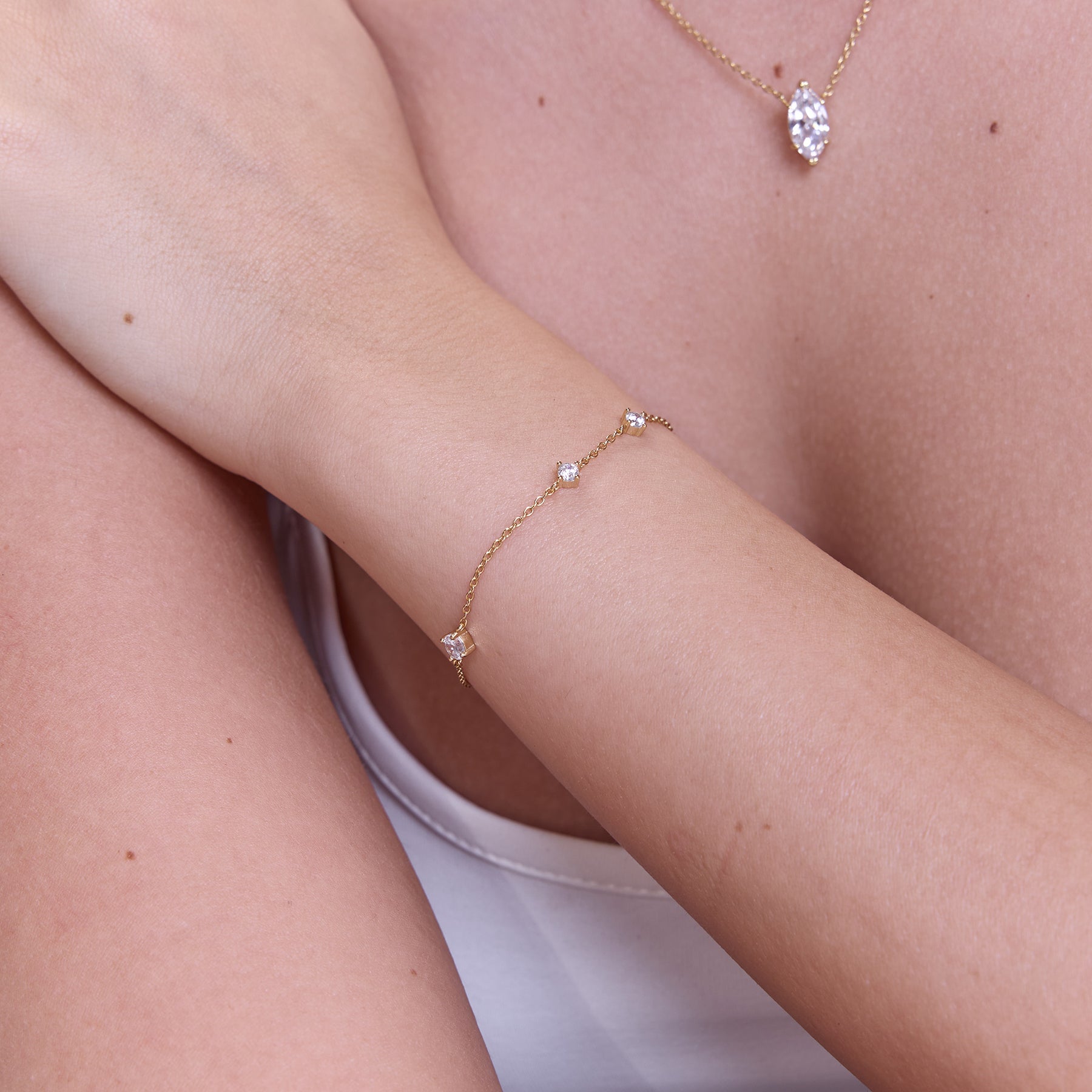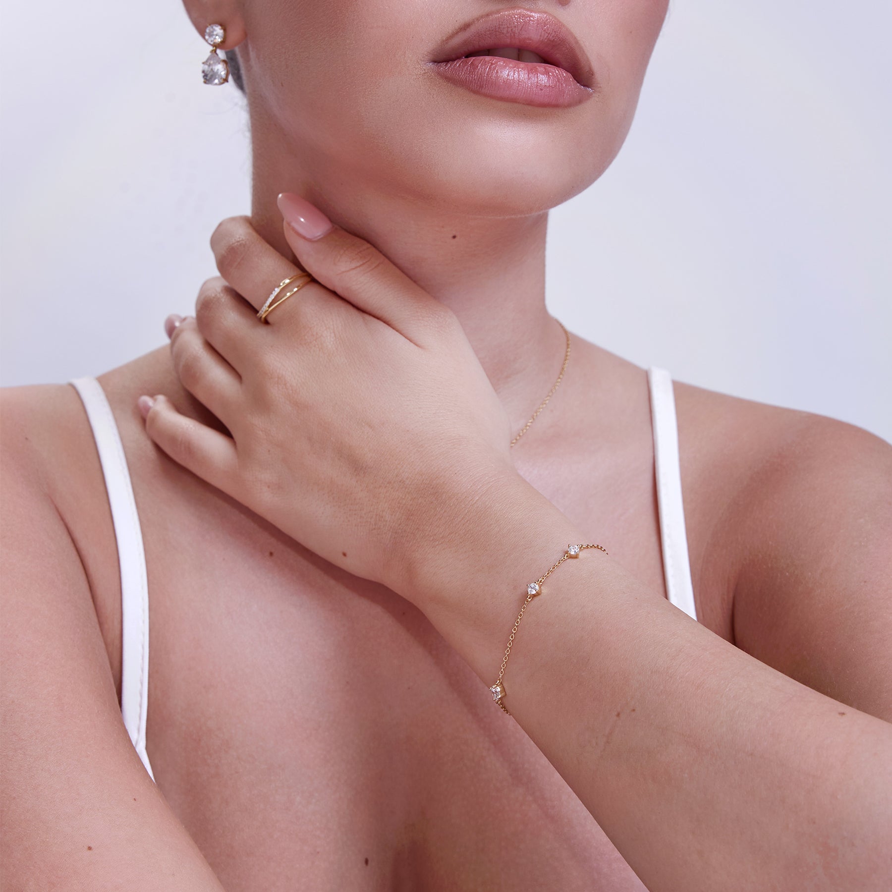 צמיד עדין משובץ זירקונים במרחקים שונים, בעיצוב נקי, מדויק ואלגנטי. הצמיד עשוי בעבודת יד מכסף סטרלינג 925 ומצופה בזהב 14K.