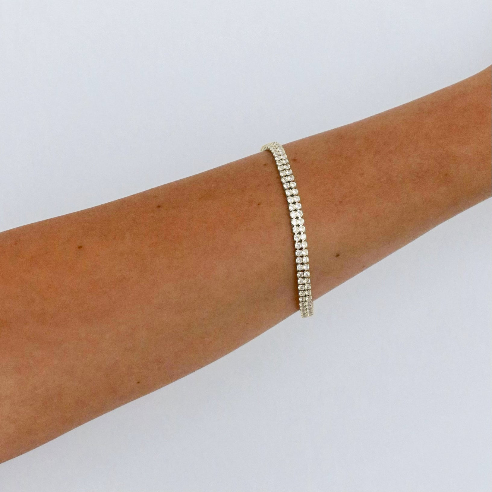 צמיד טניס כפול משובץ בזירקונים, בעיצוב אלגנטי ומלא גלאם. הצמיד עשוי בעבודת יד ומצופה בזהב 14K.