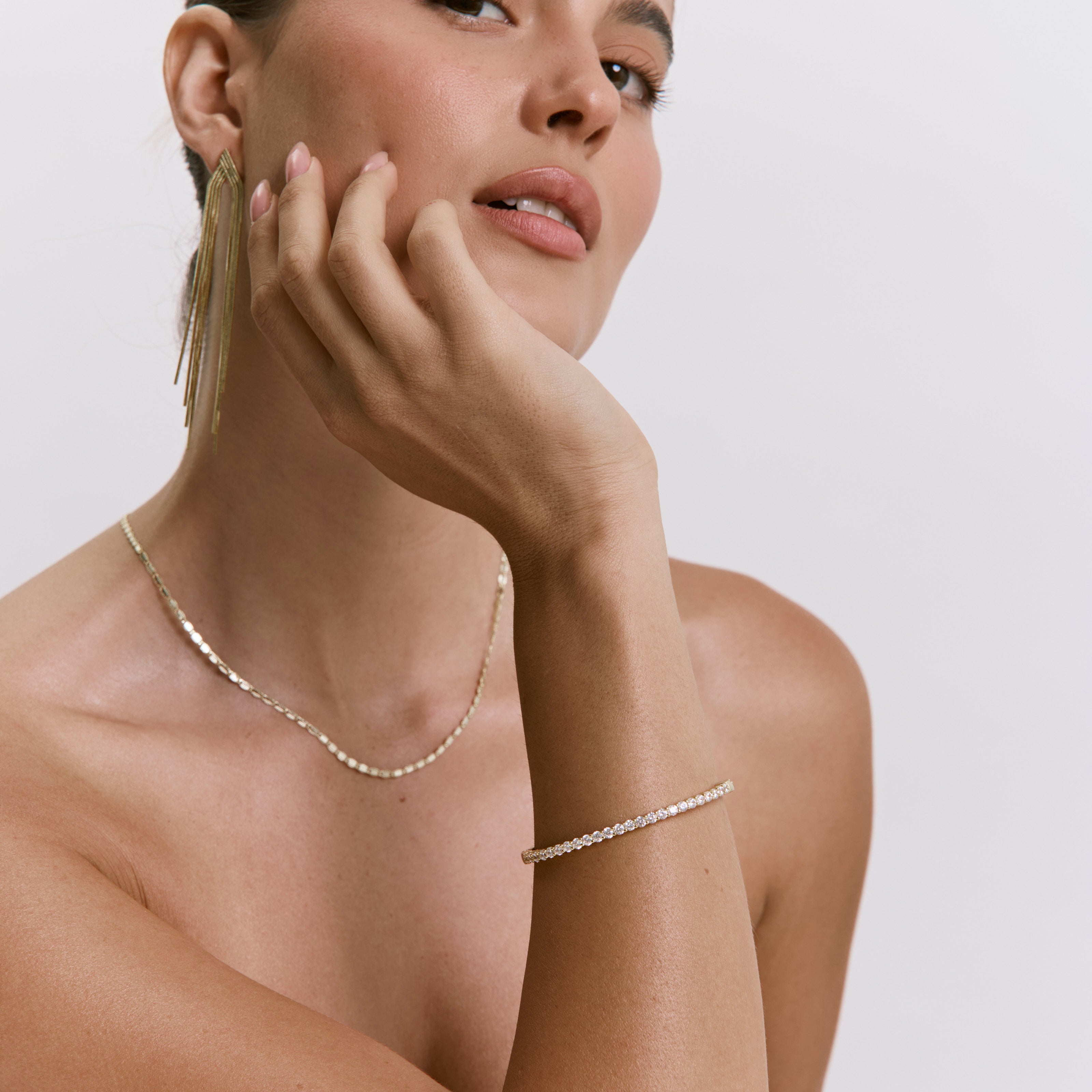 צמיד קשיח משובץ בשורת זירקונים, בעיצוב קלאסי, יוקרתי ועל-זמני. הצמיד עשוי בעבודת יד ומשובץ בזהב 14K.
