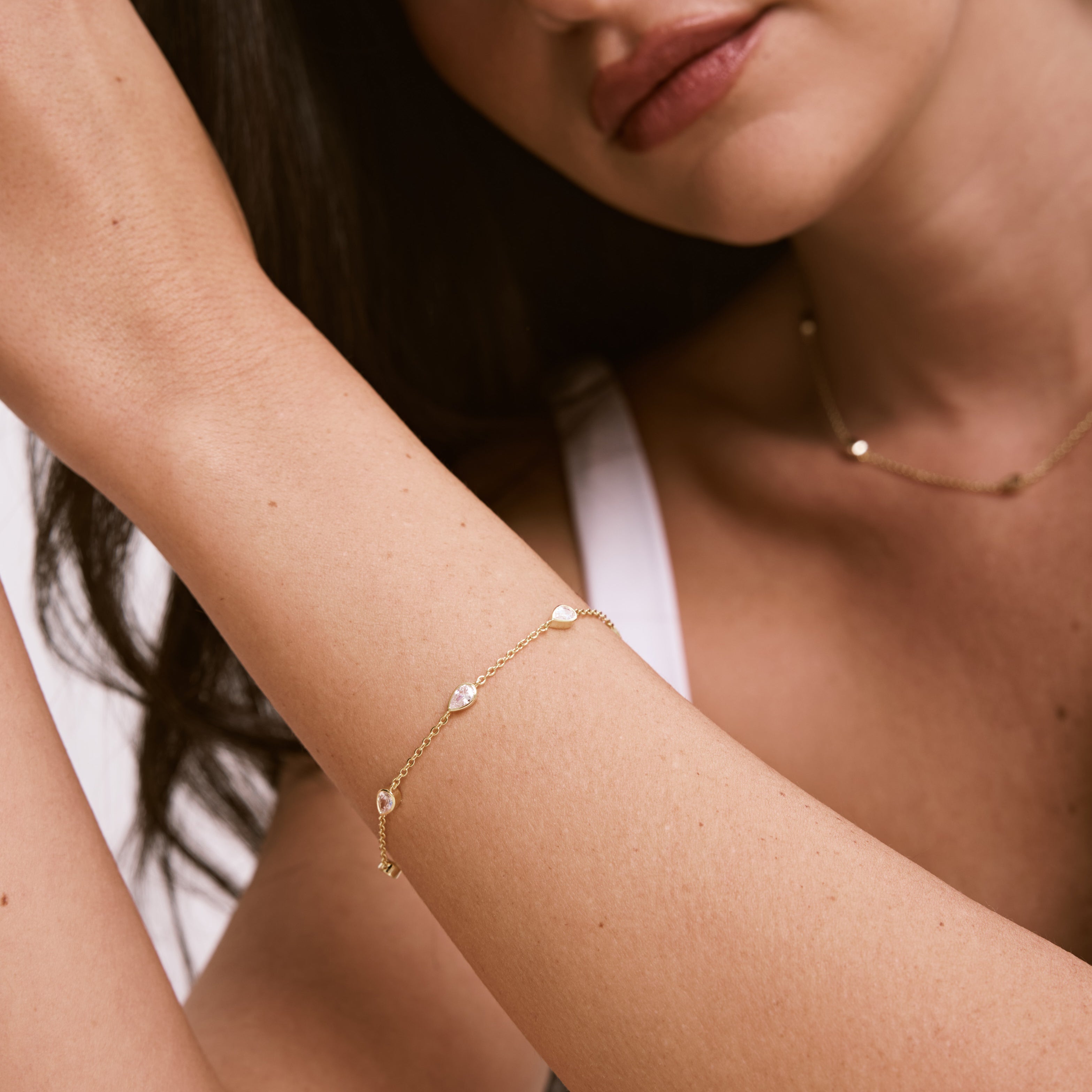 צמיד משובץ בזירקונים קטנים בצורת טיפה, בעיצוב מחמיא, על-זמני ומלא סטייל. הצמיד עשוי בעבודת יד ומצופה בזהב 14K.