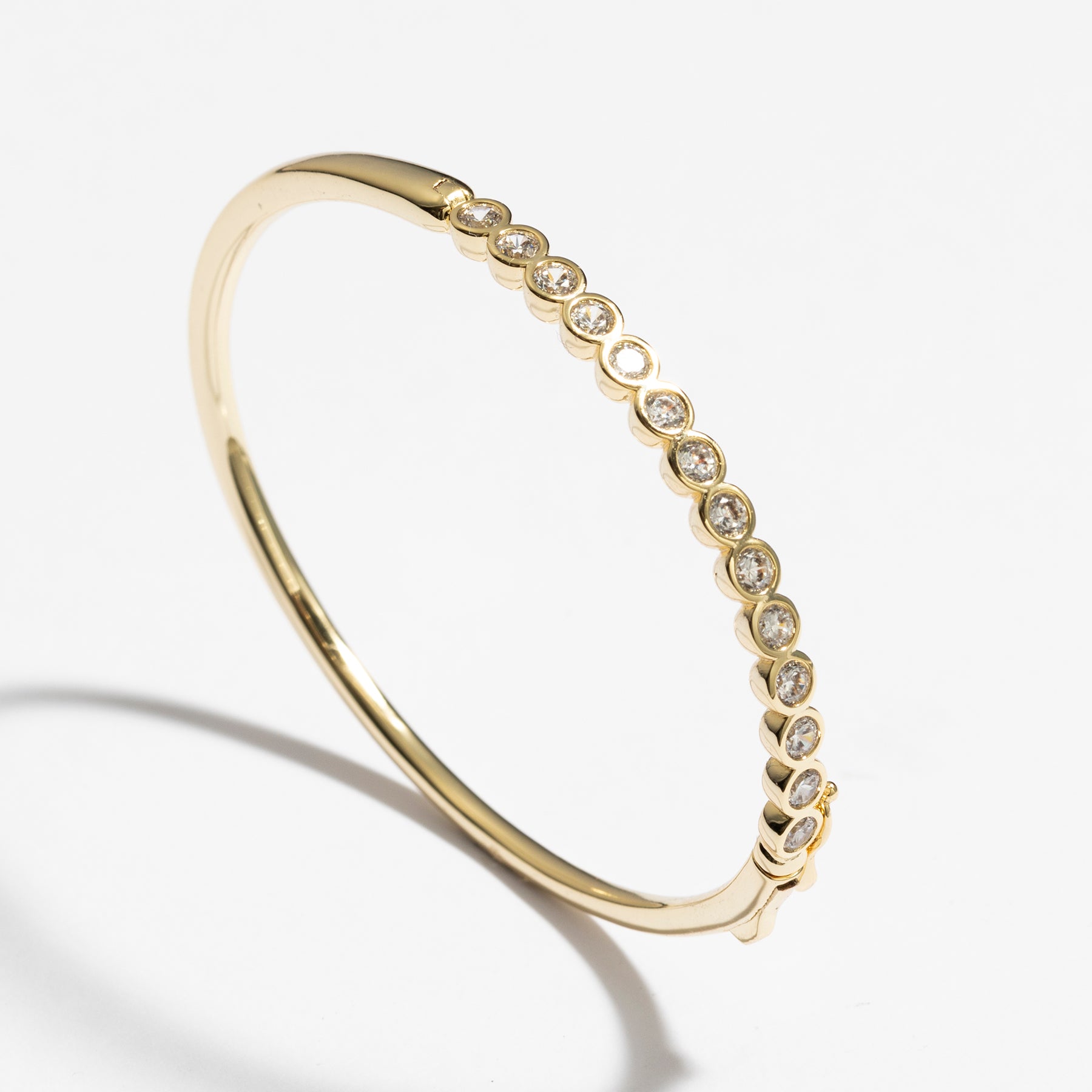 צמיד חצי טניס קשיח משובץ בזירקונים נוצצים, בעיצוב יוקרתי ונועז, ללוק בלתי נשכח. הצמיד עשוי בעבודת יד ומצופה בזהב 14K.