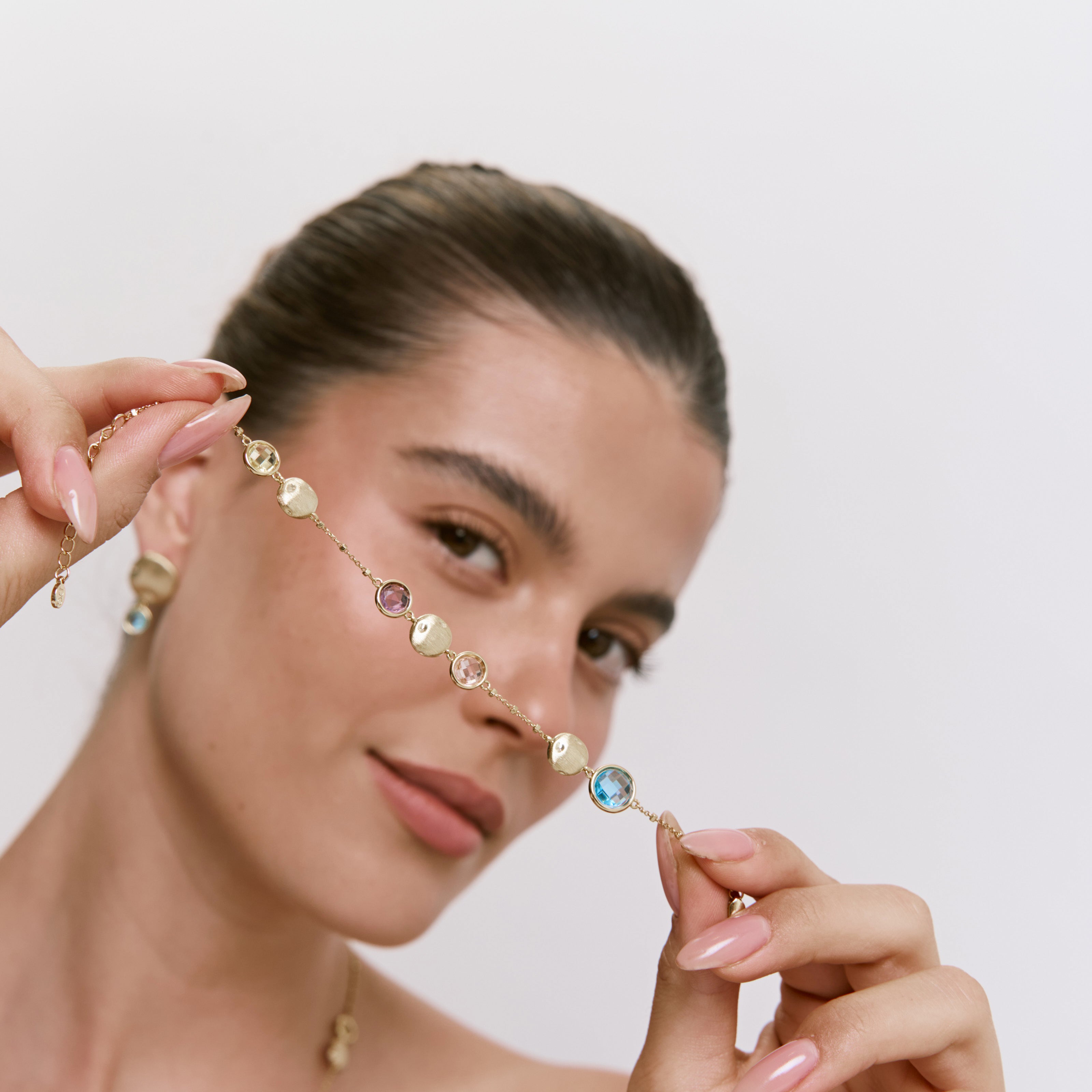 צמיד משובץ בזירקונים צבעוניים משולב באלמנטים מוזהבים בעלי טקסטורה ייחודית. הצמיד עשוי בעבודת יד ומצופה בזהב 14K.