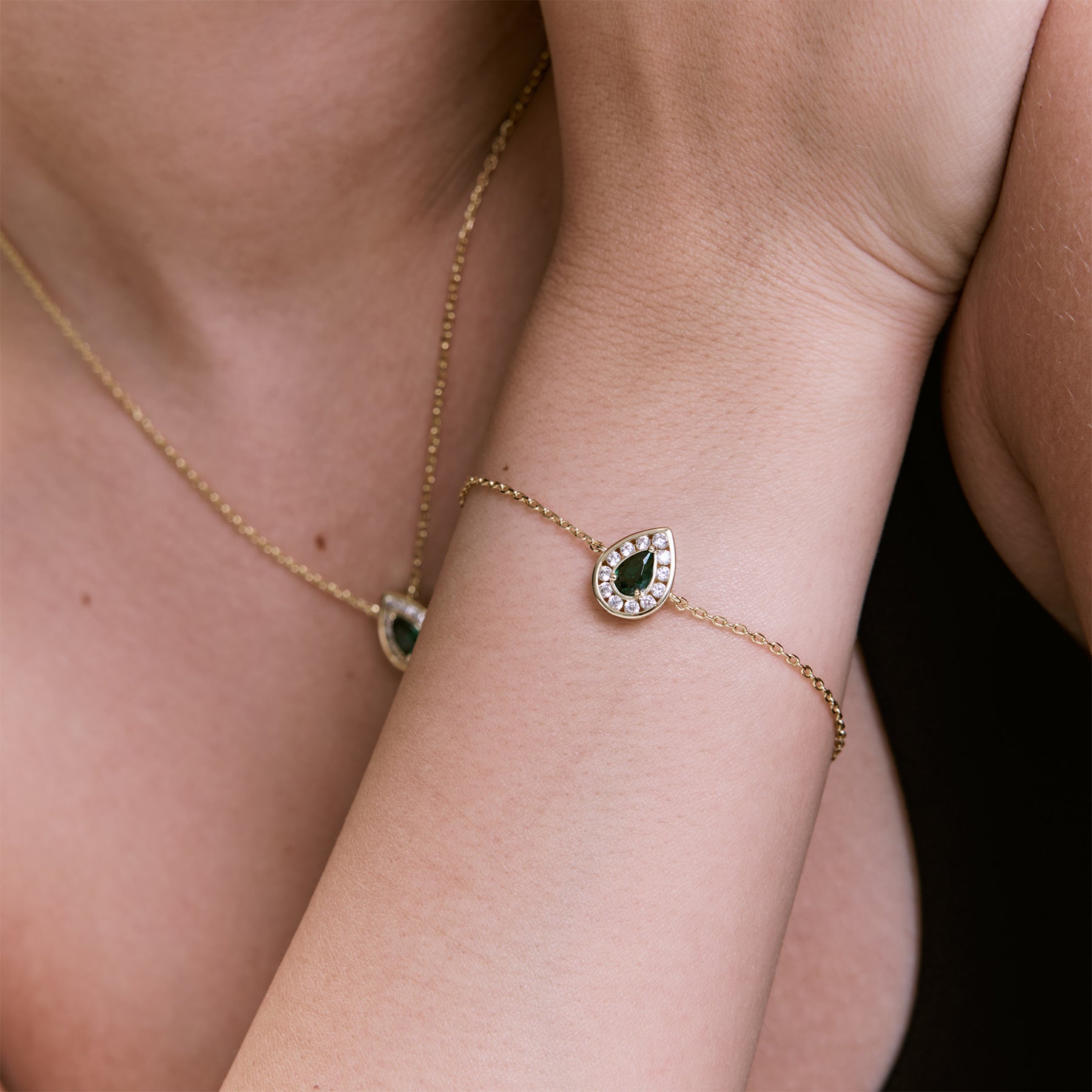 צמיד עדין עם סנטר משובץ בצורת טיפה, עם זירקון ירוק והילה של זירקונים קטנים מנצנצים. הצמיד עשוי בעבודת יד ומצופה בזהב 14K.