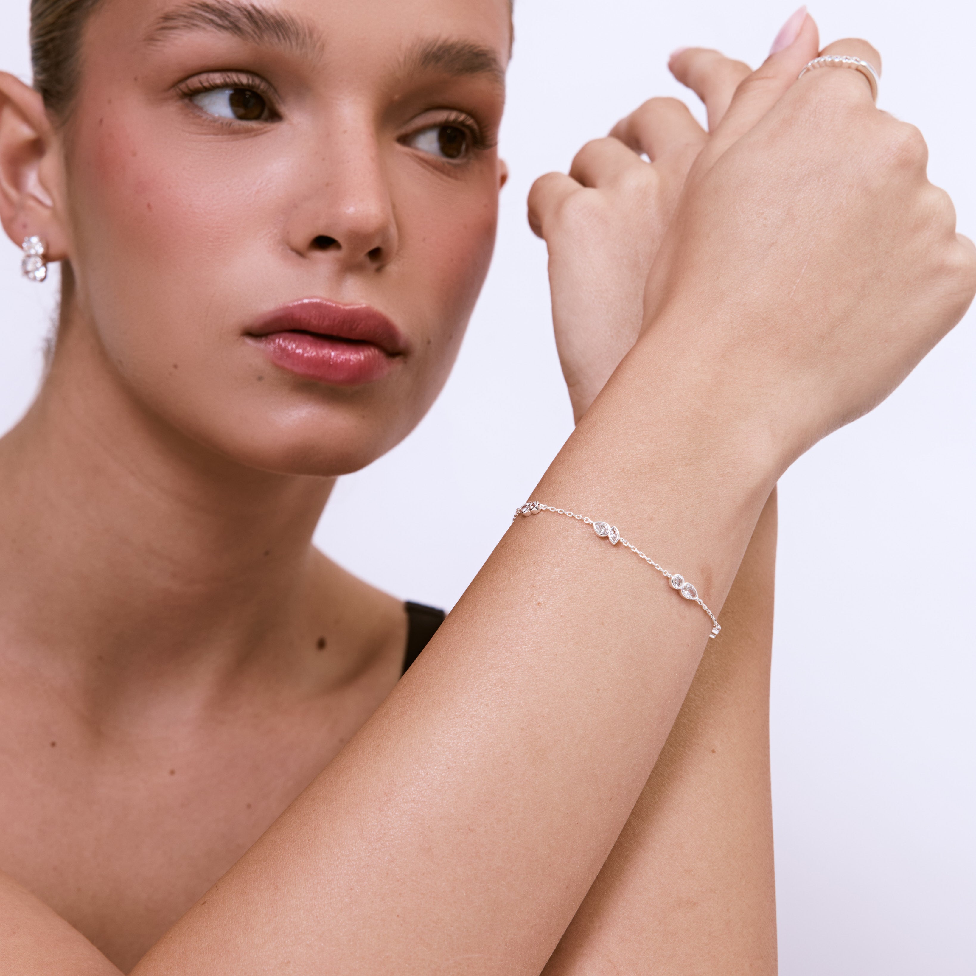 צמיד עדין משובץ בזירקונים במגוון צורות ושילובים, בעיצוב רענן, יוקרתי ומלא קסם. הצמיד עשוי בעבודת יד ומצופה בכסף טהור.