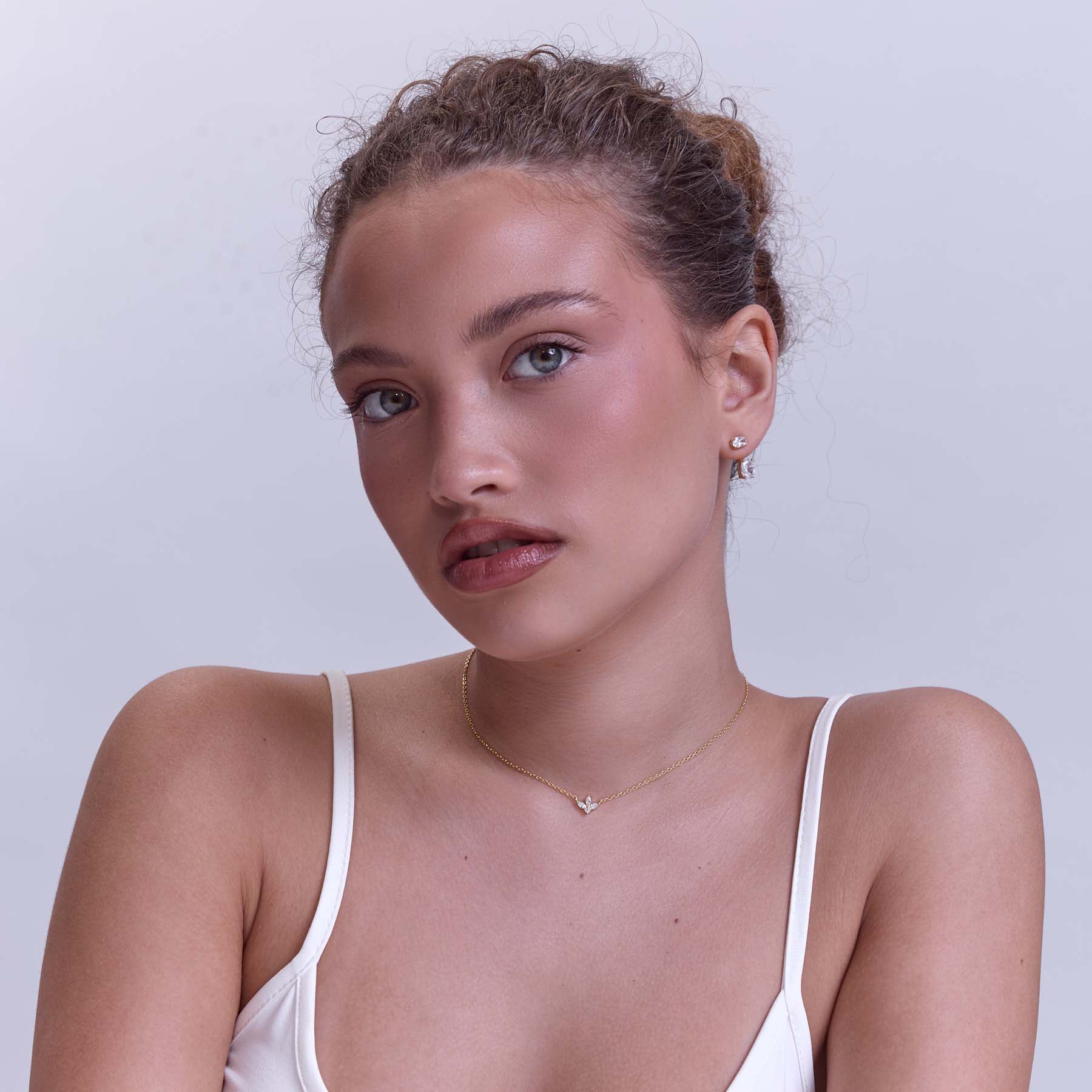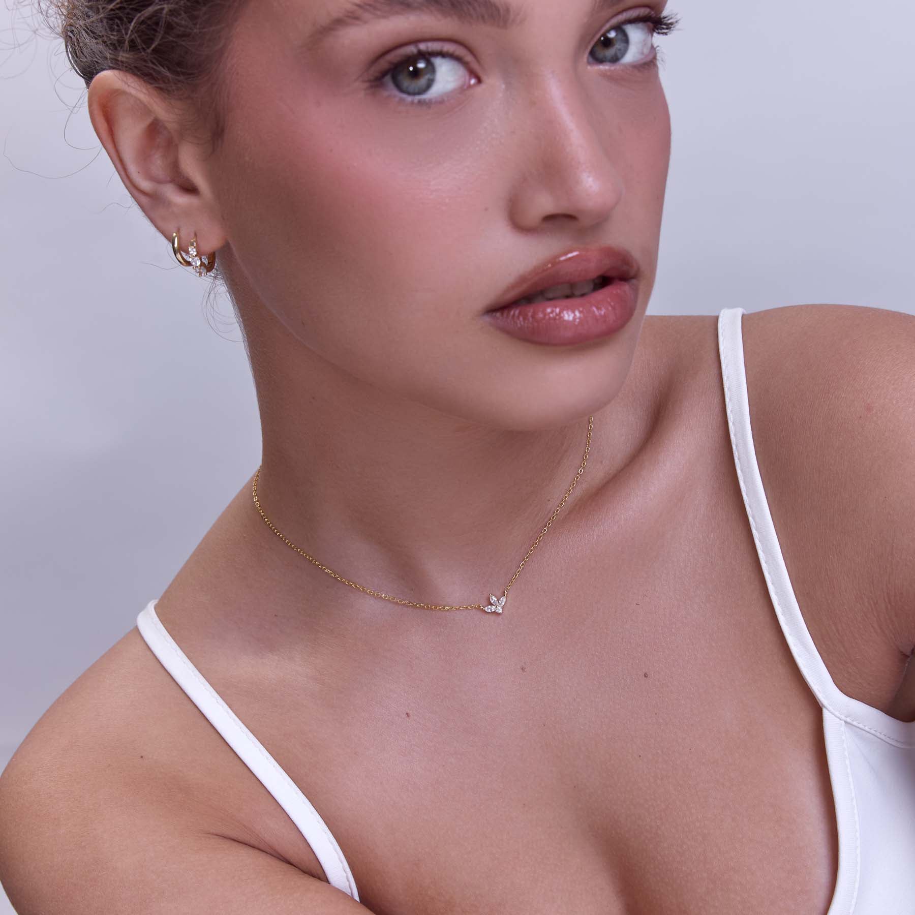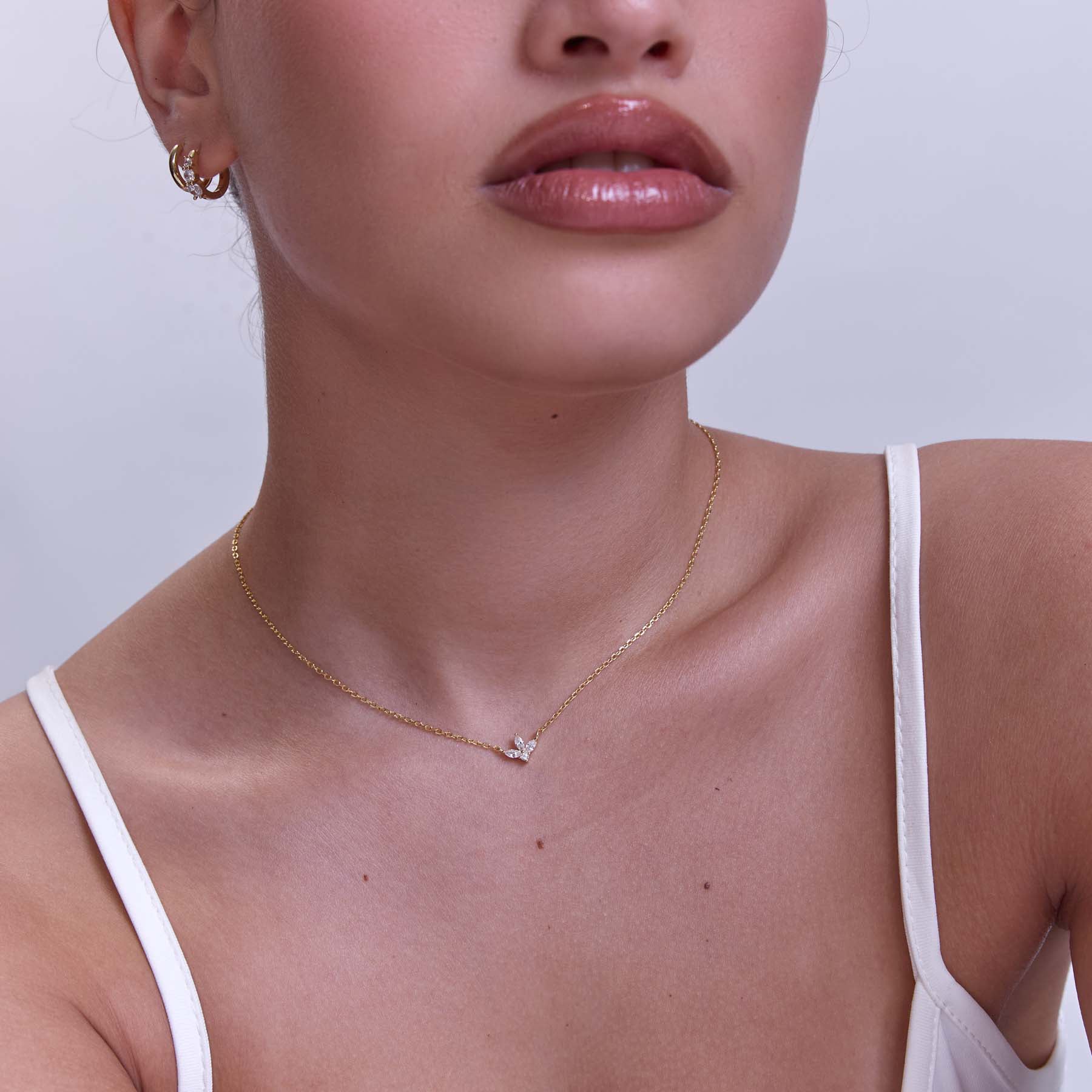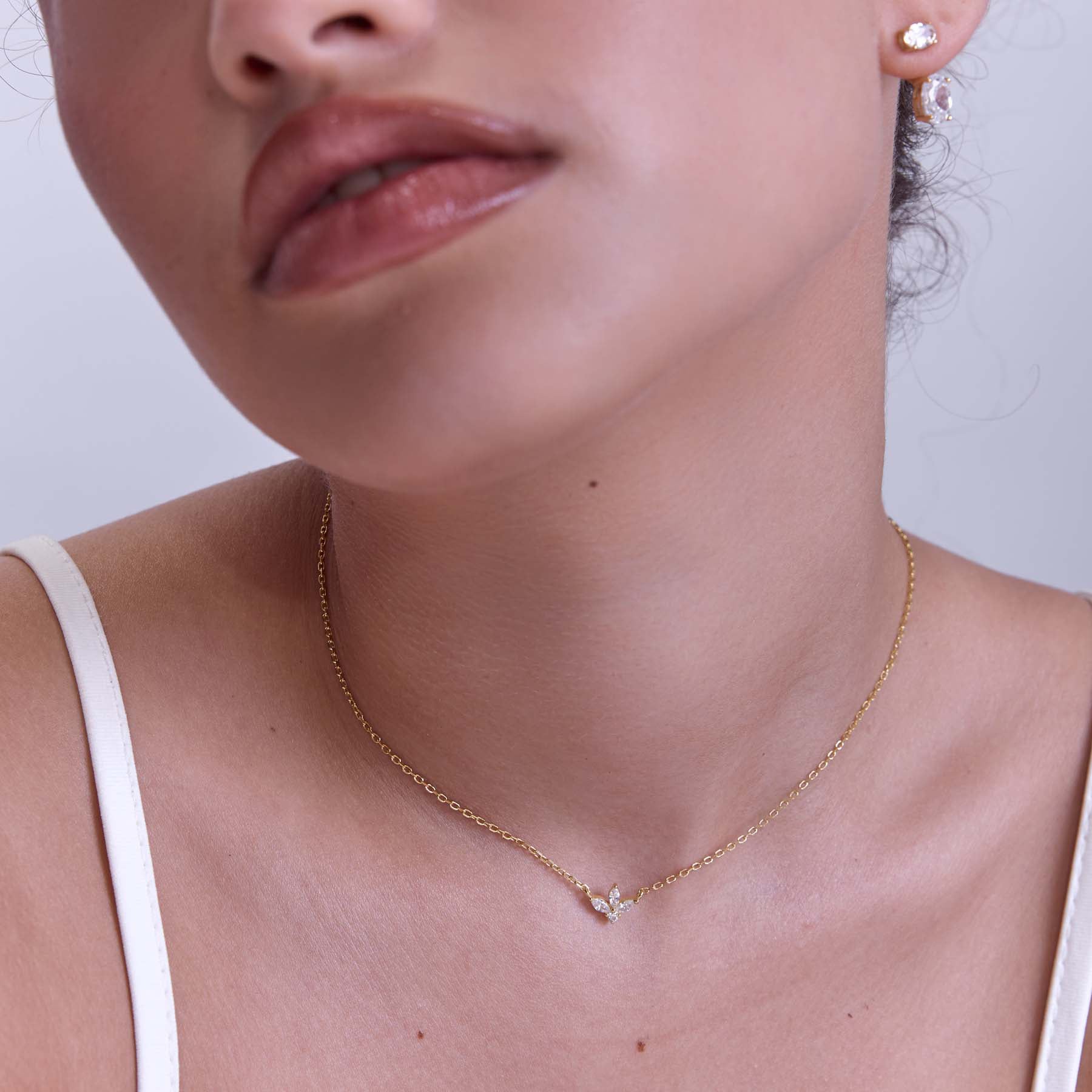 שרשרת משובצת בזירקונים היוצרים צורת פרח מעודנת, בעיצוב טרנדי, מדויק ומחמיא. השרשרת עשויה בעבודת יד מכסף סטרלינג 925 ומצופה בזהב 14K.