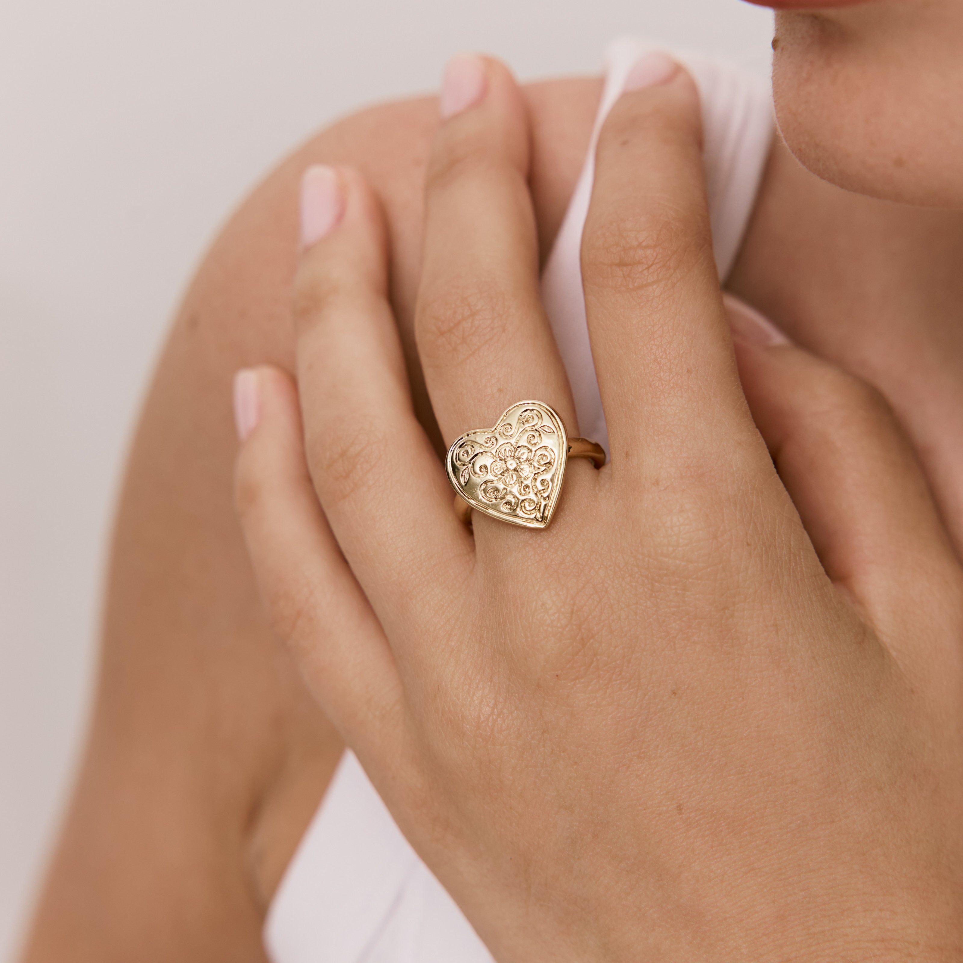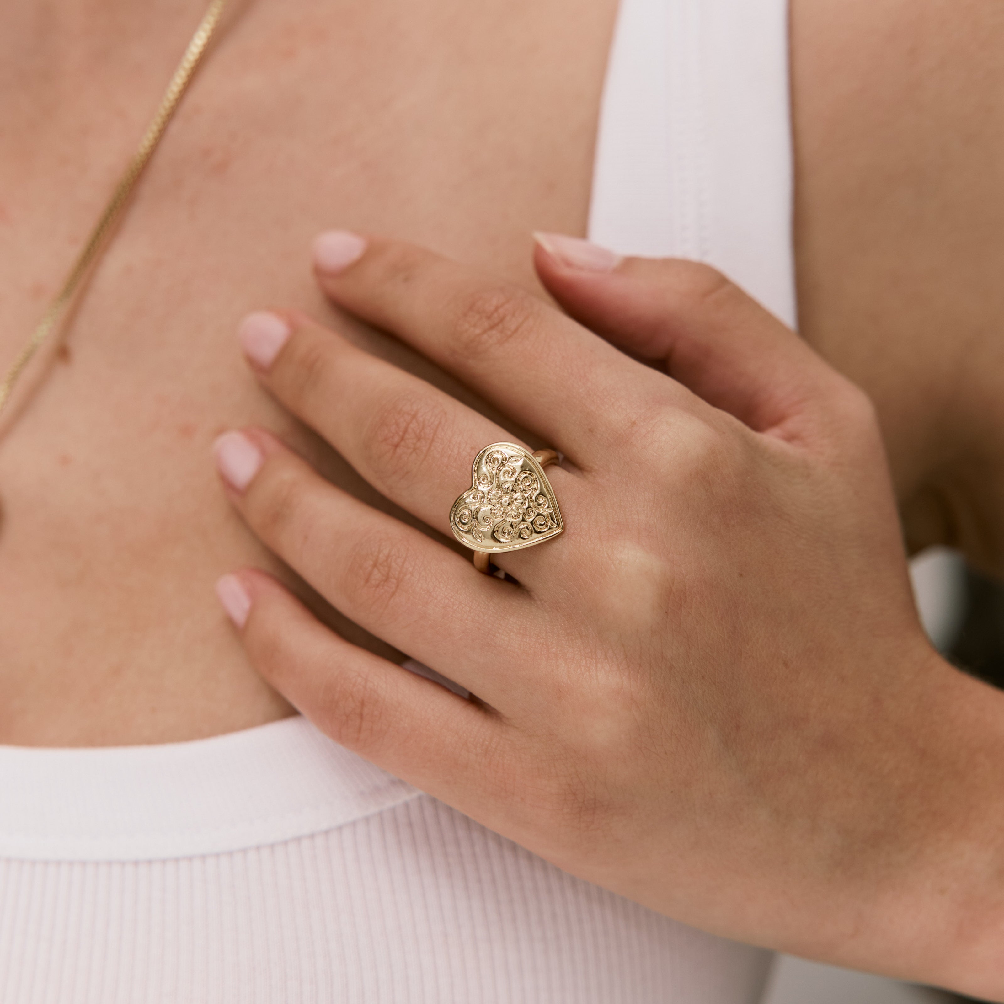 טבעת לב צ'אנקית מעוטרת בסגנון וינטאג', מושלמת לטרנד הלבבות. הטבעת עשוייה בעבודת יד ומצופה בזהב 24K והיא חלק מקולקציית Nostalgia שמבוססת על דגמים ישנים ואהובים, שעוצבו אצלנו בעבודת יד בשנות ה-70, ה- 80 וה-90, מעניקה להם חיים חדשים ומחזירה אותם לקדמת הבמה.