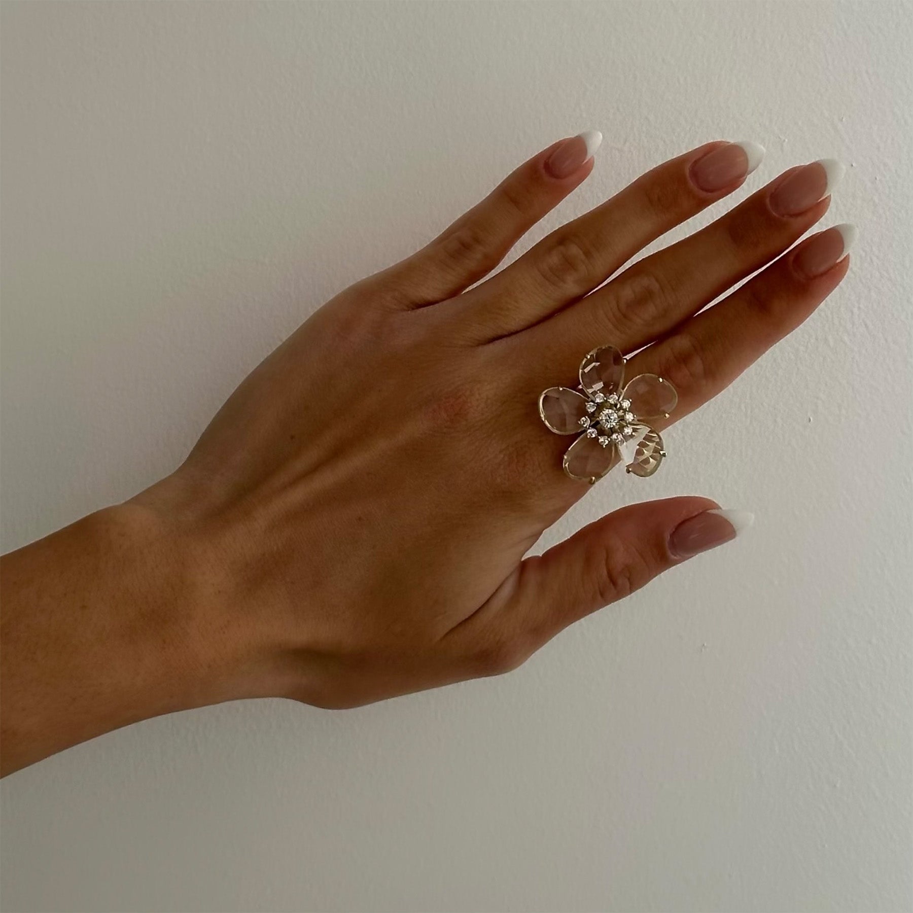 טבעת פרח גדולה משובצת זירקונים וקריסטלים, בעיצוב מרשים ויוקרתי. מידת הטבעת מתכווננת. הטבעת עשויה בעבודת יד ומצופה בזהב 14K.