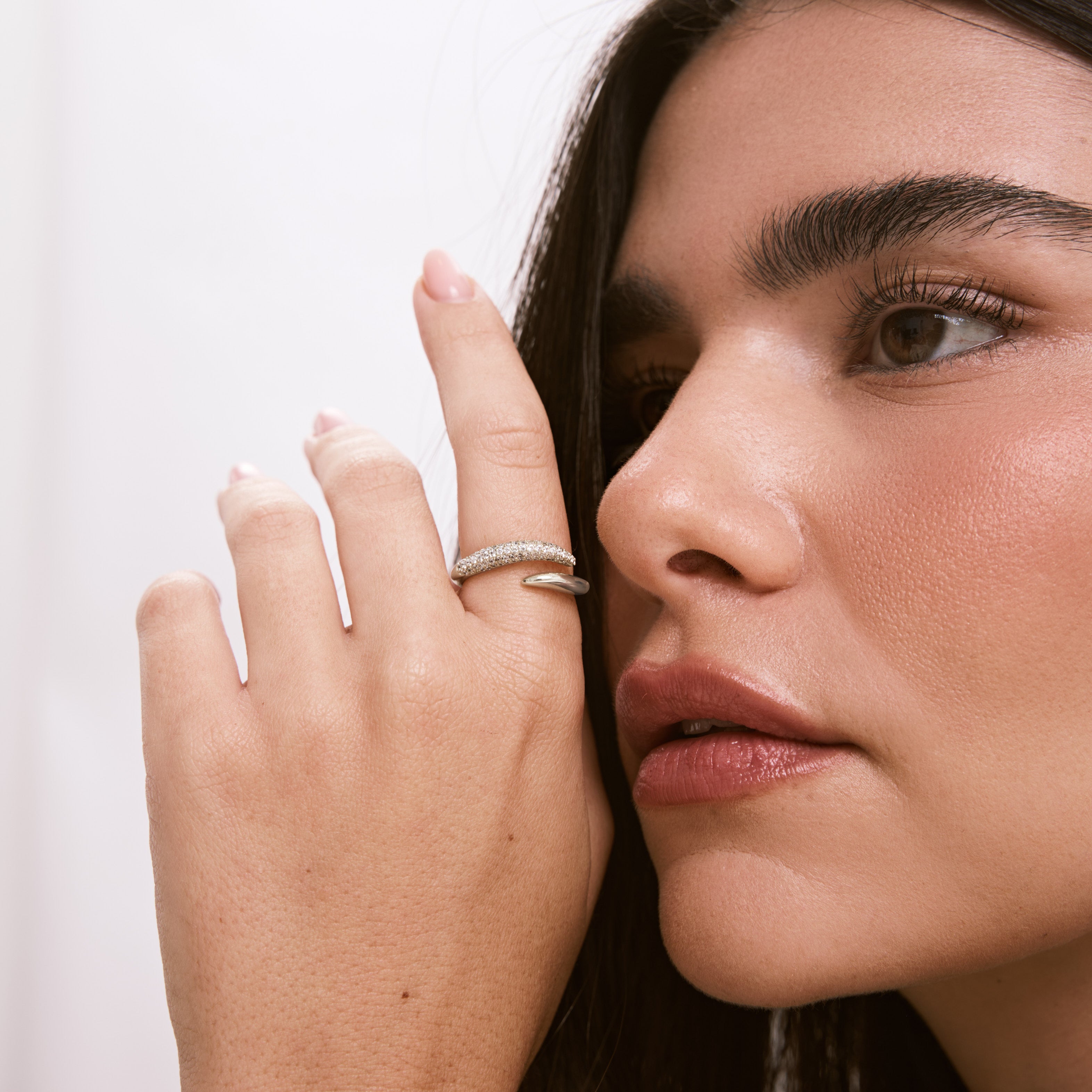 טבעת מתכווננת בעיצוב יוקרתי ואלגנטי, משובצת בזירקונים מנצנצים ללוק על-זמני ומדויק. הטבעת עשויה בעבודת יד ומצופה בכסף טהור.