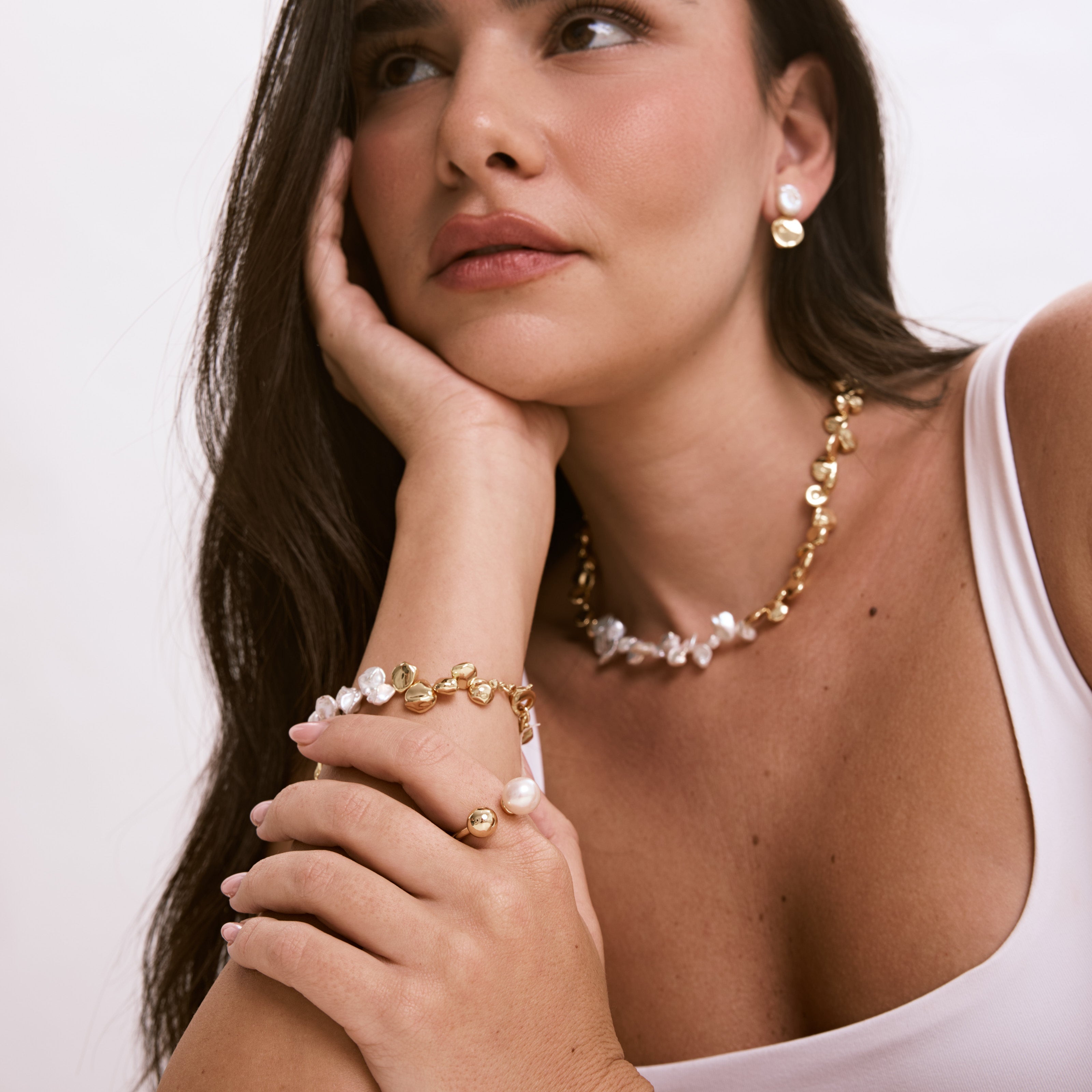 טבעת מתכווננת המשלבת פנינה פראית גדולה ואלמנט מוזהב בעיצוב אורגני ומלא נוכחות. הטבעת עשויה בעבודת יד ומצופה בזהב 14K.